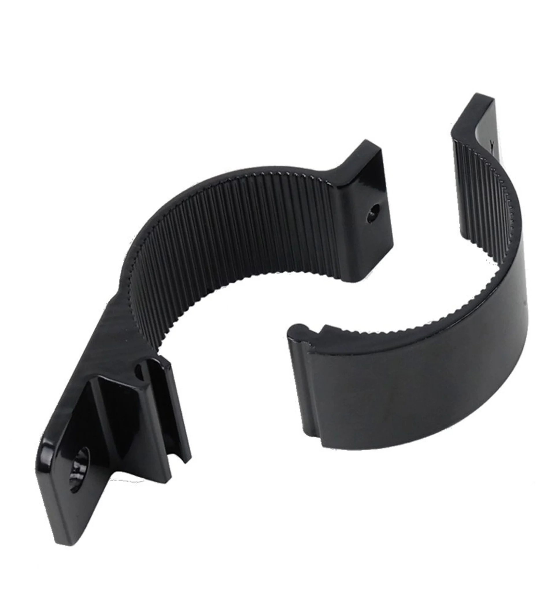 Stabile Ausführung aus 2.8mm dickem Aluminium, Breite 50mm. Für eine einfache und schnelle Montage der Leuchten verfügt die Schelle am einen Ende über eine 10mm Bohrung für die Befestigung des Scheinwerfers und am anderen Ende 2 M6 Gewinde für die Justierung/Fixierung (Schrauben und Gummischutzband im Lieferumfang enthalten).