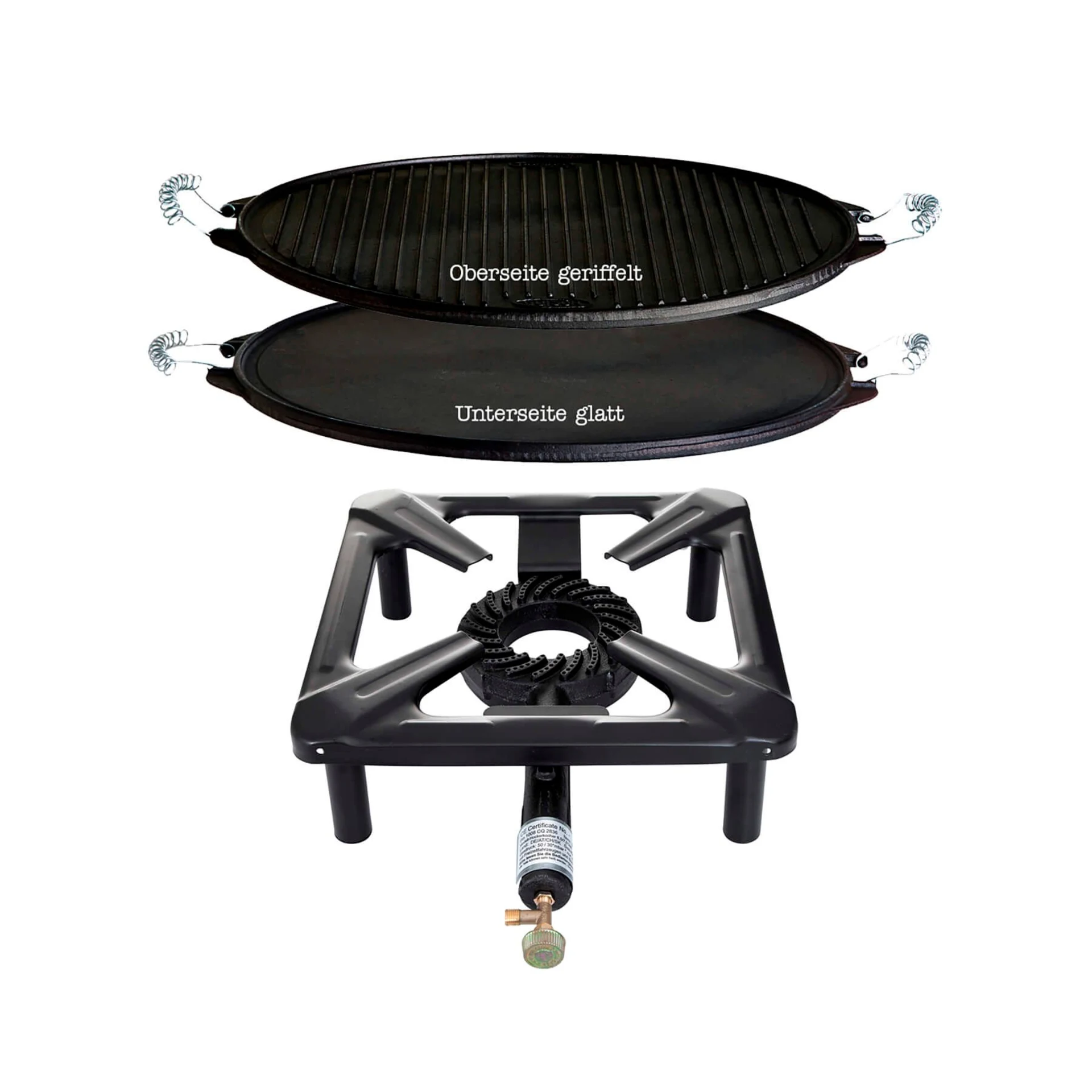 Für alle Geschirre ab einem Durchmesser von 20 cm bestens geeigent (Pfanne, Wok, Topf, Bräter, Grillrost, Kessel). Nur für den Gebrauch im Freien geeignet. 30 mbar sind nur im Freien und in Verbindung mit Freitzeitfahrzeugen und Booten zu verwenden. Die Grillplatte ist aus Gusseisen und damit eine Allround-Platte! Auch ist sie beidseitig verwendbar!