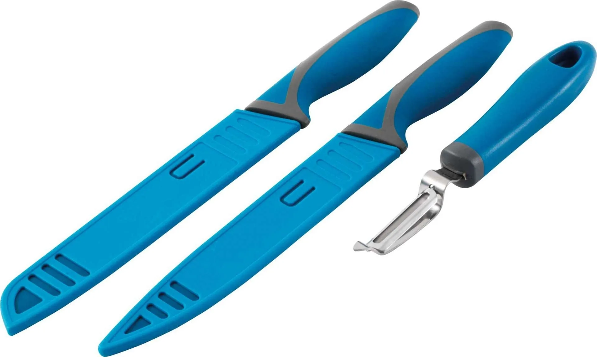 Set aus zwei Messern (mit Antihaftbeschichtung) und einem Schäler, alle mit rutschfesten Griffen und Schutzhüllen. Ideal zum Zubereiten verschiedenster Speisen.
