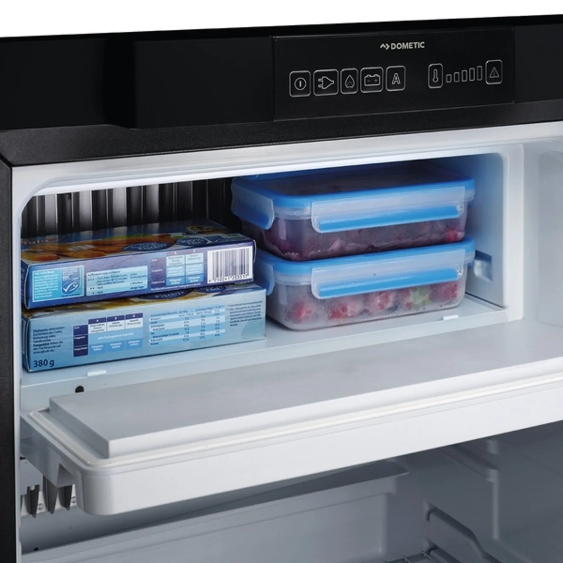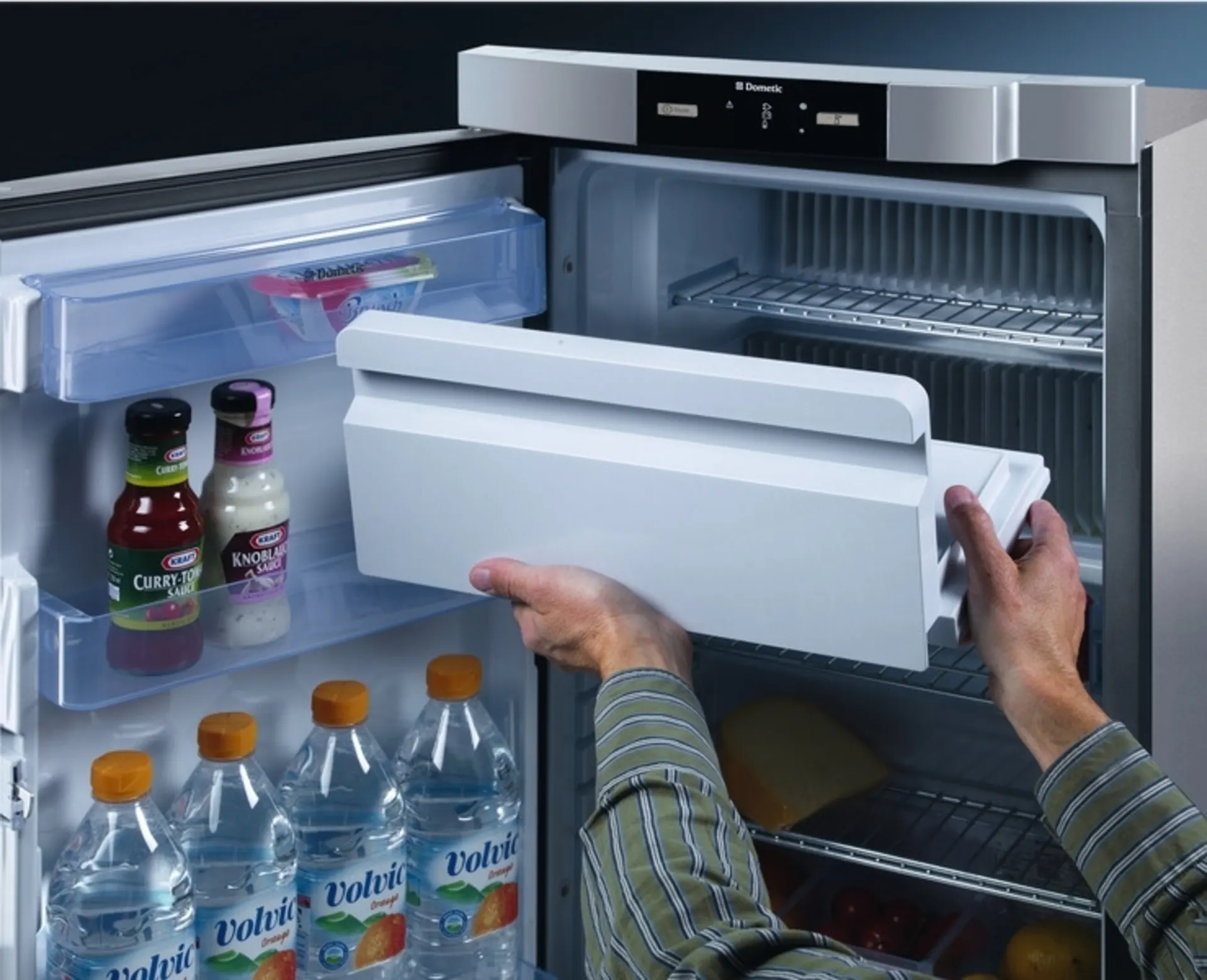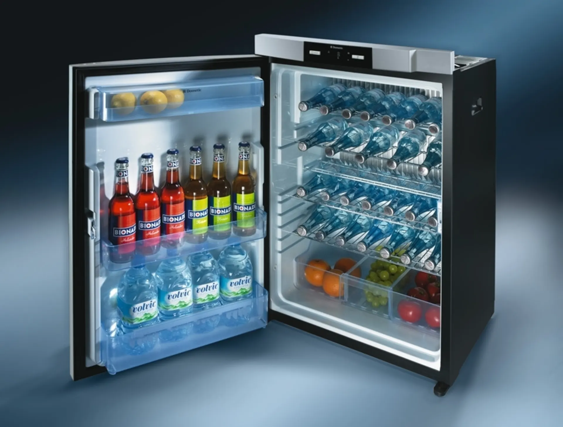 Absorber-Kühlschrank RMS8400, 30mbar, optimiertes Kühlsystem, verbesserte Gehäuseisolation, innovative Mikroprozessor-Technologie, Piezo-Modell mit Batteriezündung, energiesparende LED-Innenbeleuchtung, 80 Liter Inhalt, 5 Liter Frosterfach herausnehmbar durch Clip-System, neuartige Türverriegelung, Gewicht 25kg, Verbrauch 230V/125W, 12V/120W, Gas 18,3g/h. Durch Entnahme des Frosterfaches bis zu 20% weniger Energieverbrauch.