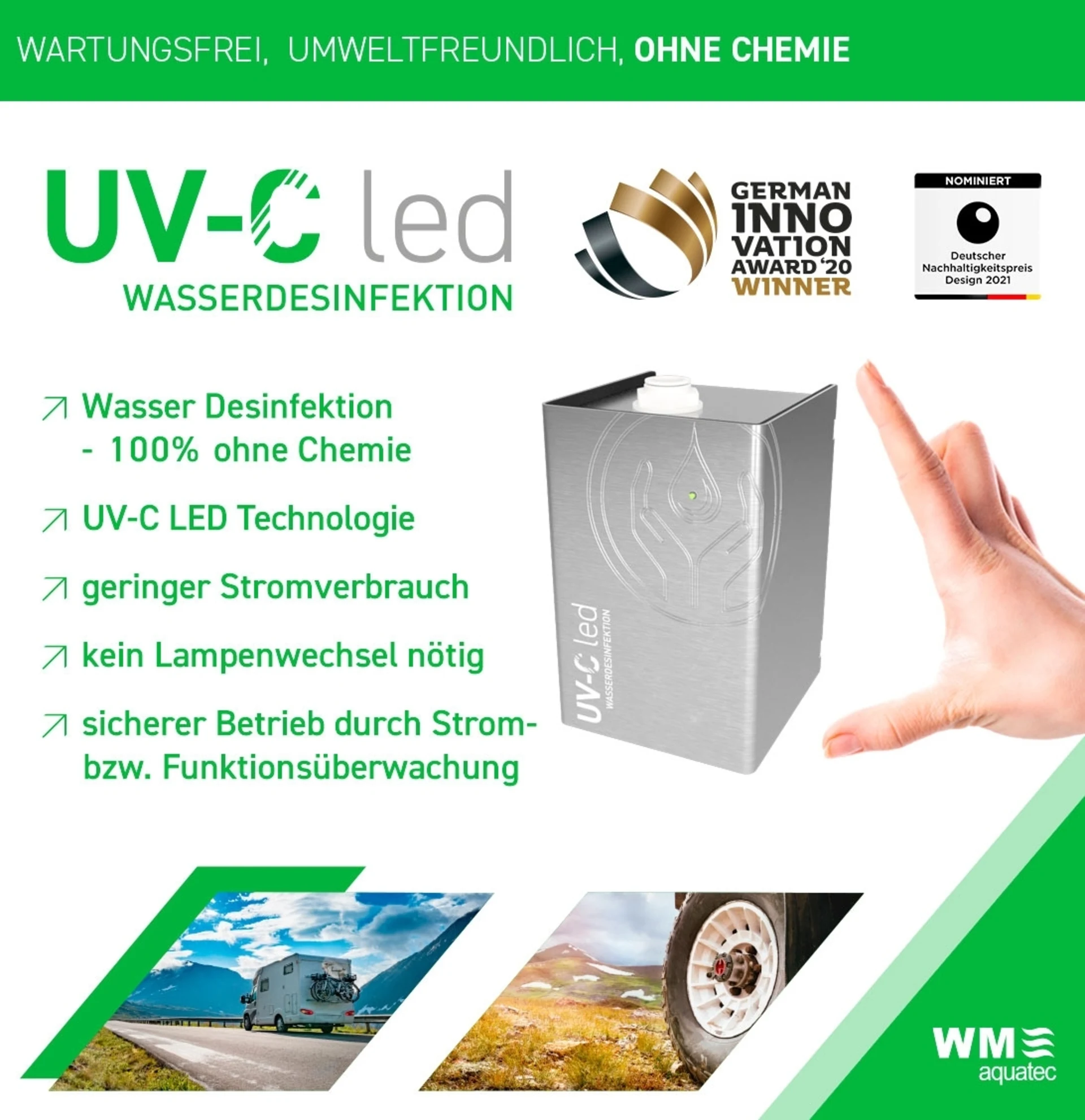 Die UV-Desinfektionsgeräte von WM aquatec besitzen dank innovativer UV-C LED Technologie eine außerordentlich hohe Desinfektionsleistung bei kompaktester Bauweise. Entgegen der bisherigen UV-Technik kommen hier keine umweltgefährlichen, quecksilberhaltigen Gasentladungslampen zum Einsatz, sondern neueste UV-C LED Technologie, die enorme Vorteile mit sich bringt.