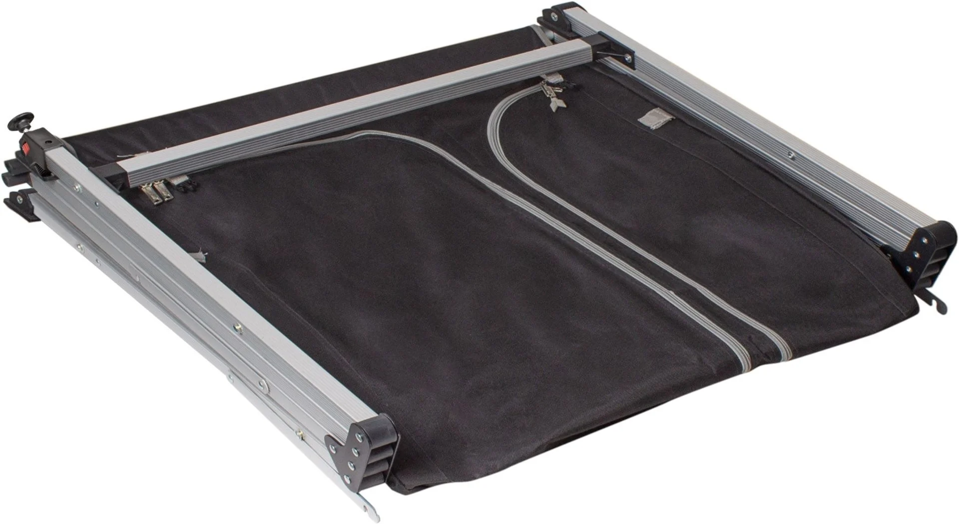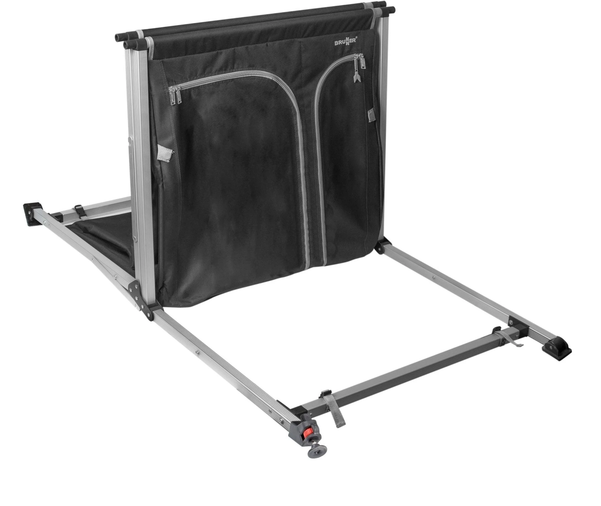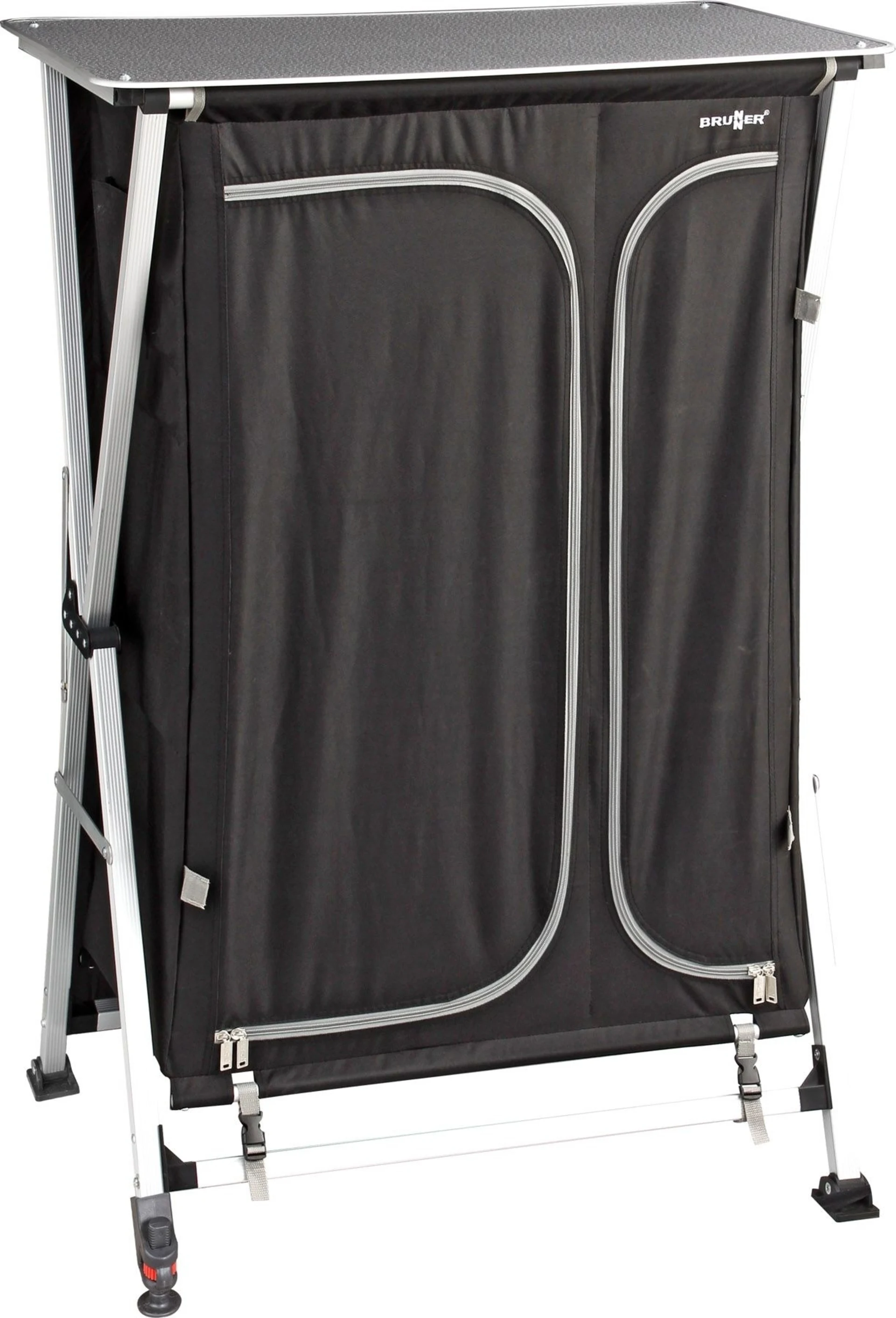 Sehr stabile Ausführung mit Alu-Kreuzgestell und verwindungssteifen Rechteckprofilen. Vorder- und Hinterwand können durch eine spezielle Spannvorrichtung zusätzlich gespannt und stabilisiert werden. Breite, schwenkbare Fußplatten verhindern das Einsinken des Schranks auf weichen Böden oder verhindern mögliche Beschädigungen an Zeltboden oder -teppich. Ein höhenverstellbarer Fuß erlaubt einen perfekten Niveauausgleich bei Bodenunebenheiten. Ein Gazefenster in der Rückwand sorgt für die Innenbelüftung des Schrankes. Einfacher, schneller Auf- und Abbau.