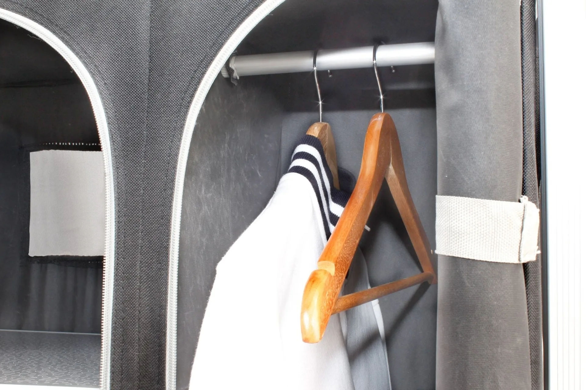 Großer Camping-Multifunktionsschrank mit 2 getrennten RV-Fächern mit insgesamt 6 innenliegenden Ablagen. Das etwas schmälere Fach kann zudem dank mittig teilbarer Ablagen und einer eingebauten Hängestange zum Kleiderschrank für Jacken und Hosen umgebaut werden.