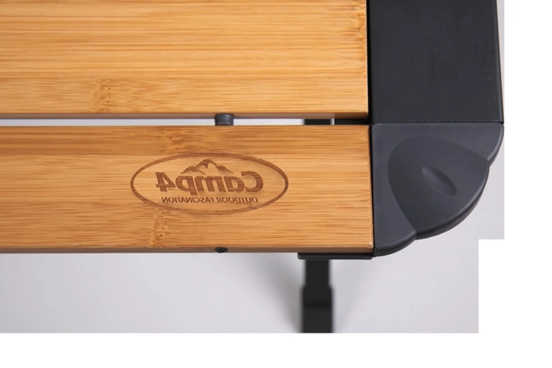 Bambus-Rolltisch Mendoza 110 mit praktischem Aufbewahrungsnetz hat ein kleines Packmaß und ist ideal für Minicamper und Vans. Die Tischplatte ist aus Bambusholz, das Gestell aus dunkelgrauem Aluminium.