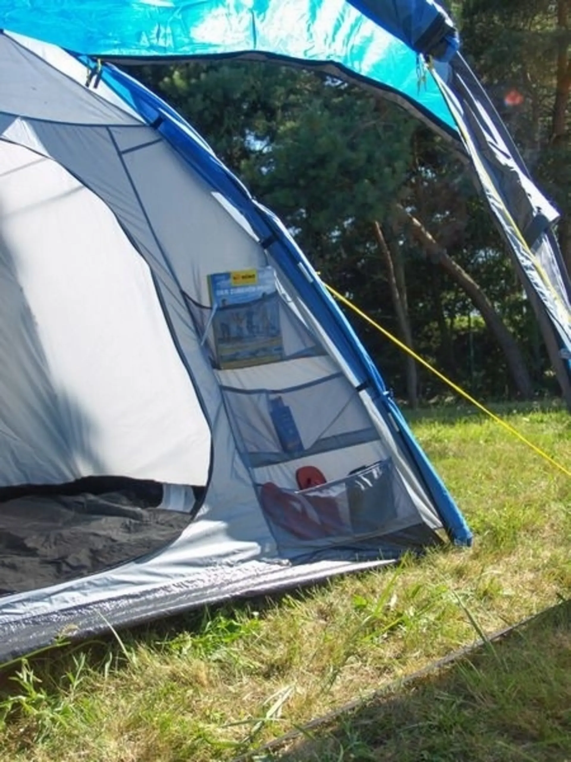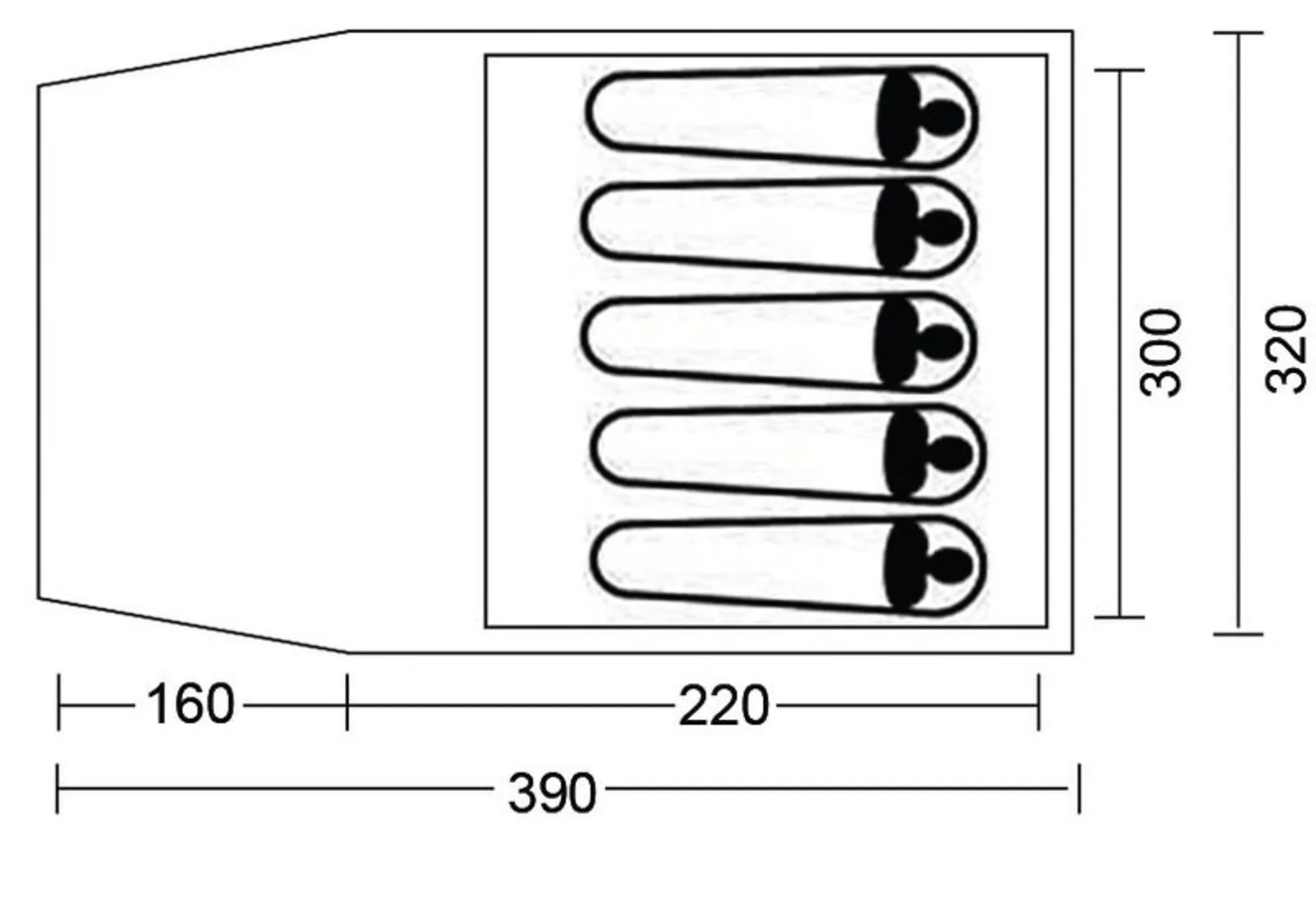 Kuppelzelt mit grossem Vorraum und Schlafkabine für 5 Personen. Das Zelt eignet sich besonders für die grosse Familie oder für Gruppen. Stehhöhe 190 cm. Staufächer an der Schlafkabine für die Kleinutensilien. Innenzelt kann auch ohne Aussenzelt aufgestellt werden, da das Gestänge innenliegend ist, ideal für sehr warme Sommernächte. Aussenzelt verfügt über 2 Klarsichtfolienfenster.