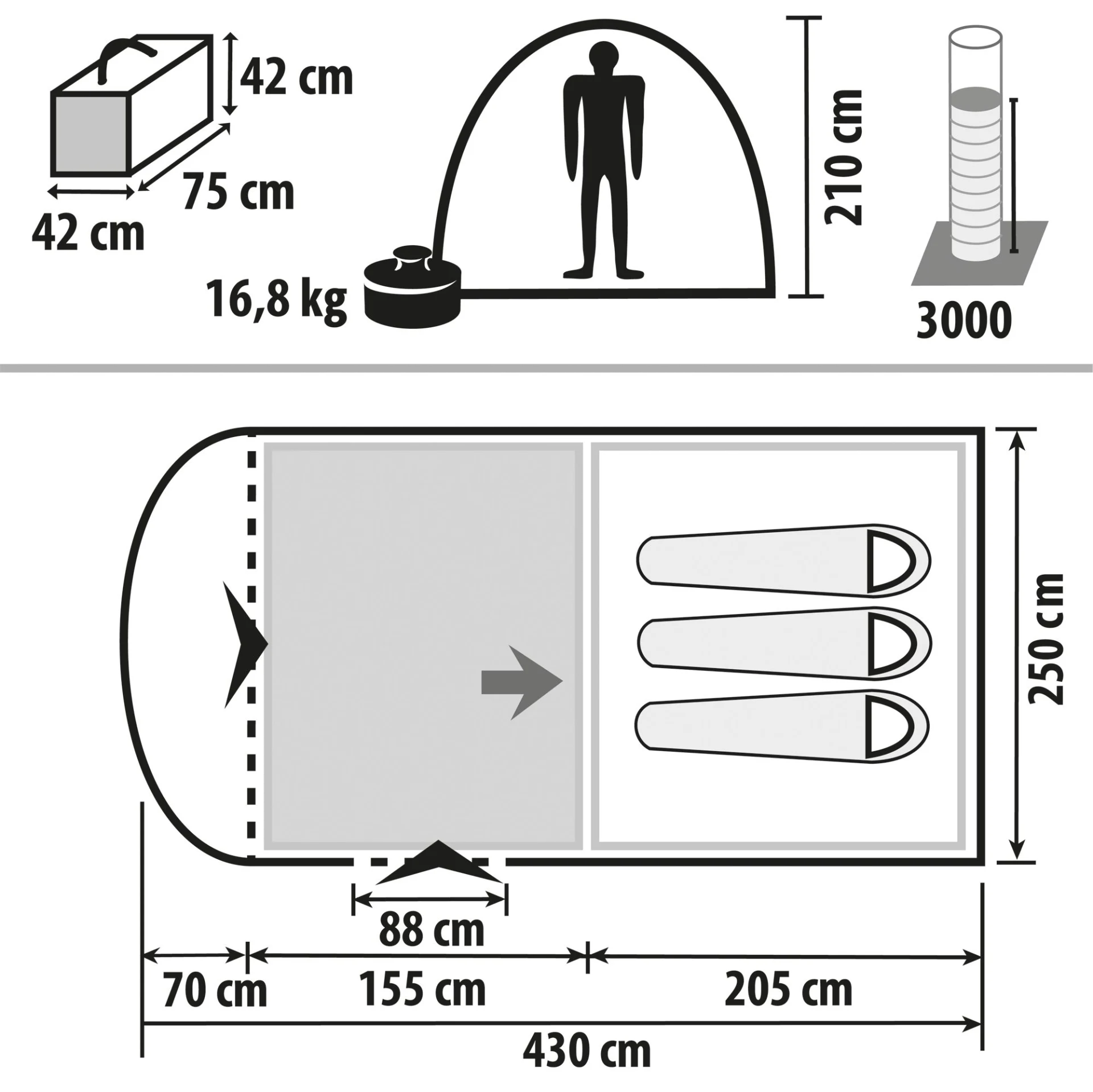 | Lieferumfang | Außenzelt, Schlafkabine, Gestänge, Luftpumpe, Abspannmaterial und Packtasche (100 % Polyester) |