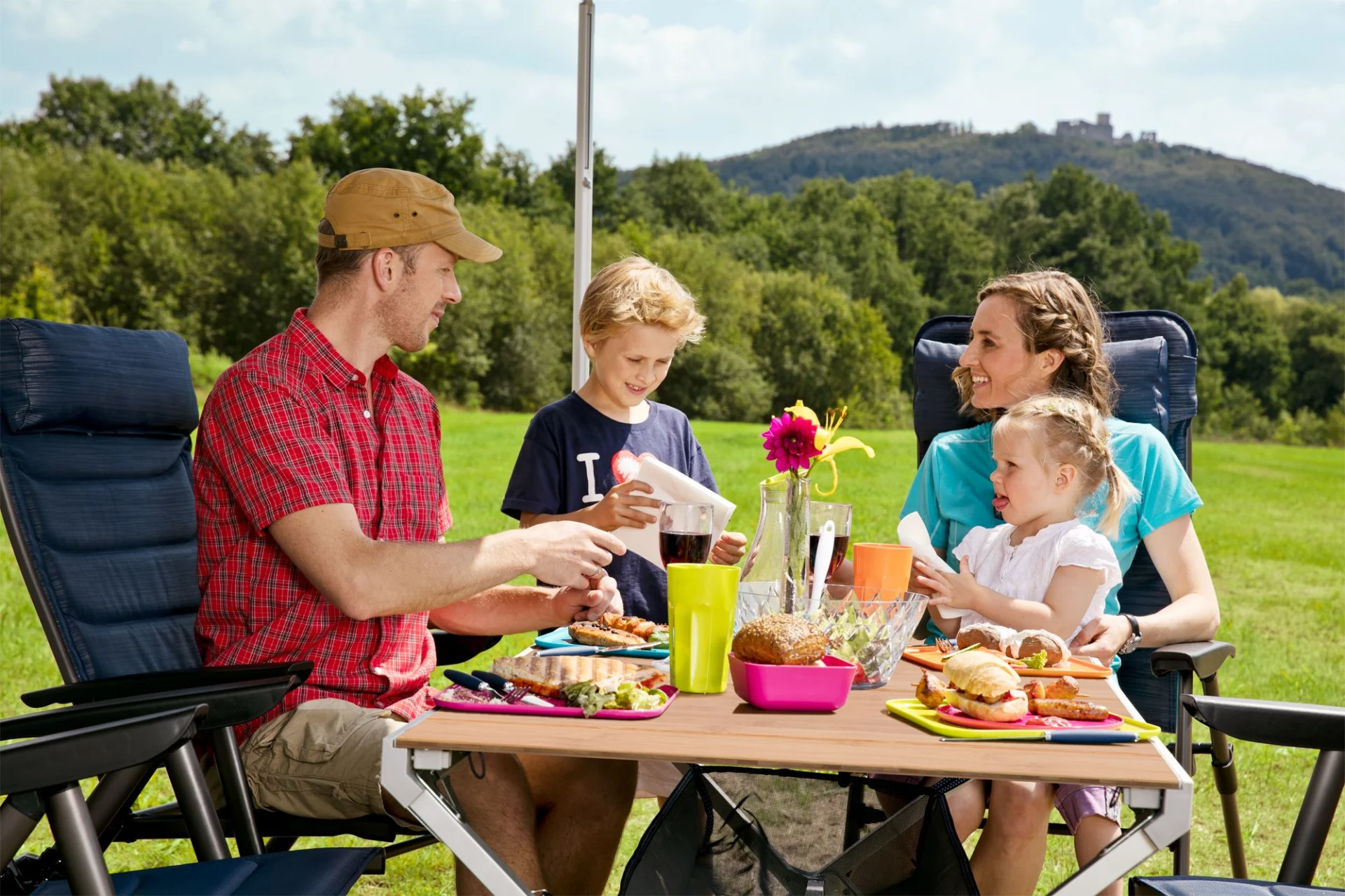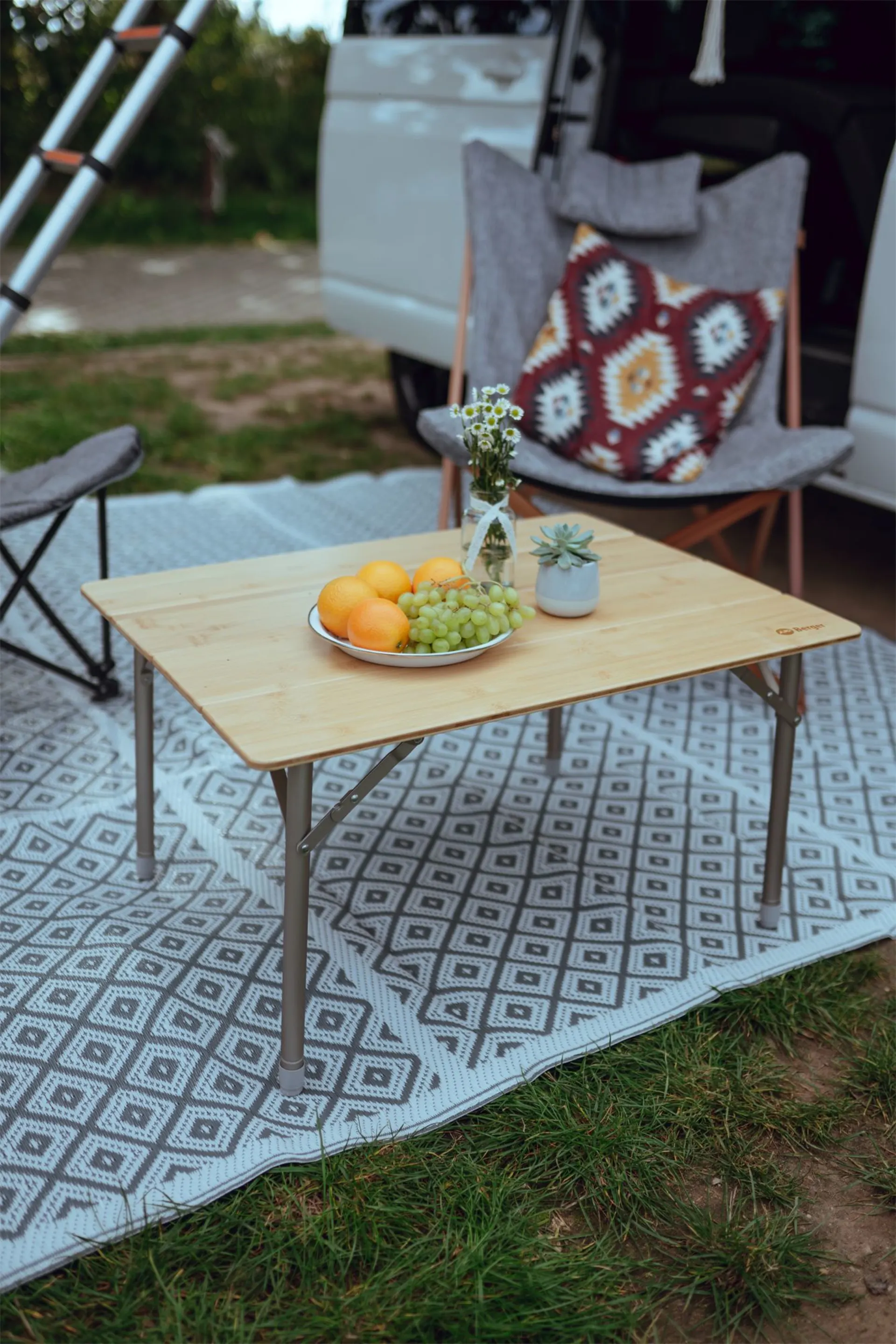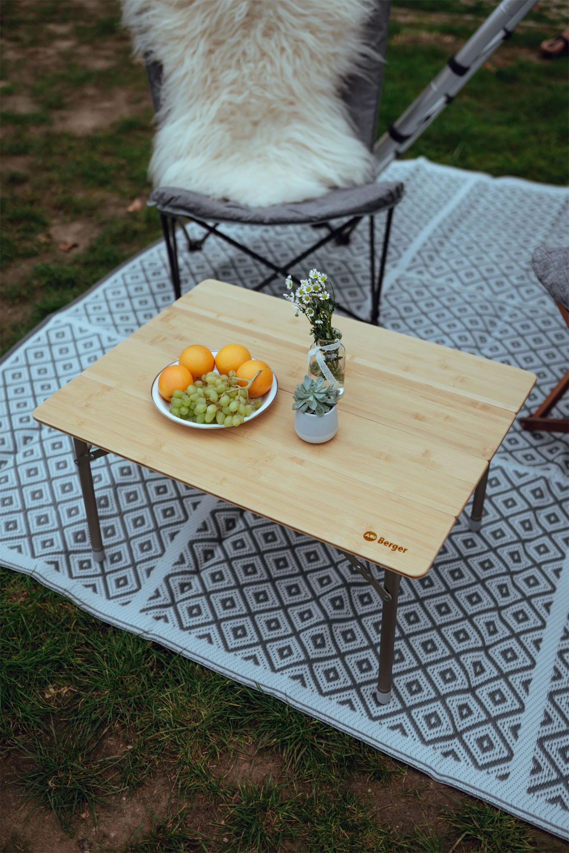 Der Berger Carry Falttisch ist ein stabiler Tisch mit Aluminiumgestänge. Durch die viergeteilte Bambustischplatte lässt sich der Tisch extrem platzsparend zusammenfalten und verstauen. Die Beine sind stufenlos höhenverstellbar von 42 - 65 Zentimetern.
