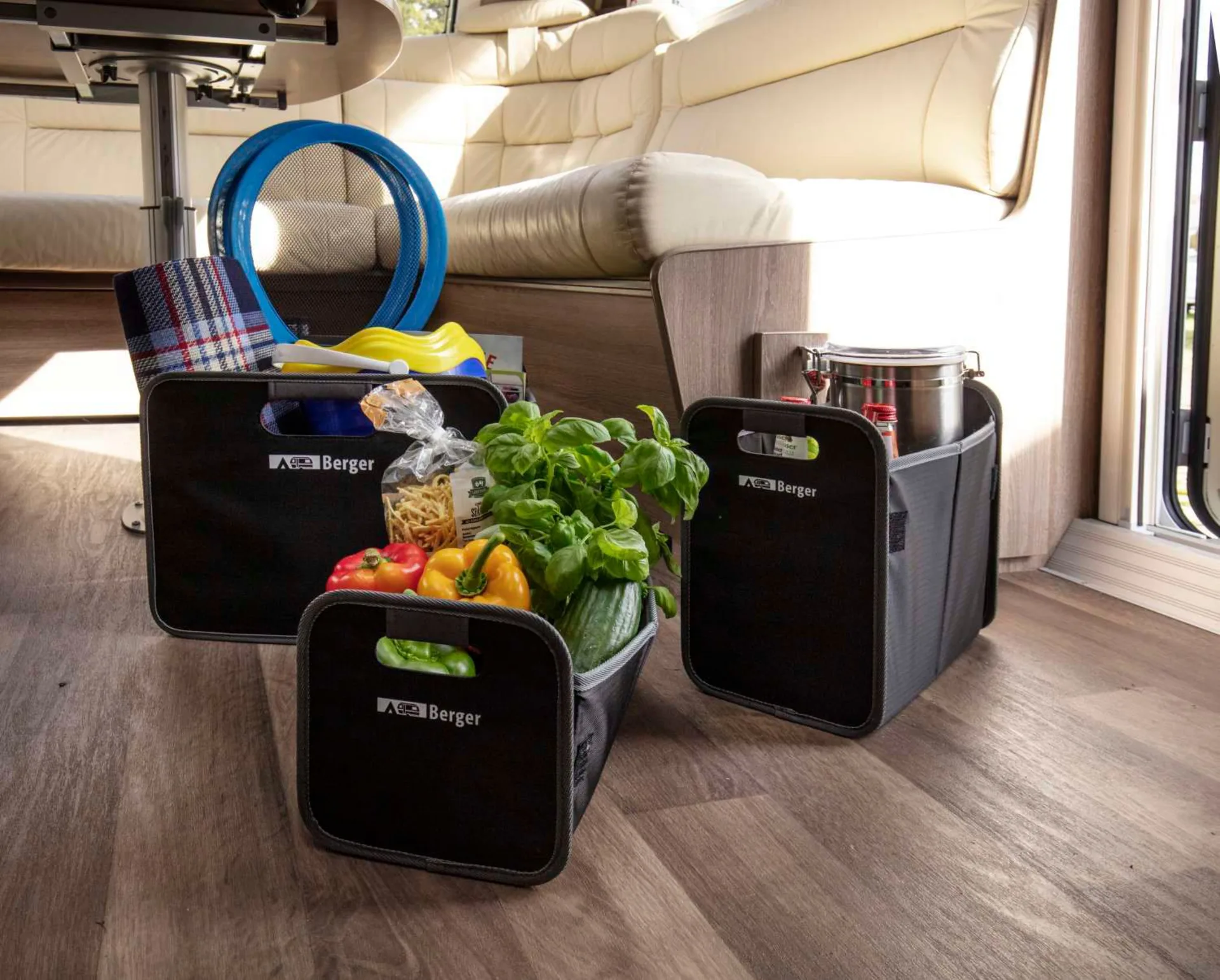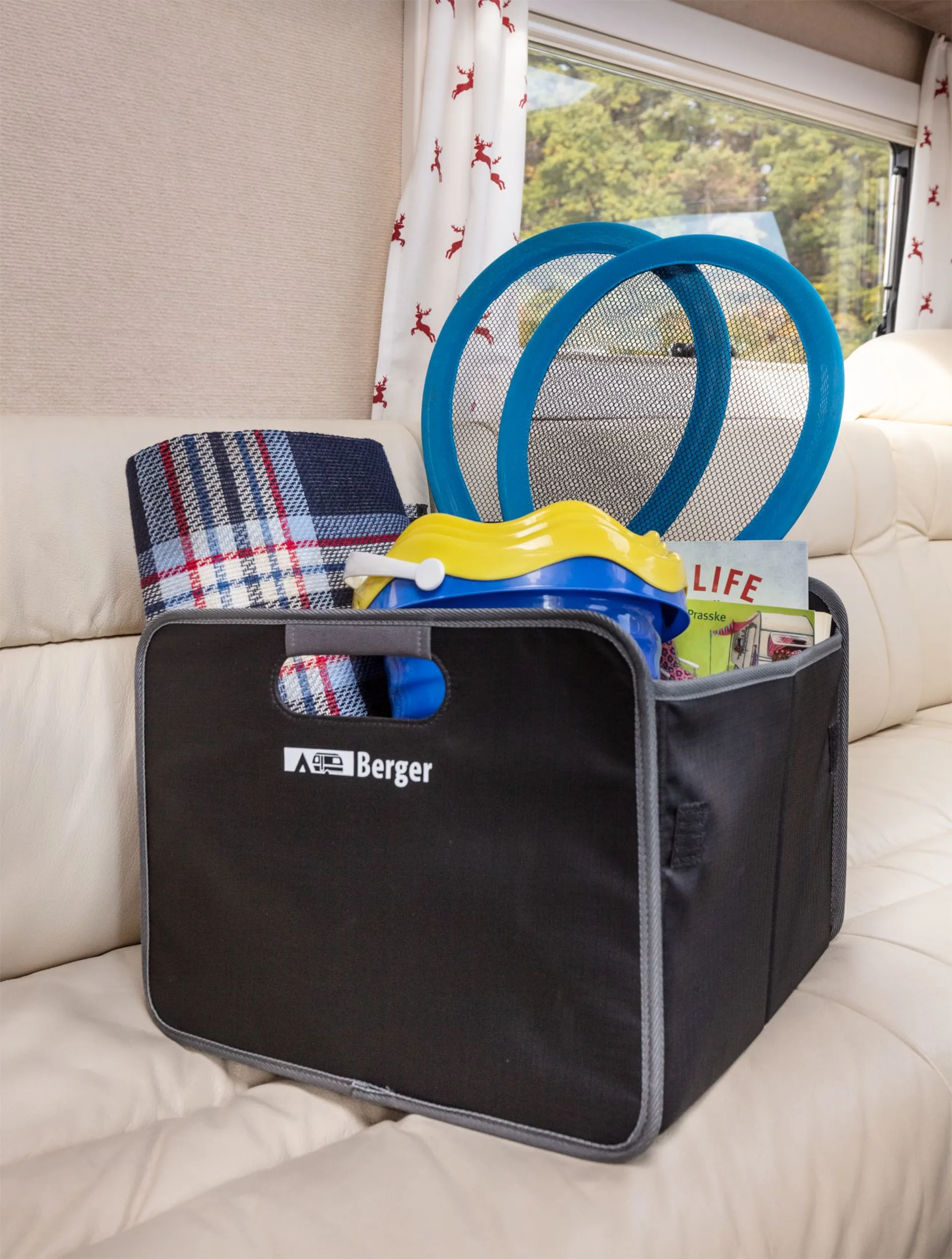 Die Berger Faltbox Culina ist schnell aufgefaltet und passt perfekt in deinen Camping-Haushalt. Egal ob Verstauen, Transportieren oder Organisieren, mit der stabilen Faltbox Culina gelingt dir Ordnung im Handumdrehen. Eine zeitgemäße Stauraumlösung, vielseitig und stilsicher. Sie ist extrem belastbar, langlebig und durch das hochwertige Polyestergewebe ist sie reißfest, wasserabweisend und leicht zu reinigen.
