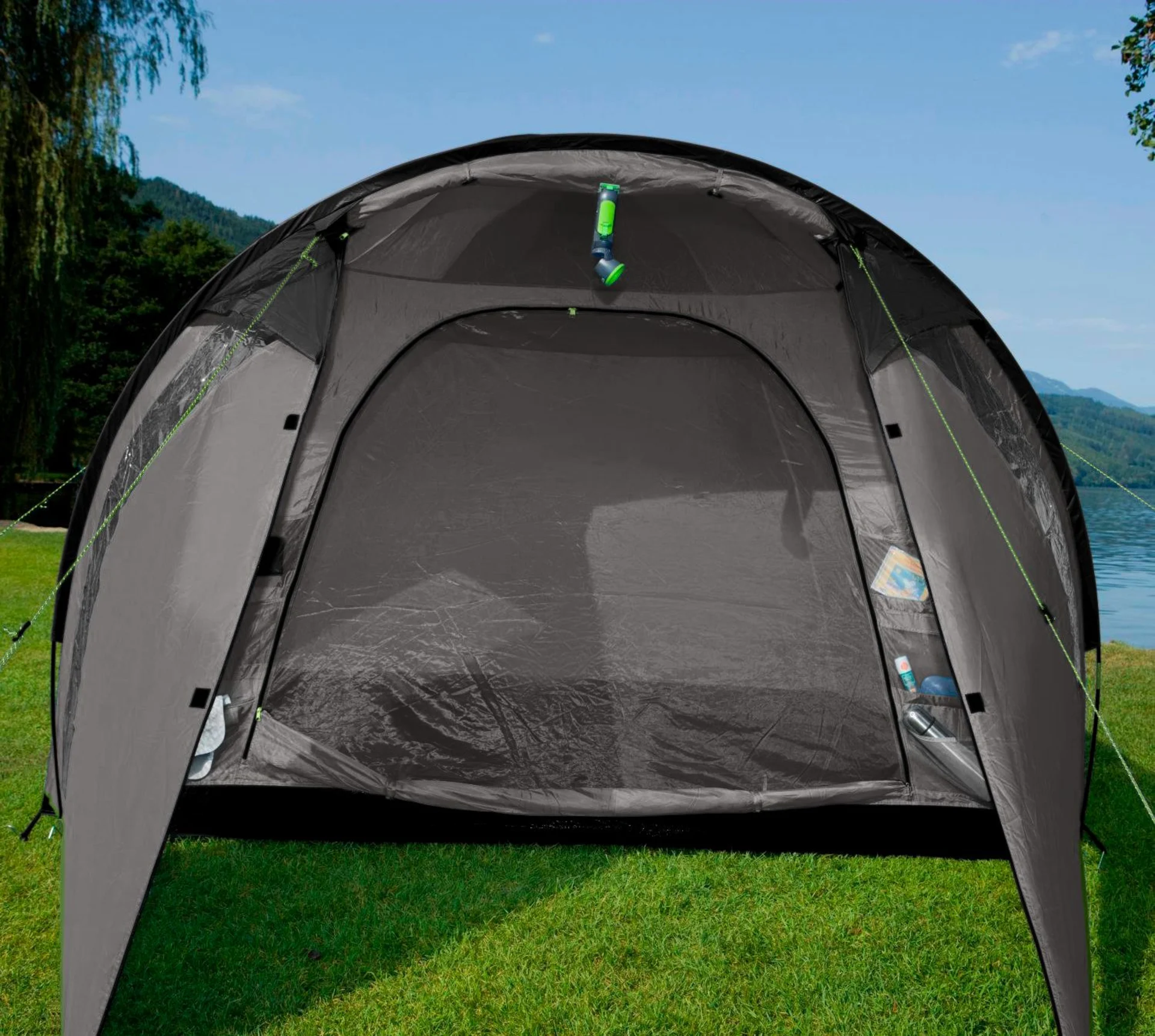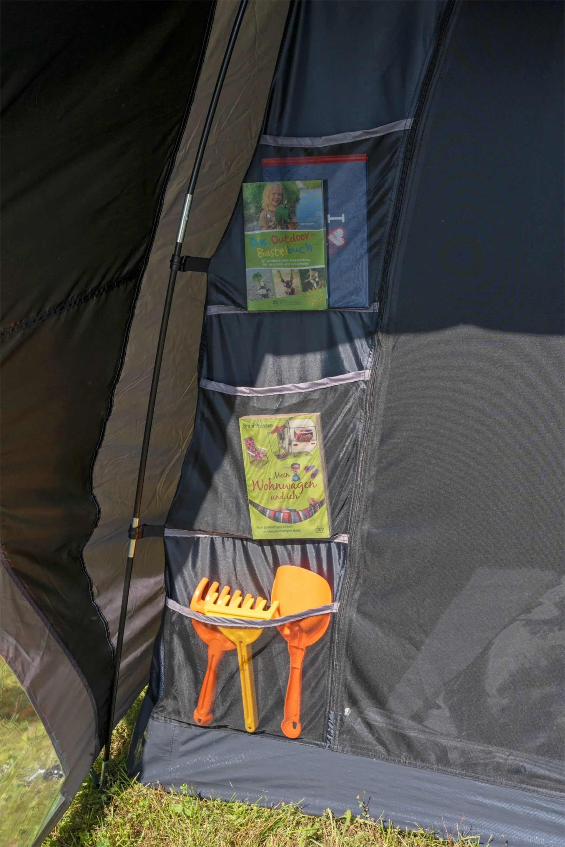 Ein integrierter Organizer bietet Stauraum für kleine Utensilien und sorgt für Ordnung im Innenraum. Reflektierende Abspannleinen erhöhen die Sichtbarkeit bei Dunkelheit und tragen zur Sicherheit bei. Das kompakte Packmaß ermöglicht eine mühelose Verstauung im Rucksack oder Auto.