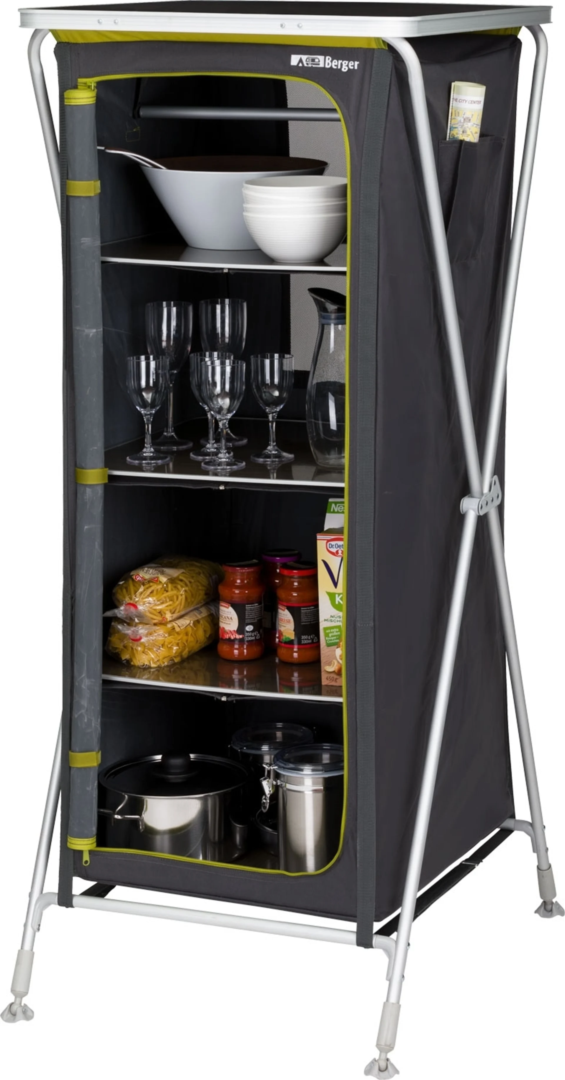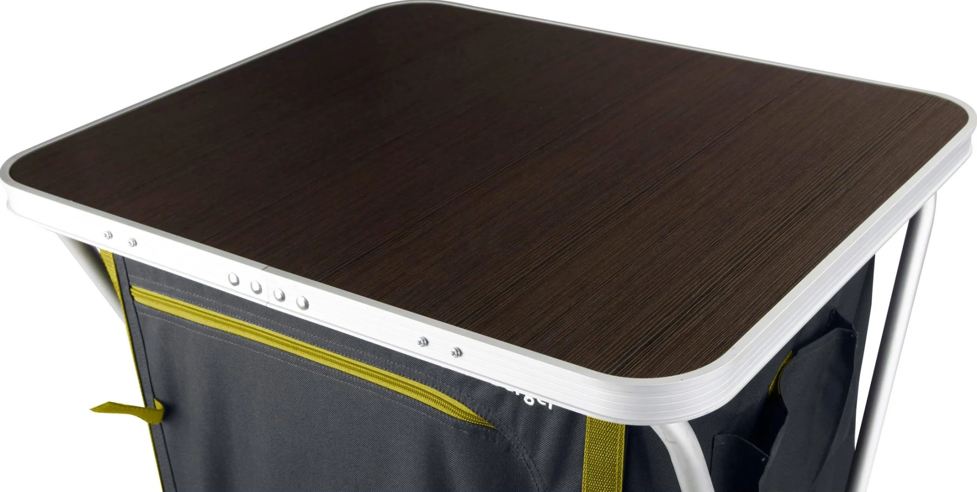 Die Ablagefächer können durch den integrierten Reißverschluss geöffnet werden, damit auch größere Gegenstände (z.B. die Gasflasche bei den Küchenboxen) verstaut werden können. Die Küchenboxen haben eine praktische Arbeitsplatte mit einer abwischbaren Folienbeschichtung.