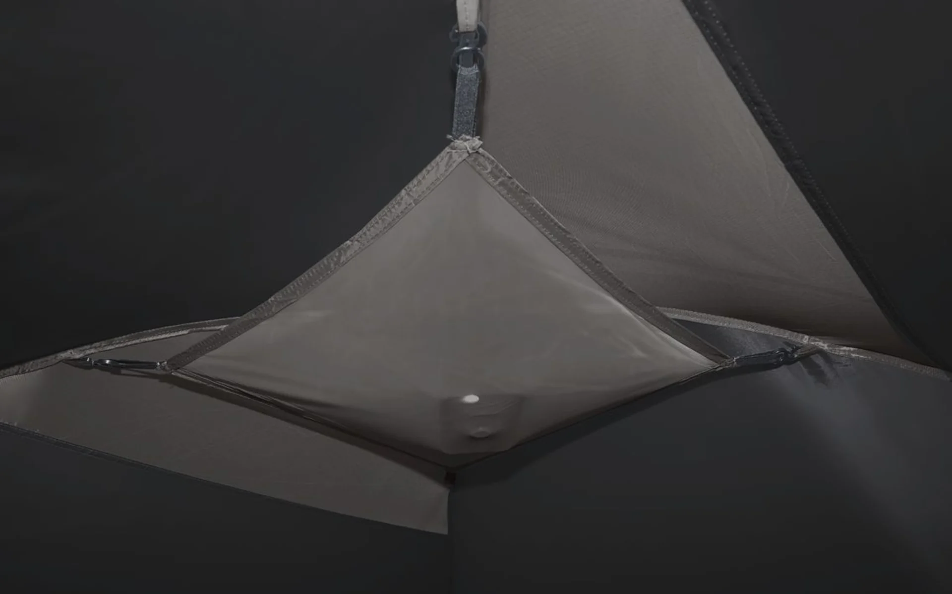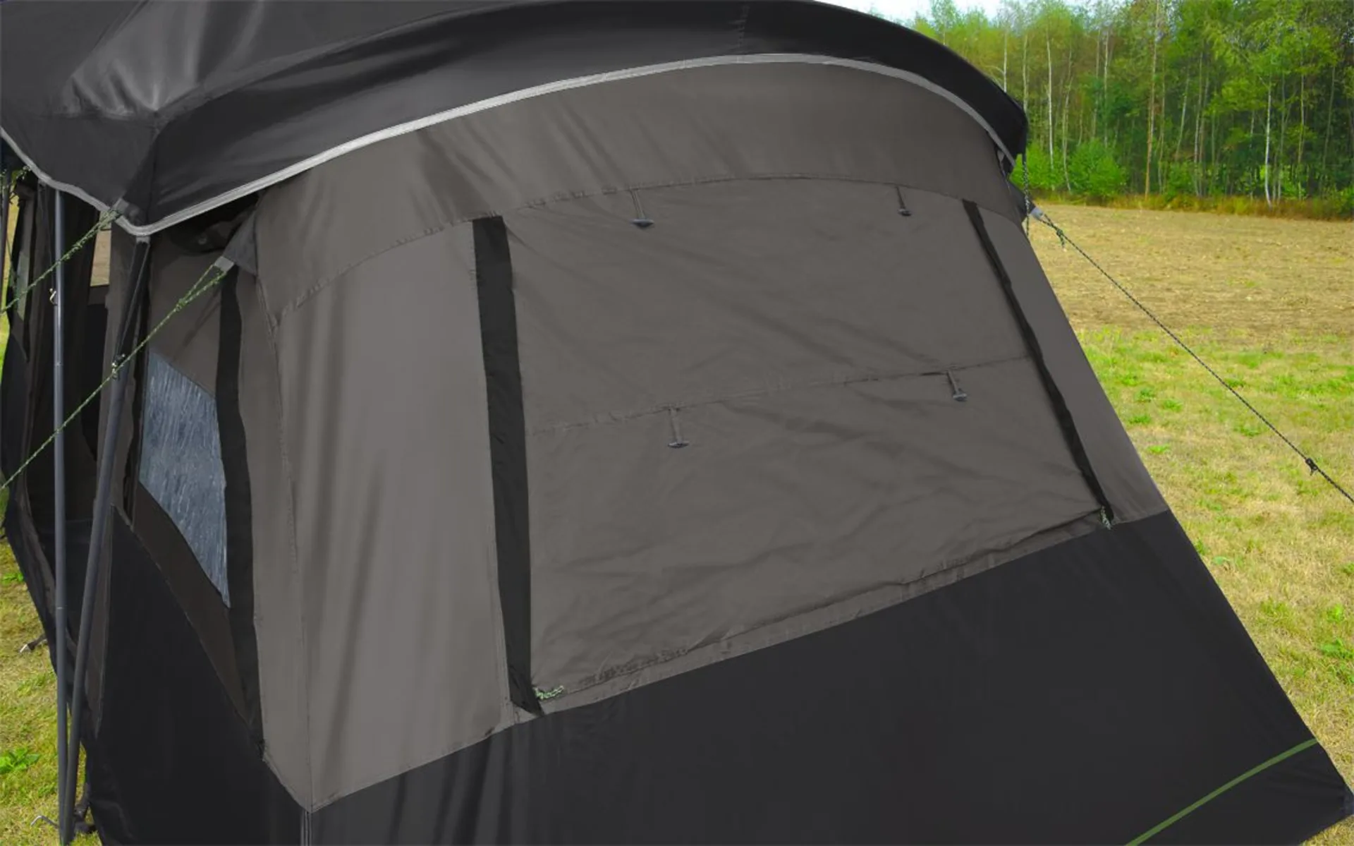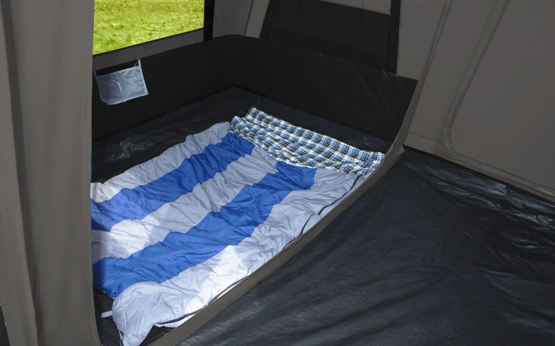 Zwei einhängbare Schlafkabinen mit Moskitogaze-Tür können bei Bedarf entfernt werden, um den Wohnraum zu vergrößern. Eine Lampenaufhängung in der Mitte sorgt für zusätzlichen Komfort. Die Türen der Schlafkabine können blickdicht verschlossen werden und der geräumige Aufenthaltsraum ist ideal für regnerische Tage und lädt zum Verweilen ein.