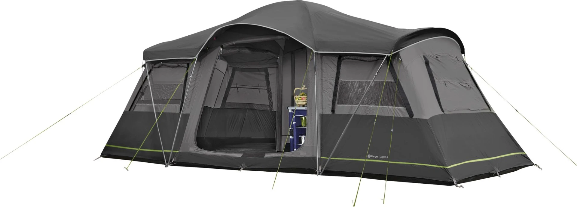 Das Berger Lagoon 4 bietet Platz für bis zu vier Personen und besteht aus hochwertigem Ripstop-Polyester. Zwei gegenüberliegende Eingänge lassen sich als Sonnendach ausstellen und sorgen für eine gute Belüftung. Aufgrund des praktischen Faltgestänges wird der Aufbau vereinfacht. Der fest eingenähte Zeltboden schützt vor Schmutz, Nässe und ungebetenen Tieren. Sechs Fenster (50 % Moskitogaze, 50 % Klarsichtfolie) bieten ausreichend Licht und Belüftung für eine angenehme Atmosphäre.