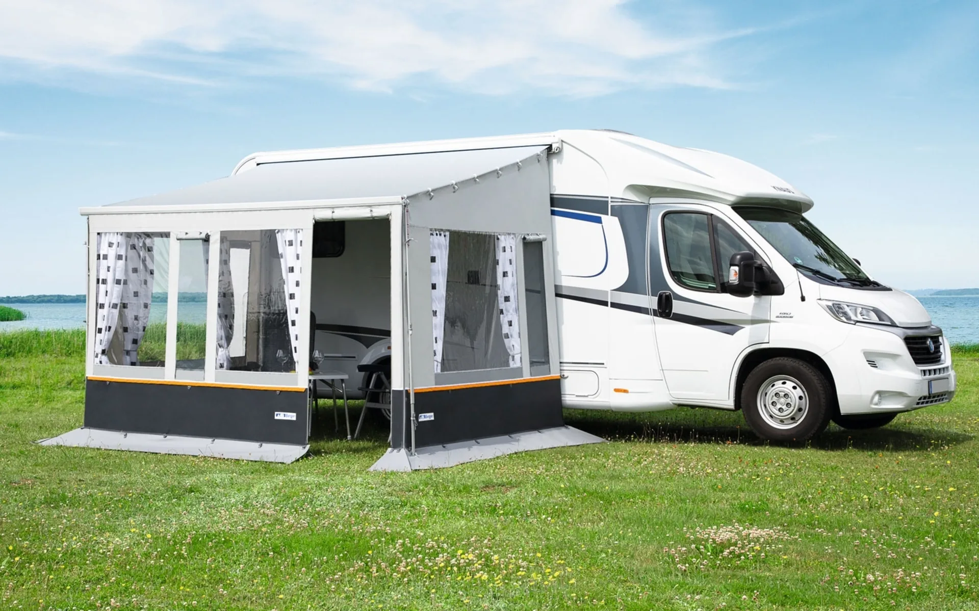 Die Vorderwand für das Markisenzelt ist für eine Markisenbreite 300 und 400 cm ausgelegt. Für die übrigen Breiten kann die Vorderwand durch das Verbreiterungselement passend erweitert werden. Passend für die Markisen Thule Serie 5 und Fiamma F45.