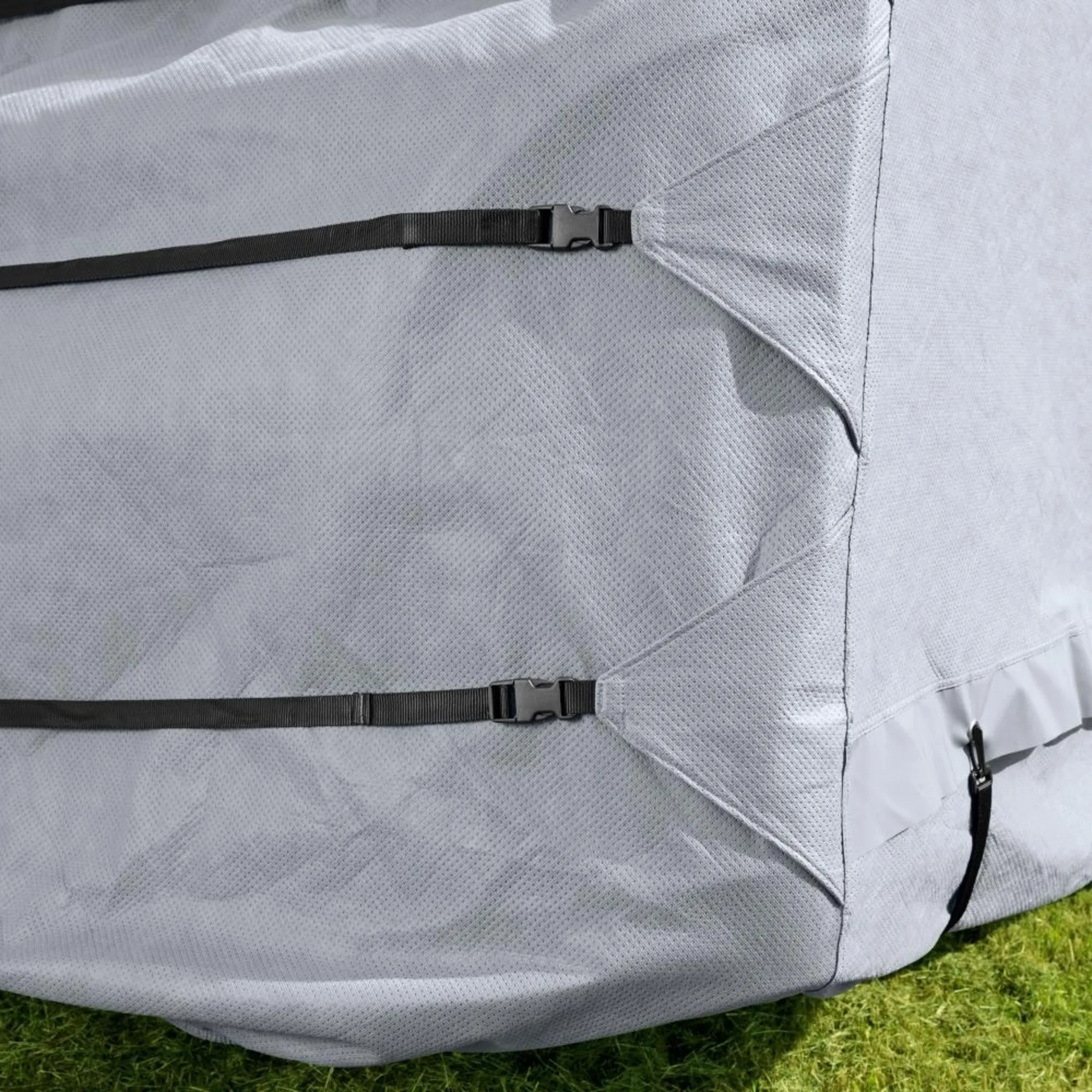 Der Rundum-Schutz für den Wohnwagen besteht aus atmungsaktivem, UV-stabilem, leichtem und reißfestem 3-lagigem SFS-Non-Woven-Polypropylen-Material. Die verarbeiteten YKK-Reißverschlüsse ermöglichen einen einwandfreien Zugang zum Fahrzeug. Alle Schutzhüllen sind mit Laschen und Ösenleisten zum Abspannen ausgestattet, um optimalen Halt zu gewährleisten.