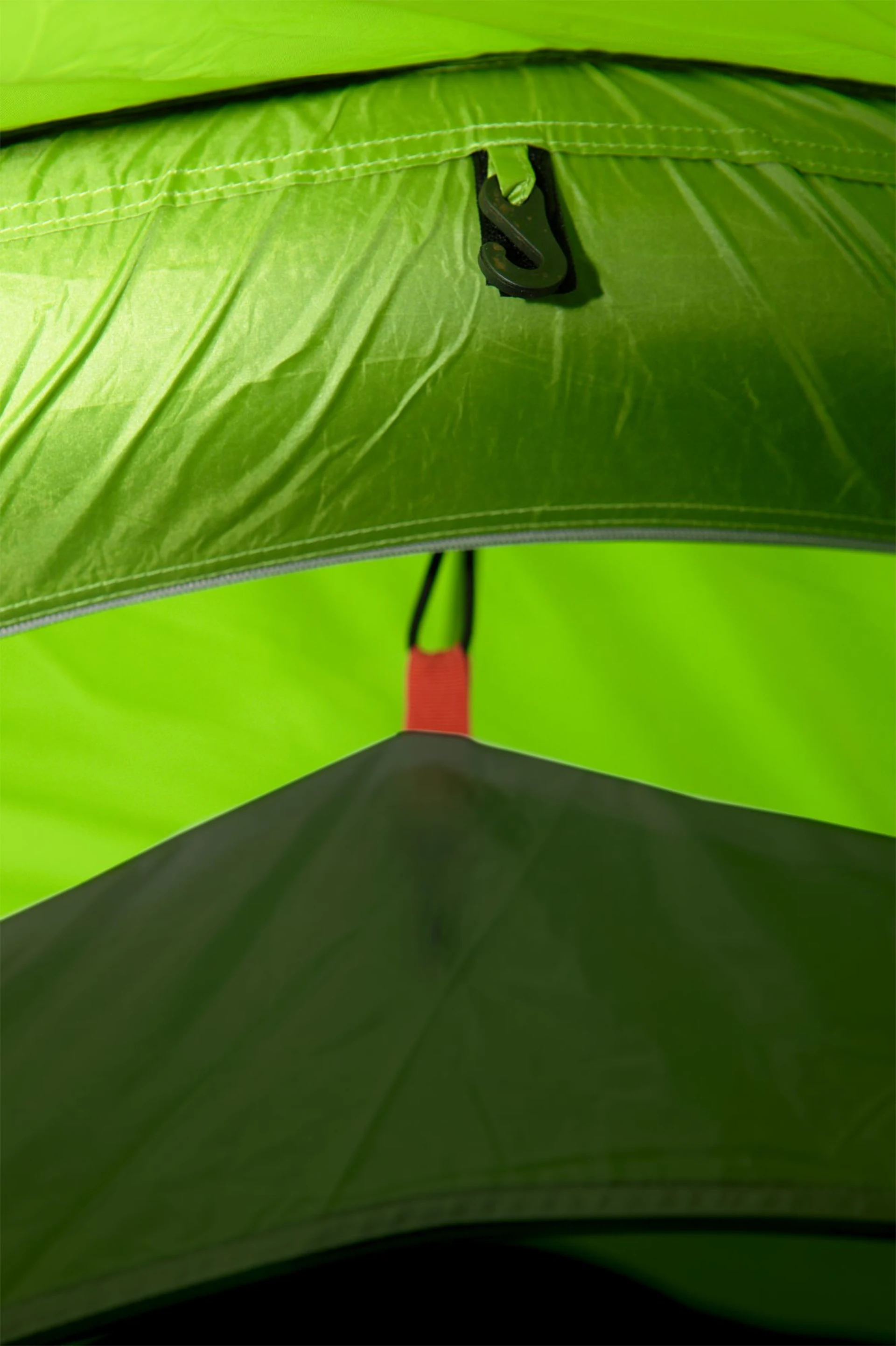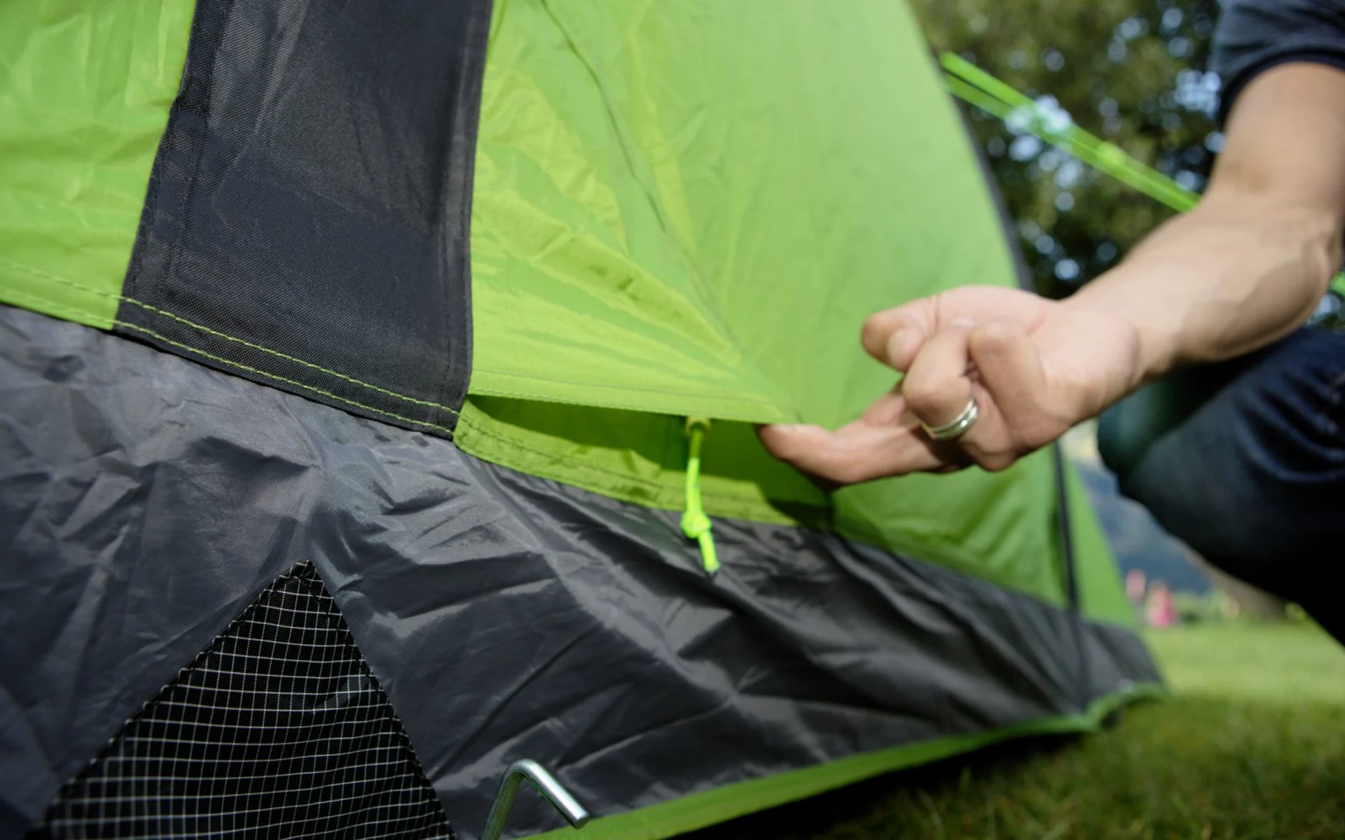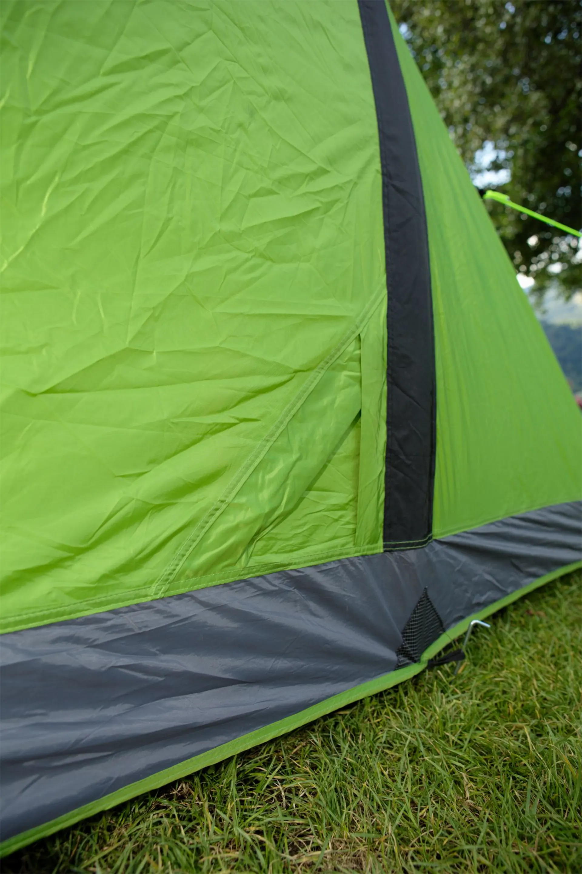 Material: Außenzelt: 100% Polyester (190T), Polyurethan beschichtet. Schlafkabine: 110% polyester (atmungsaktiv), Schlafkabinenboden: 100% Polyethylen (wasserdicht). Zeltboden: 100% Polyethylen (wasserdicht).