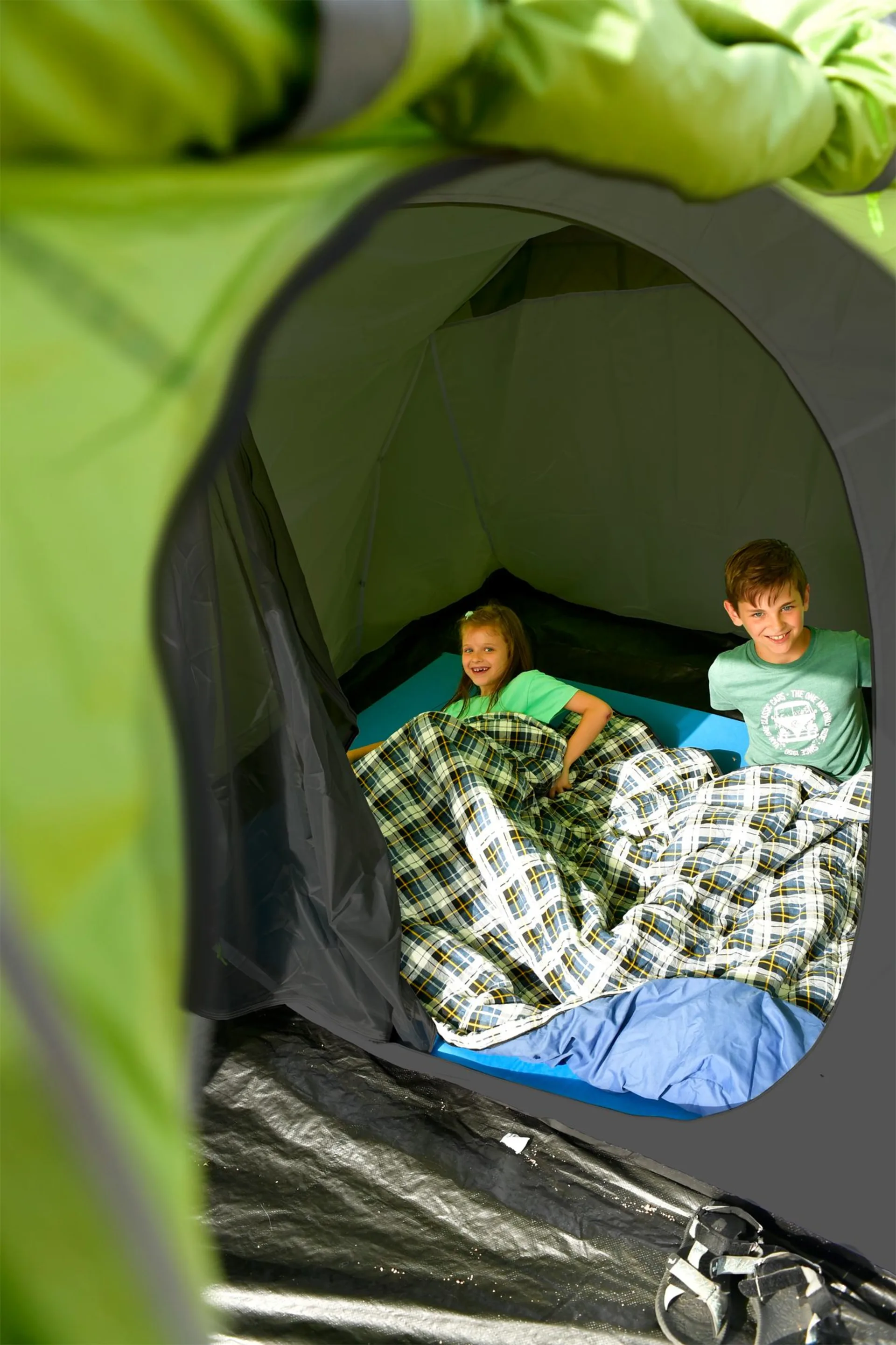 Lieferumfang: Außenzelt, Schlafkabine, Gestänge (Fiberglas oder Luftschläuche inkl. Luftpumpe), 2 Stahlaufstellstangen, Abspannmaterial und Packsack (100% Polyester).