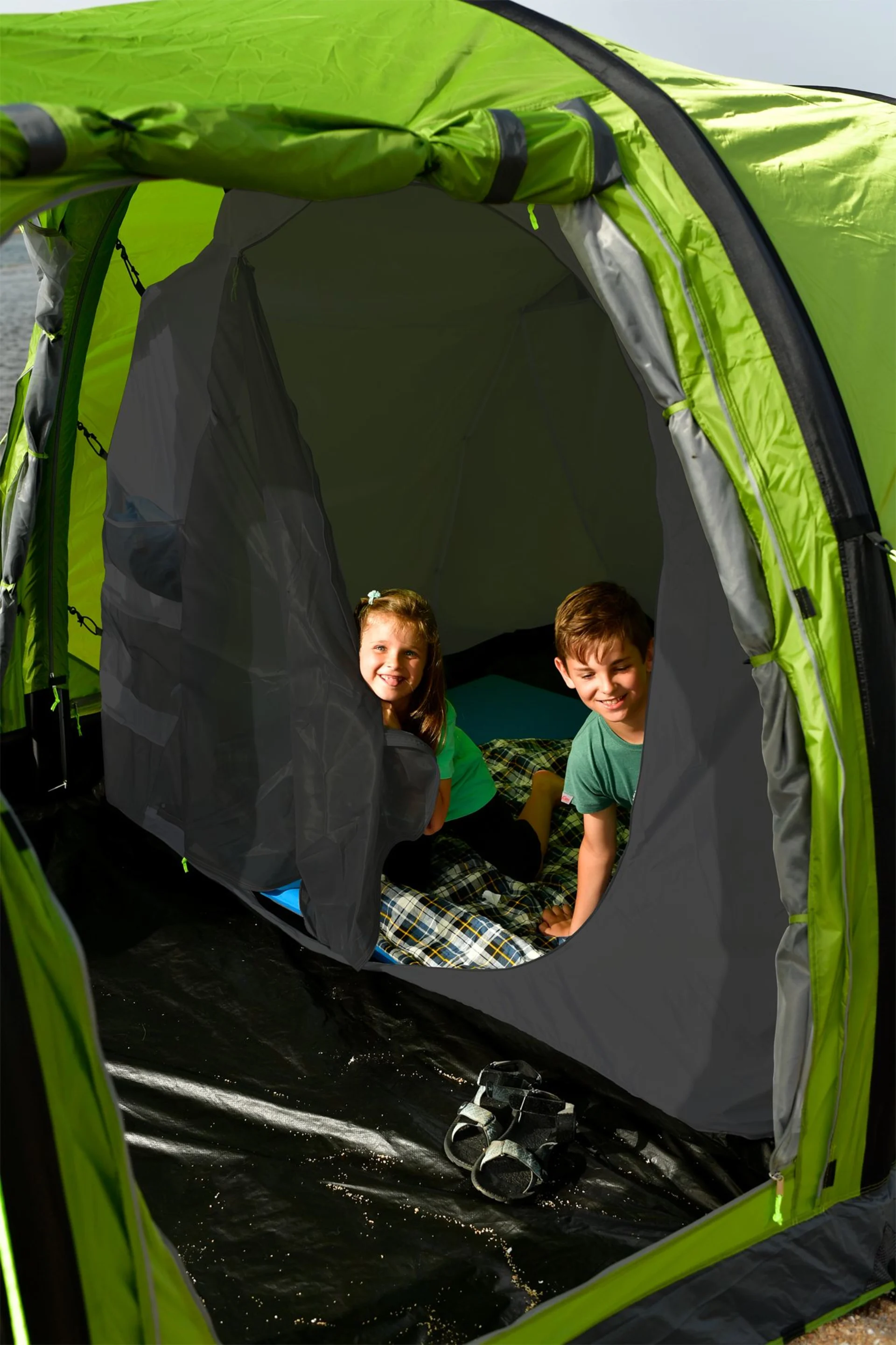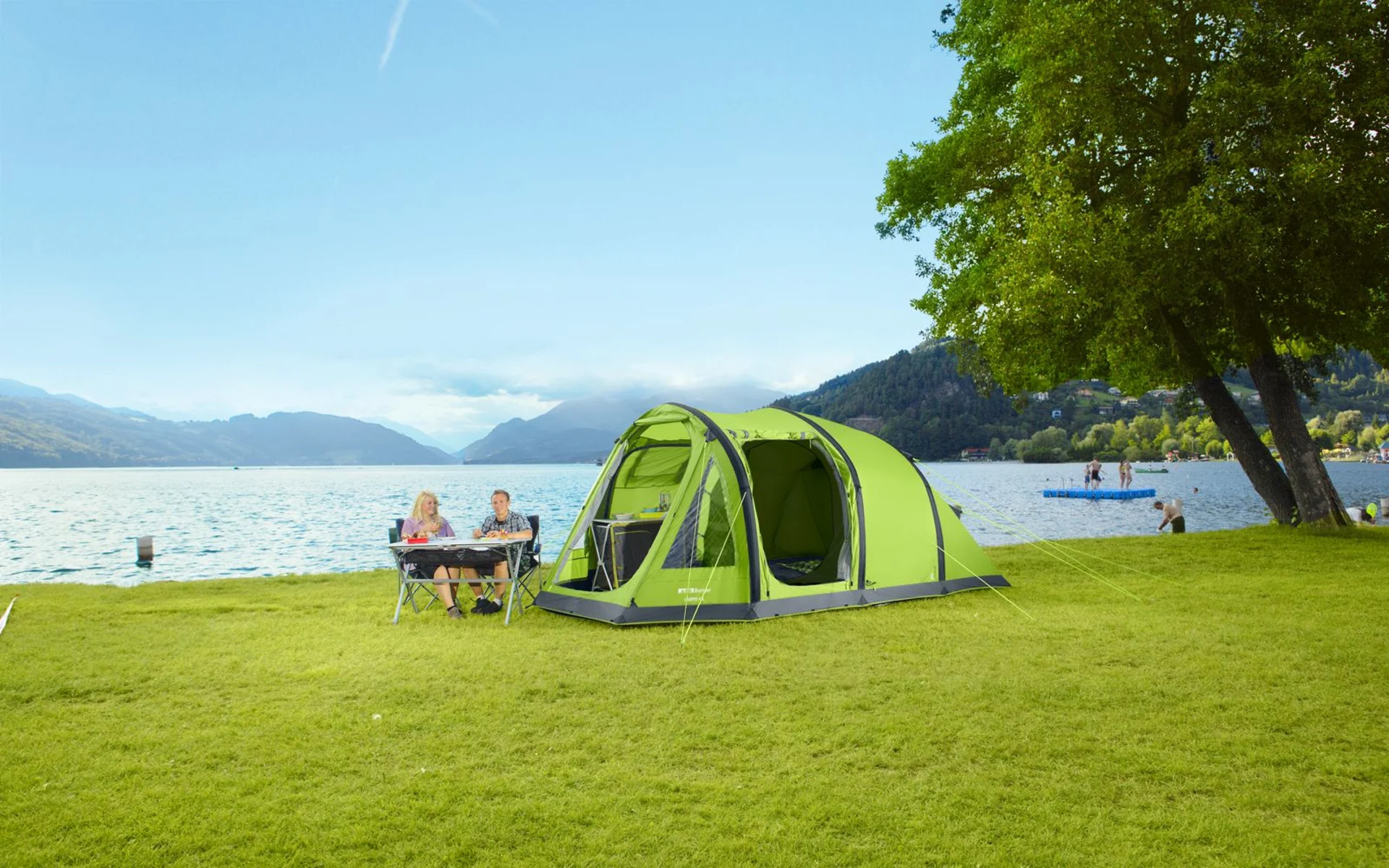 Tunnelzelt mit 3 doppelten Eingängen, welche auch als Sonnendach ausgestellt werden können. Die seitlichen Türen verfügen zusätzlich über blickdicht verschließbare Lüftungsfenster. Schlafkabine inkl. Moskitogaze-Tür.