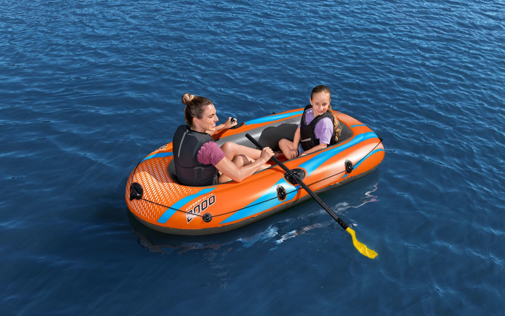 Das Bestway Kondor Elite 1000 ist ein aufblasbares Schlauchboot, welches Platz für einen Erwachsenen und ein Kind mit einem Gesamtgewicht von 120 kg. Dank des aufblasbaren Bodens können Sie während Ihres Ausflugs den bestmöglichen Komfort genießen. Es lässt sich mühelos aufpumpen, sodass Sie mehr Zeit auf dem Wasser als mit dem Aufbau verbringen können. Das Kondor Elite™ 2000 ist zudem mit zwei Luftkammern ausgestattet, was nochmal für zusätzliche Sicherheit sorgt. Der an der Vorderseite des Schlauchbootes angebrachte Griff ermöglicht einen einfachen Transport von und zum Wasser. Außerdem ist das Schlauchboot mit robusten Ruderdollen ausgestattet mit denen die Ruder an Ort und Stelle gehalten werden. Die umlaufende Halteleine mit integrierten Seildurchführungen ermöglicht das Festmachen oder Verbinden mit anderen Booten. Dieses Set enthält auch ein Paar Ruder sowie eine Fußpumpe, mit der das Schlauchboot leicht aufgeblasen werden kann. Ob zum Rudern, Angeln oder einfach nur zum Dahintreiben - dieses Set verspricht einen unvergesslichen Sommer.