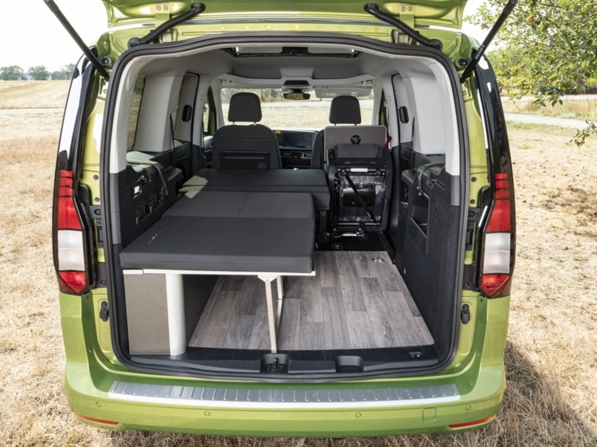 Das Einzelbett besteht aus einem linken, hochklappbaren Teil und der Klappsitzbank, die auf der VW 2er-Sitzbank positioniert wird. Schlaffläche des Einzelbettes: 195x70/87 cm. Daneben bleibt noch viel Platz, z.B. für Sportgeräte. Das Einzelbett kann zum Doppelbett durch die Küchenbox erweitert werden. Das Polster auf der Küchenbox vergrößert die Schlaffläche auf 195x116 cm bzw. 132 cm mit dem Polster davor. Alle Teile können selbst mit 5 Personen an Bord eingebaut bleiben.Beinhaltet 4 Polsterteile (1, 2, 4, 5)
