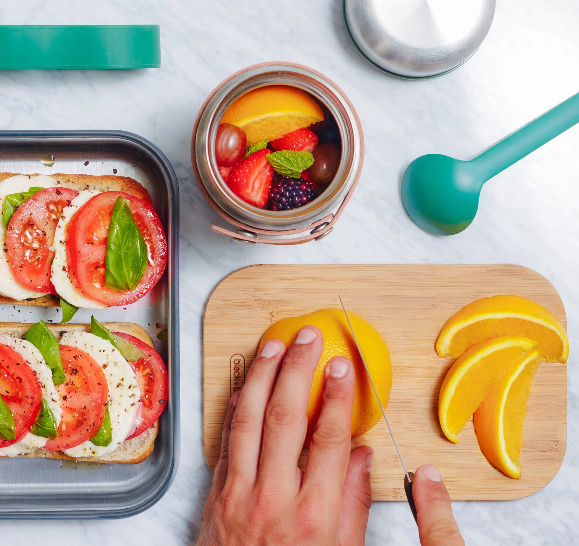 Mit der großen black+blum Sandwichbox bewahren Sie Ihre Sandwiches, Brote und anderen Snacks sicher auf. Die klassische Sandwichbox ist perfekt für unterwegs, der schicke und antibakterielle Bambusdeckel kann gleichzeitig als Schneide- bzw. Servierbrett verwendet werden.