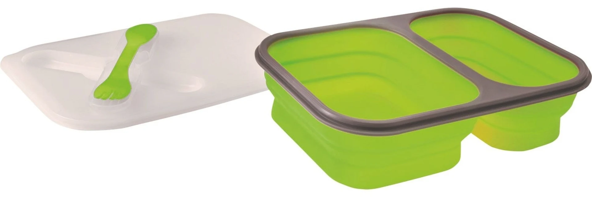 Faltbare Proviantbox aus Silikon für den mobilen Genuss. Mit zwei Kammern inklusive Essbesteck als Gabel-Löffel-Kombination, welches sich praktisch im Deckel fixieren lässt. Spülmaschinen- und mikrowellengeeignet.