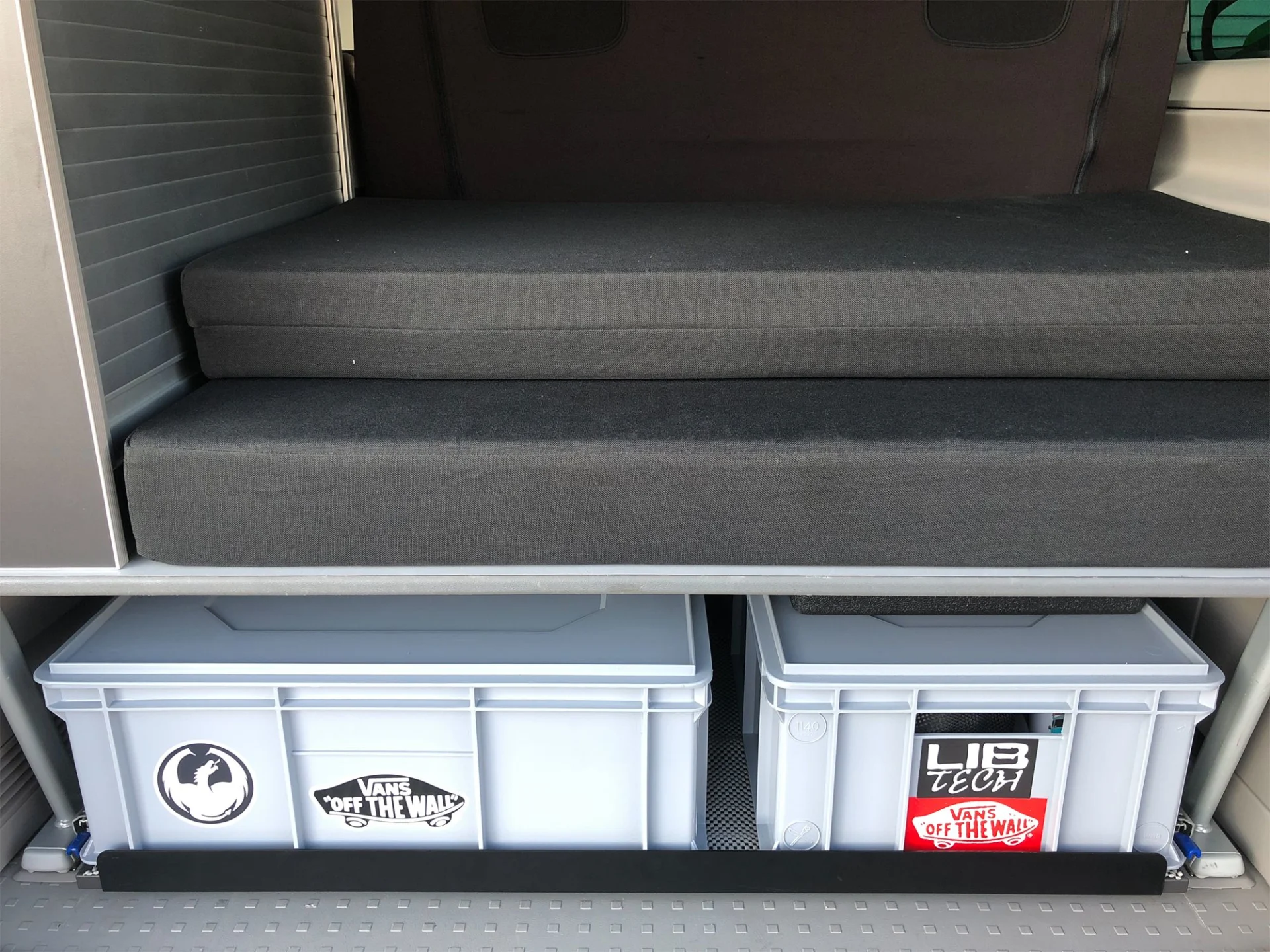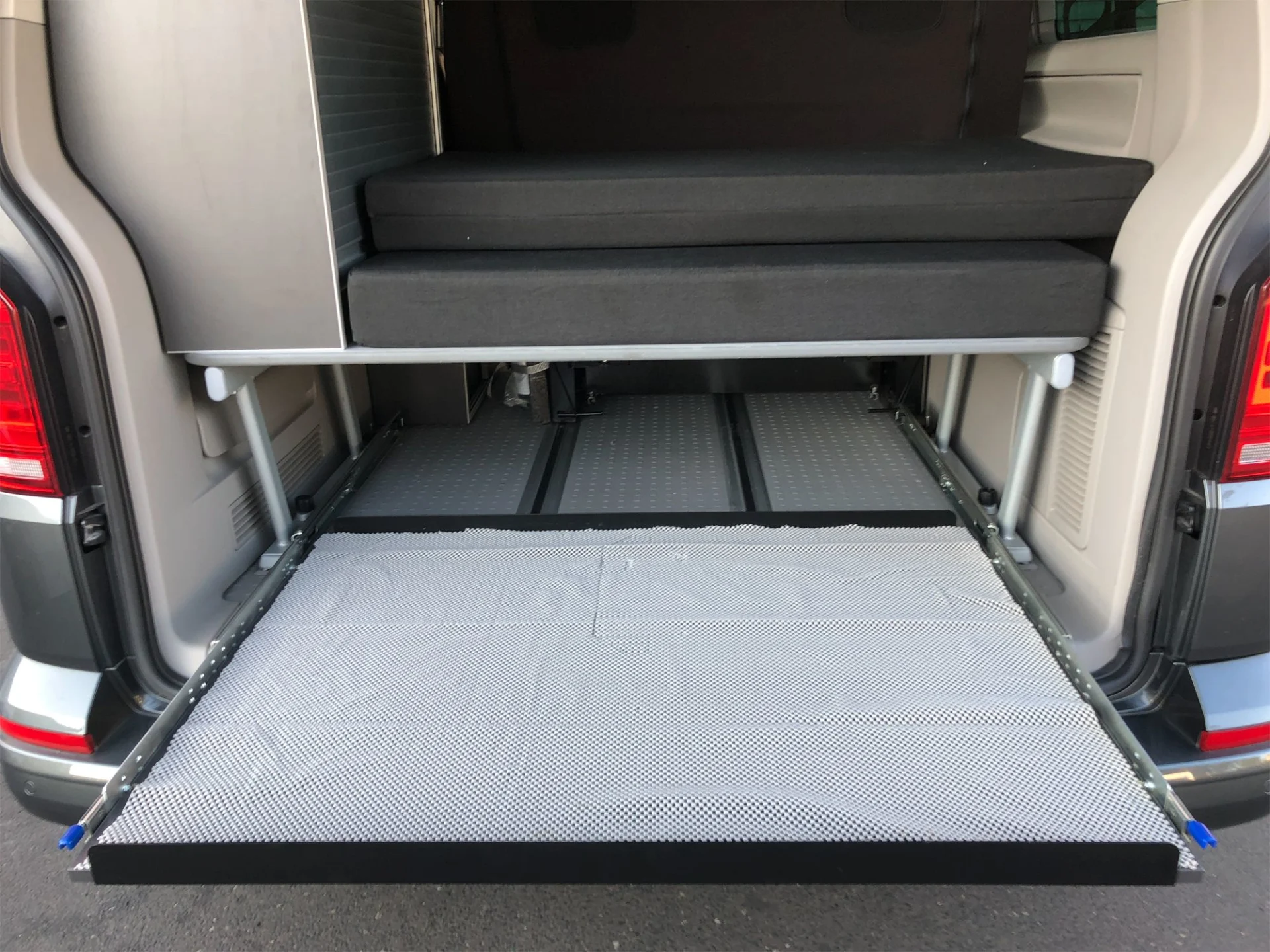 Das Multiflexboard (sowohl das Originale von Volkswagen als auch unseres von BusBoxx) kann im Fahrzeug verbleiben und muss zur Montage der heckBOXX nicht demontiert werden. Die heckBOXX wird durch zwei Hebel entriegelt und kann dann ausgezogen werden. Die beiden Hebel müssen beim Einschieben betätigt werden. Im ausgezogenen Zustand ist der Schwerlastauszug verriegelt, um ein sicheres Beladen der heckBOXX zu gewährleisten.