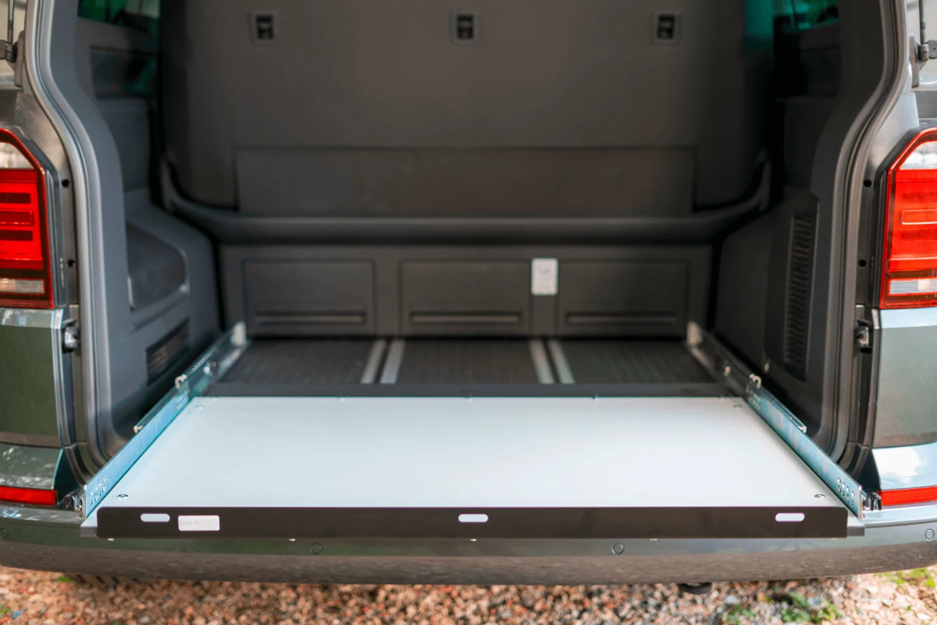 Bei einem Heckauszug mit Brett-Tiefe 750 mm kannst du die Rücksitzbank bis maximal nach hinten Richtung Heck positionieren und schließt so an das Multiflexboard (Original Volkswagen oder unseres) an. Dadurch hast du in der Busmitte den größtmöglichen Platz.