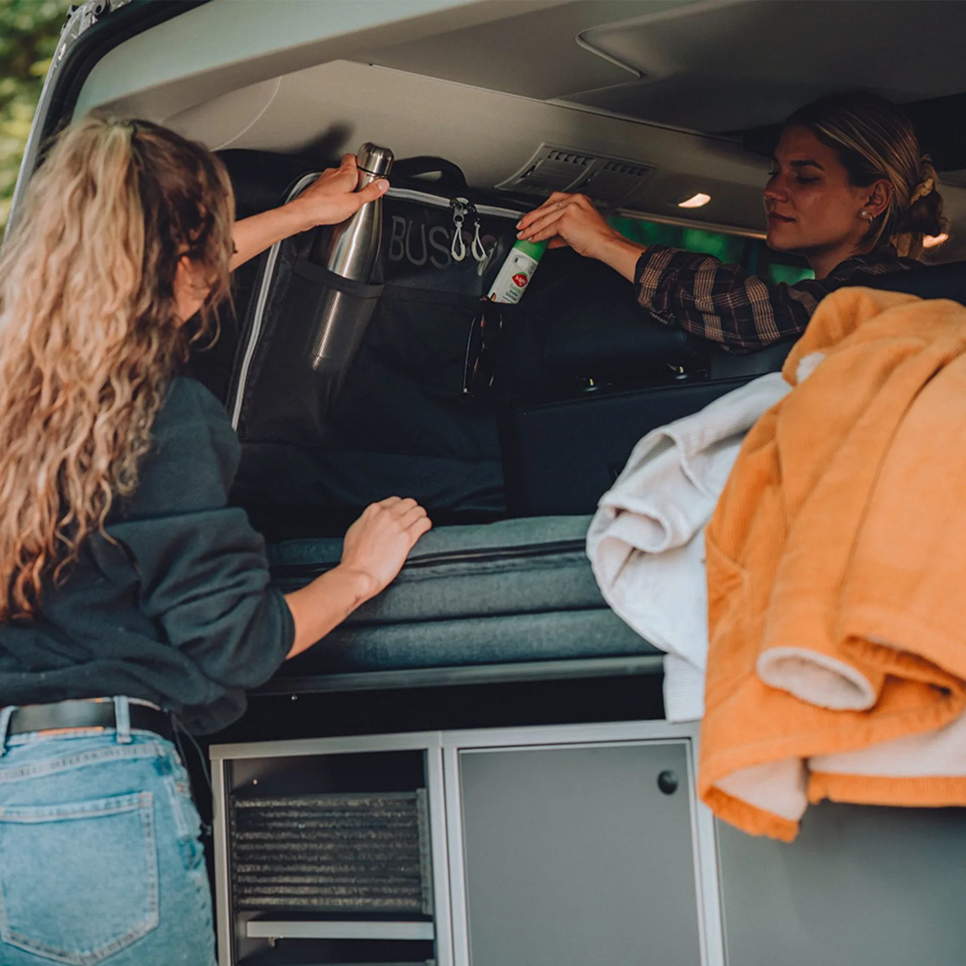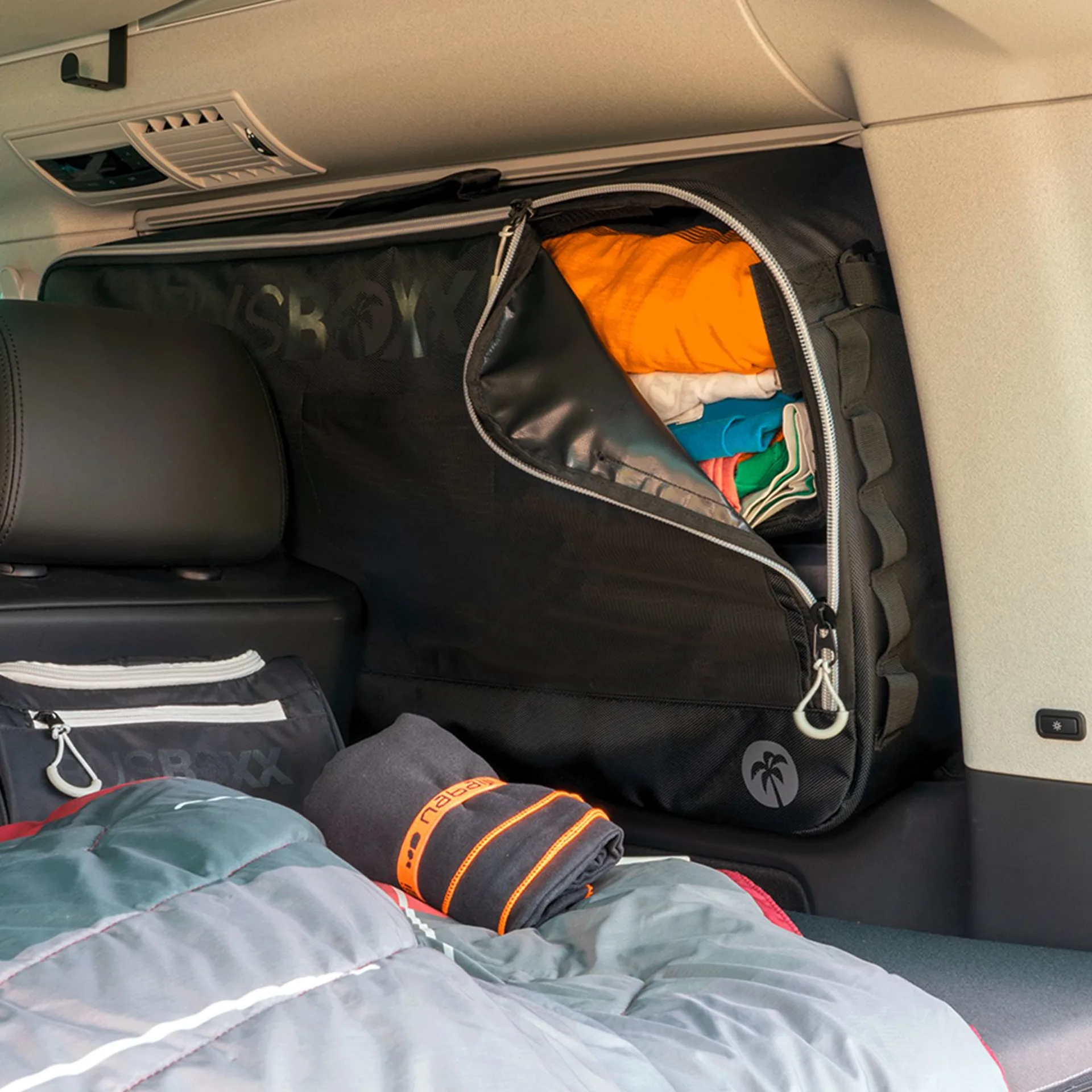 Die windowBOXX bietet zusätzlichen Stauraum und fungiert gleichzeitig als Verdunklung für Fenster. Sie ist passend für alle T5/T6/T6.1 Multivan-Modelle mit Sonnenrollo und California Beach. Die Tasche wird an einer Platte befestigt, die in die Fensterverkleidung eingeschoben wird. Flexible Unterteilungen und Netze verhindern das Herausfallen von Gegenständen. Zusätzlich bieten „Loops“ die Möglichkeit, Utensilien einzuhängen.