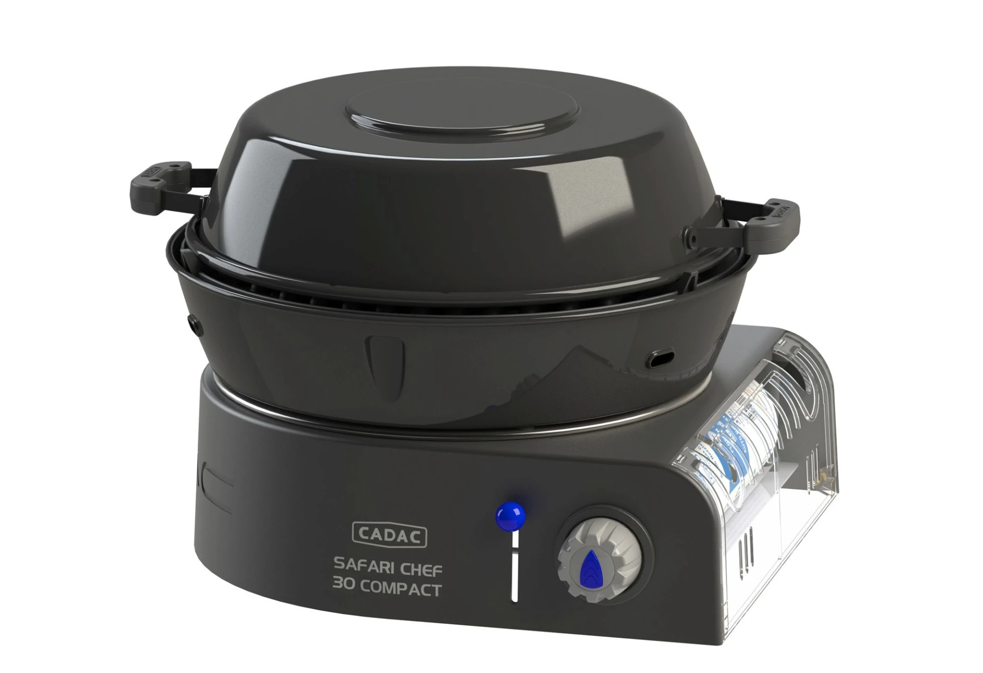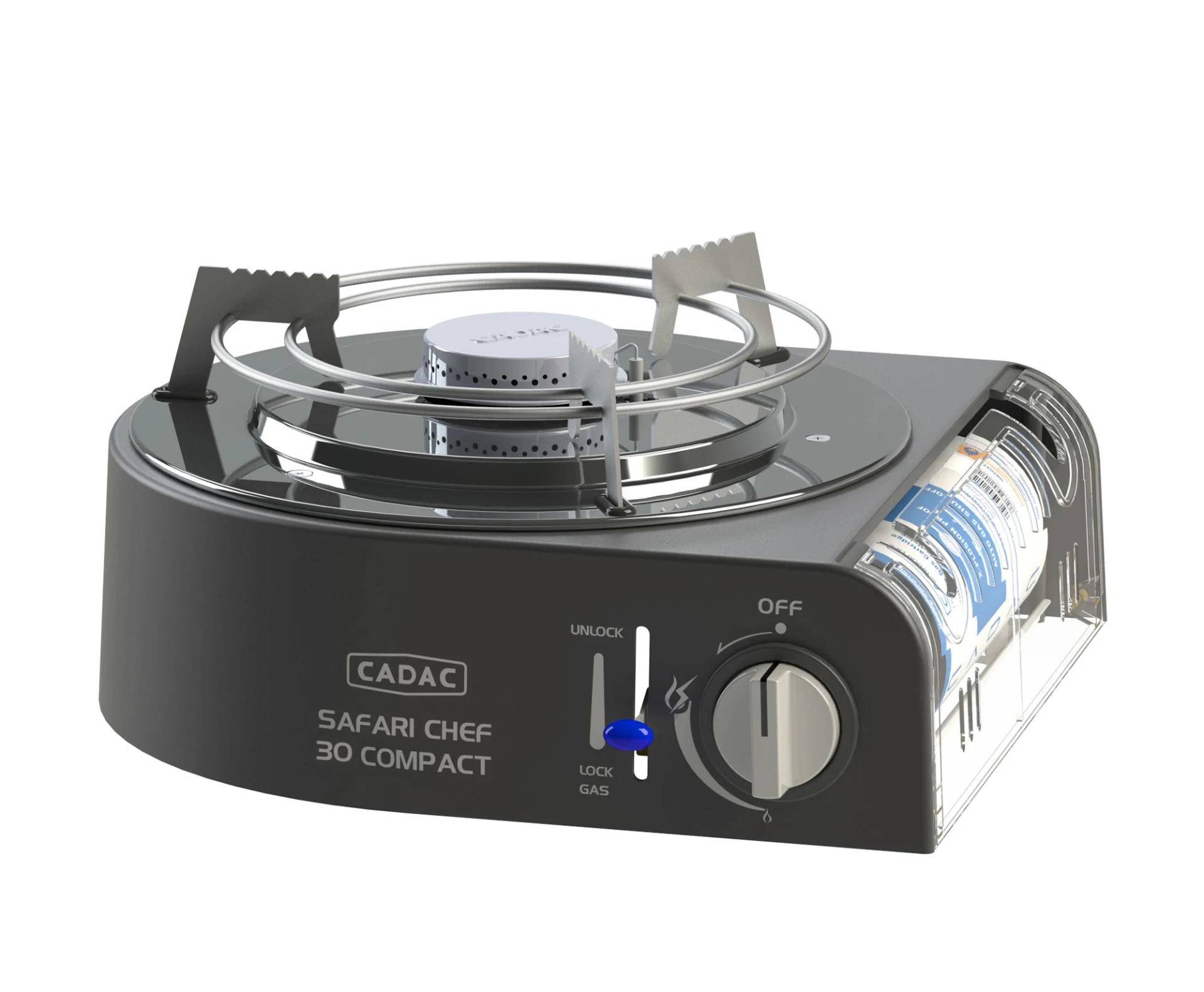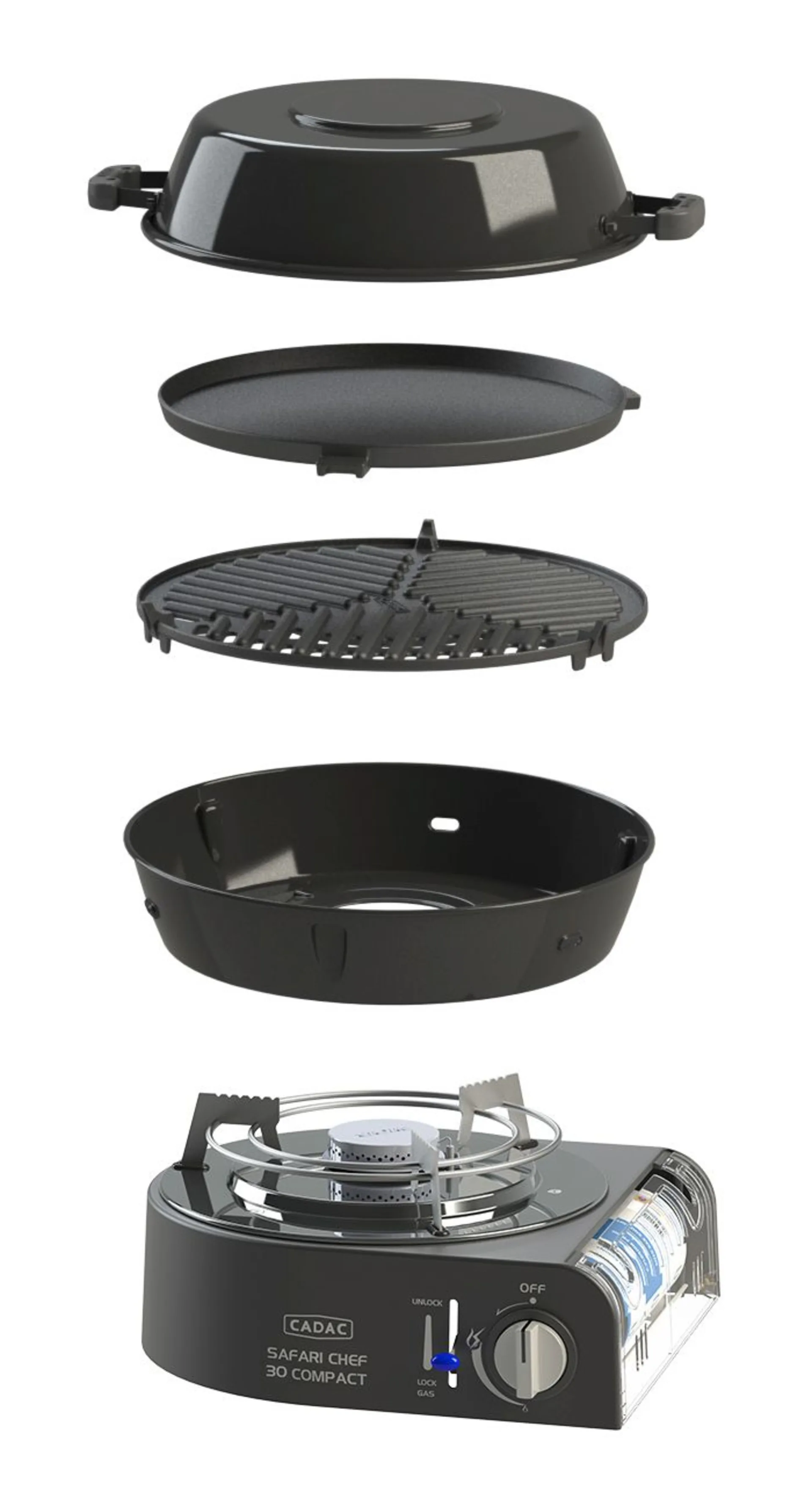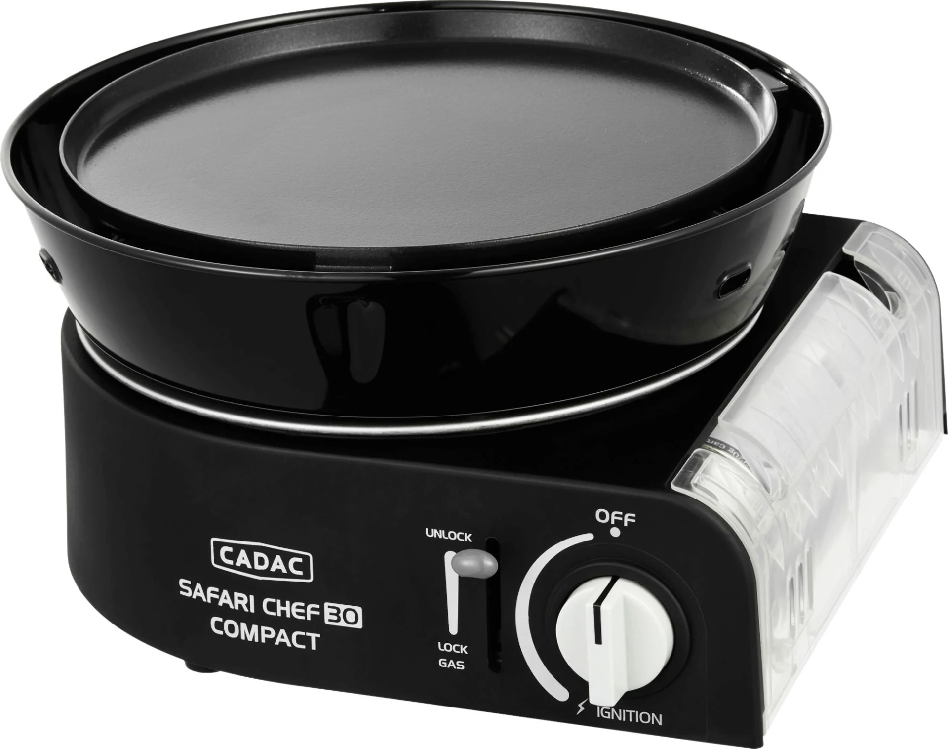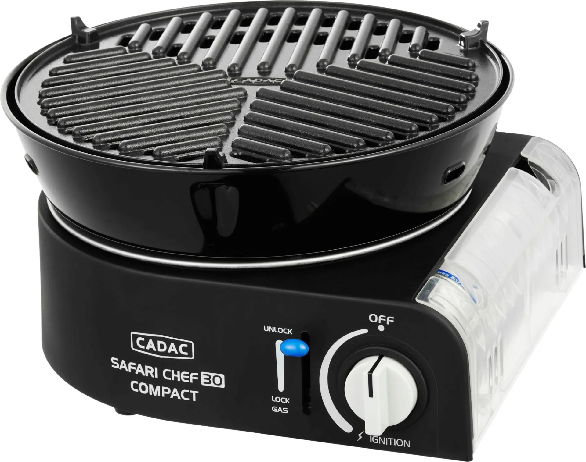 Der neue Safari Chef 30 Compact ist ein ultrakompakter, leichter Gasgrill. Dieser Grill arbeitet direkt mit einer 227gr-Bajonettkartusche; einfach die Gaskartusche in das Gerät einsetzen, einklicken und schon kann man mit dem Kochen oder Grillen beginnen. Ein ideales Gerät für Outdoor-Aktivitäten und Campingurlaube.