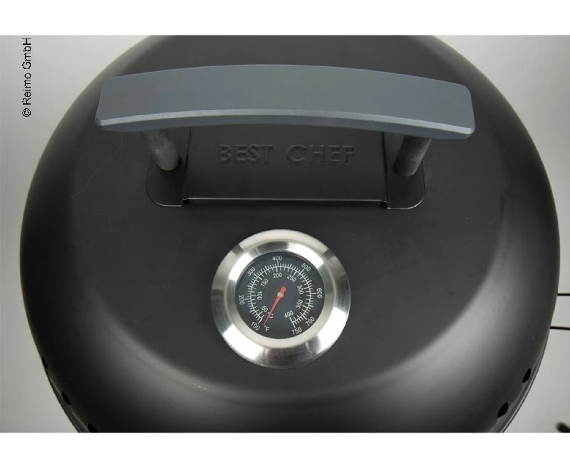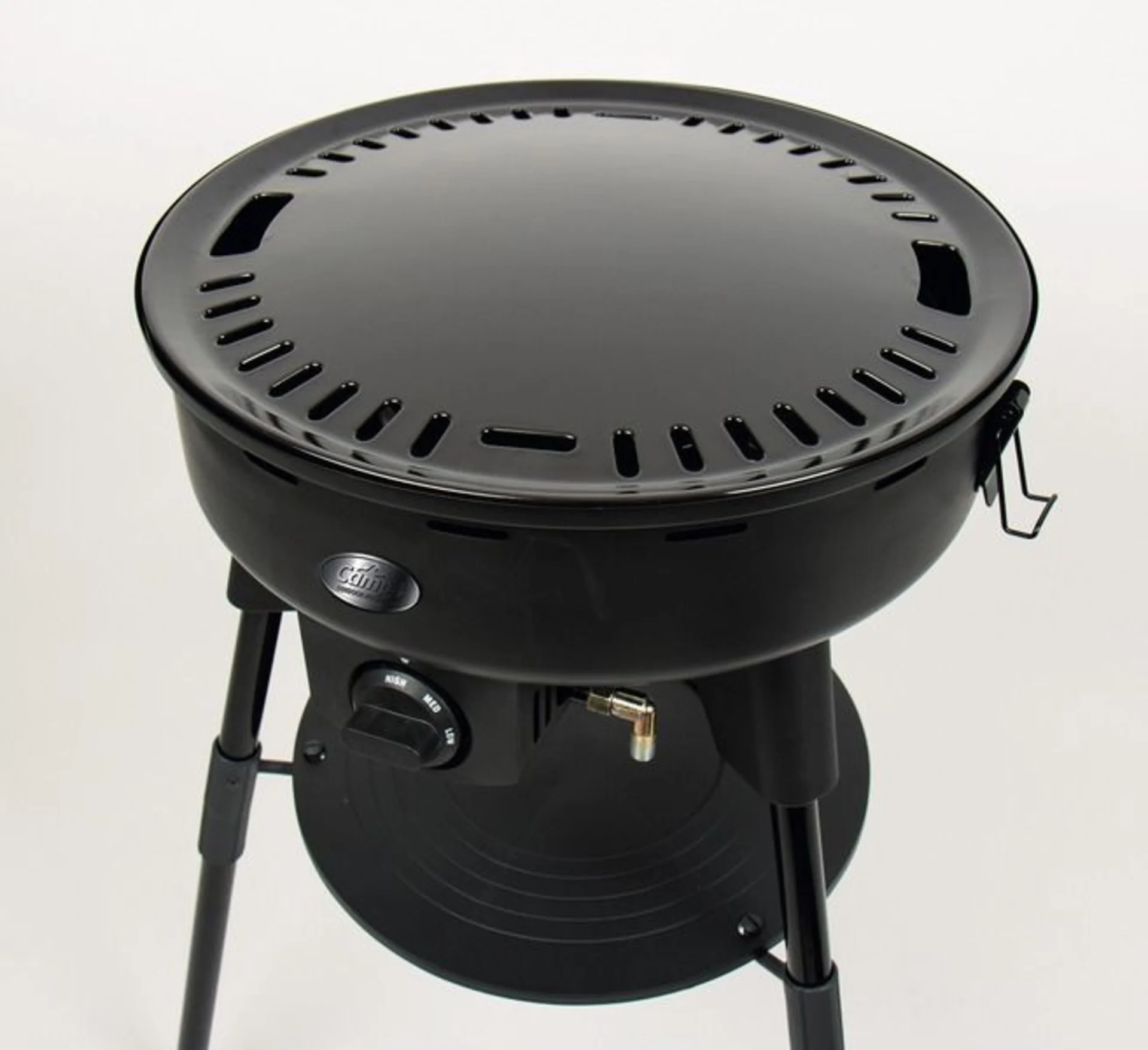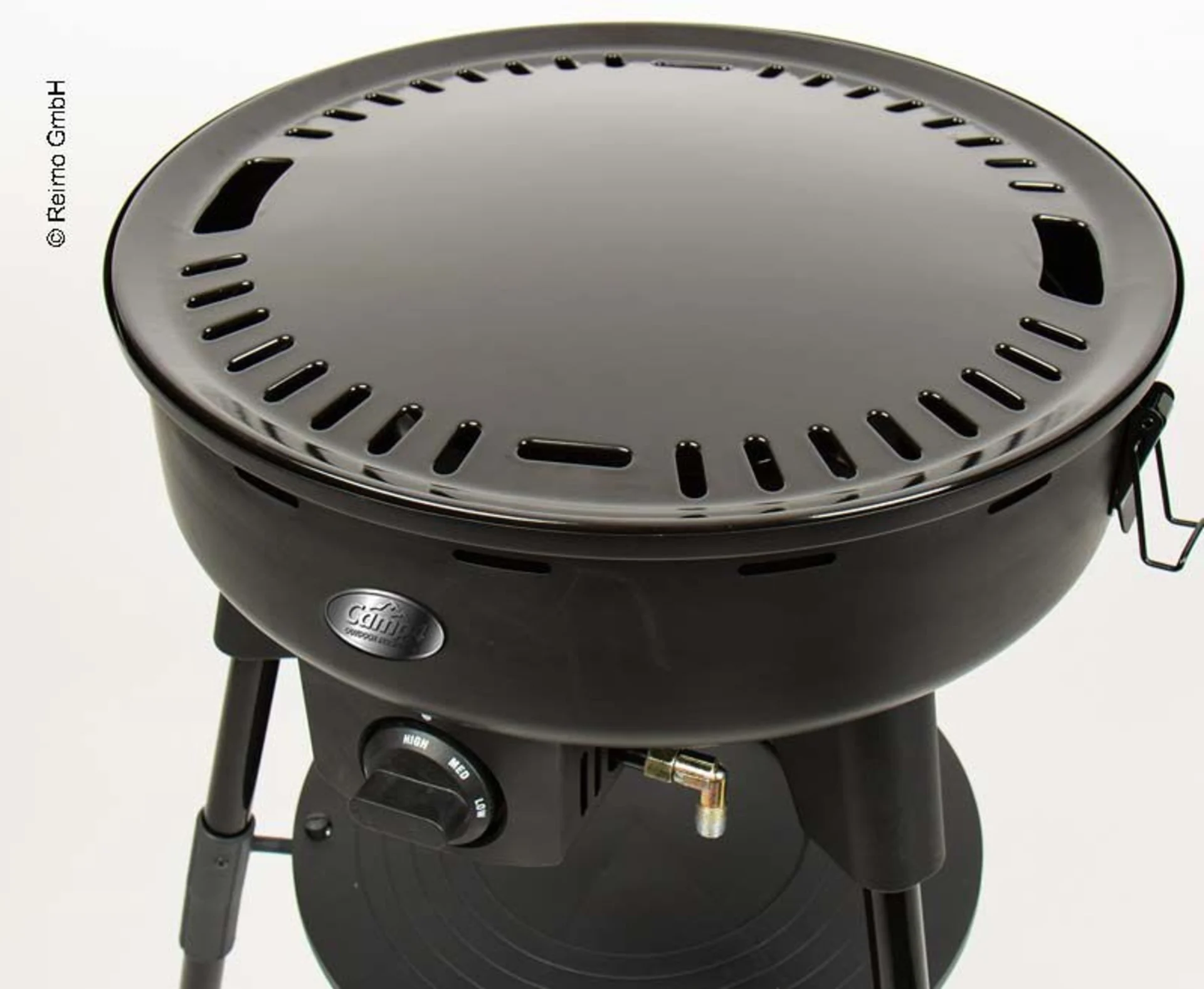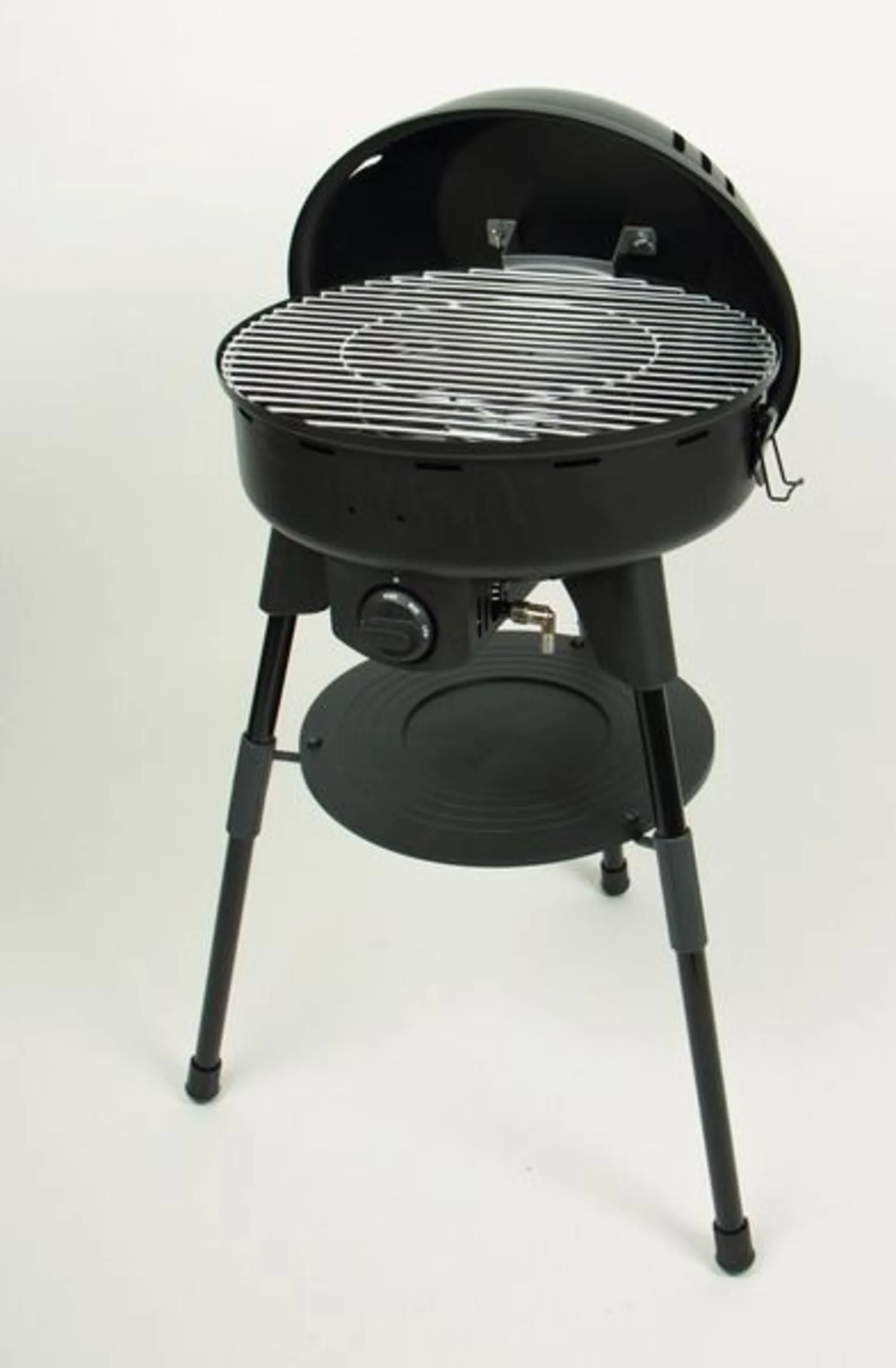 Gasgrill mit 3 höhenverstellbaren Metallbeinen und Kunststoff-Standfüssen. Bequeme Arbeitshöhe, 67/98cm. Kann ohne Metallbeine auch als Tischgrill verwendet werden, 30mbar. Mit Linksgewinde (EU).
