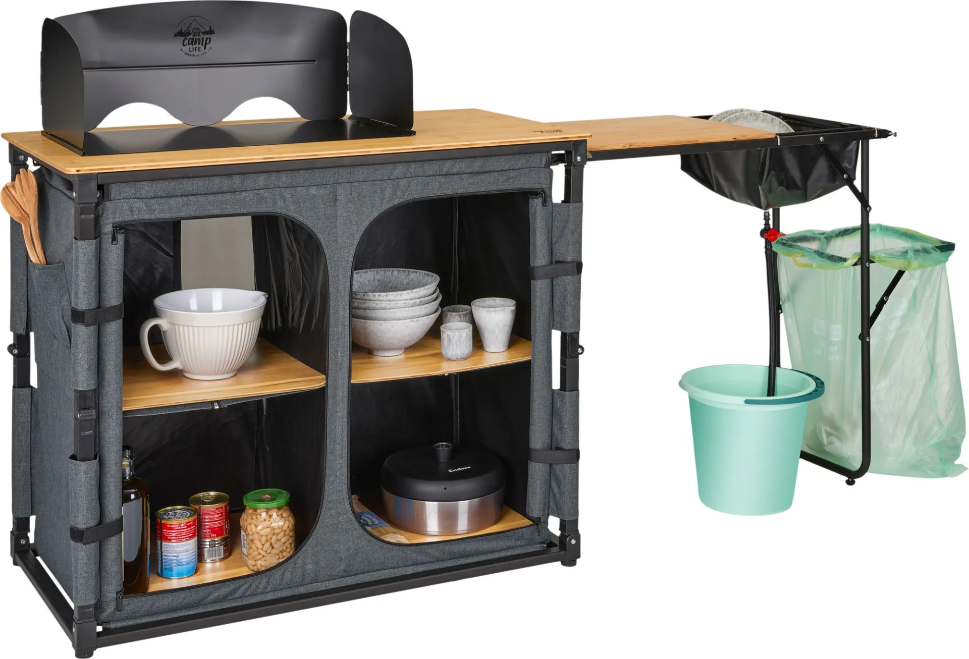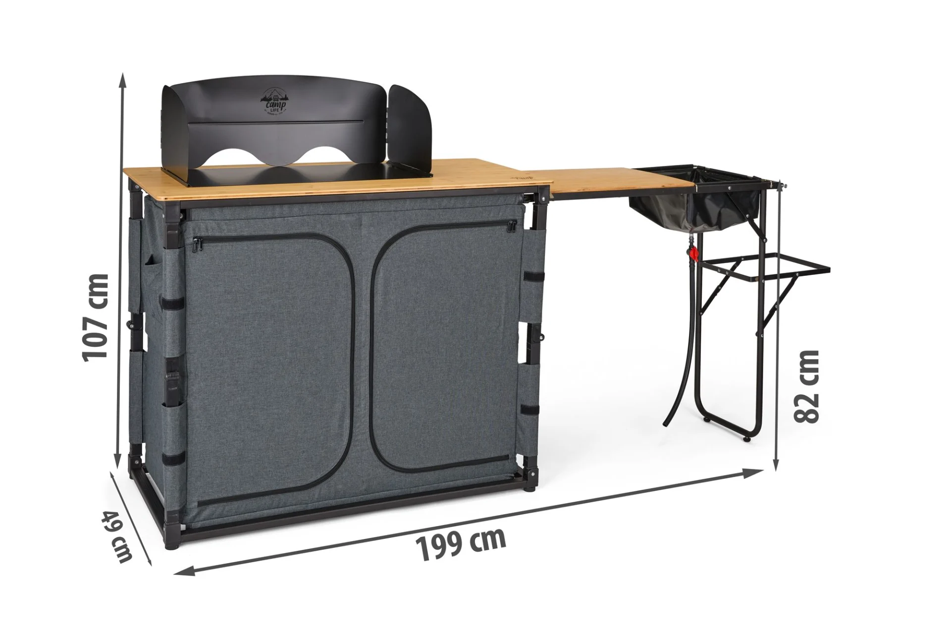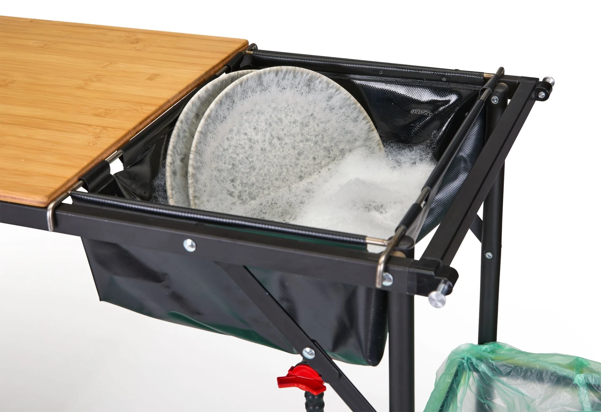 Ein besonderes Highlight ist die einschiebbare Extra-Arbeitsplatte die zusätzlichen Platz für die Zubereitung der Mahlzeiten bietet. An der Platte ist ein Spülbecken und ein Wasserauslass mit Absperrventil befestigt. Damit wird das Abspülen von Geschirr zum Kinderspiel! Der Mülltütenhalter sorgt dafür, dass du deinen Abfall ordentlich und umweltbewusst entsorgen kannst. Das Spülbecken kann entnommen werden und der Spülbeckenhalter sowie auch der Mülltütenhalter sind einklappbar, was dir zusätzliche Flexibilität und Platzersparnis bietet. Mit dem Windschutz hat die Küchenbox eine Höhe von 107 cm.