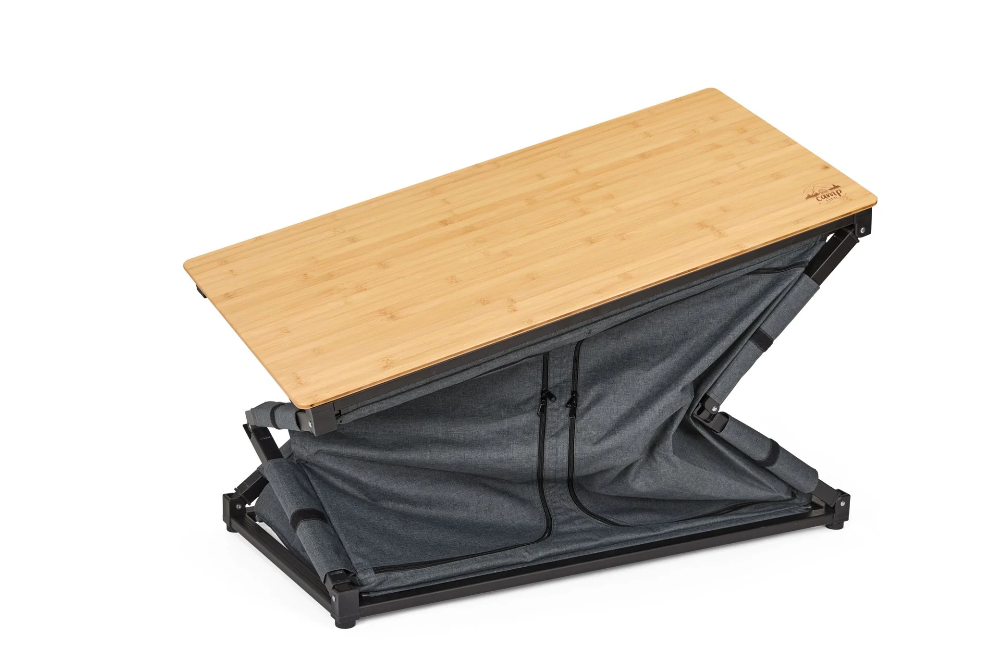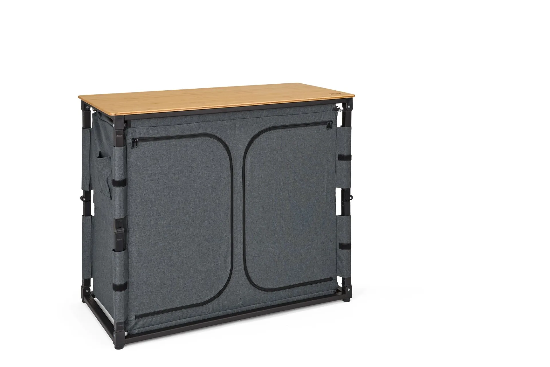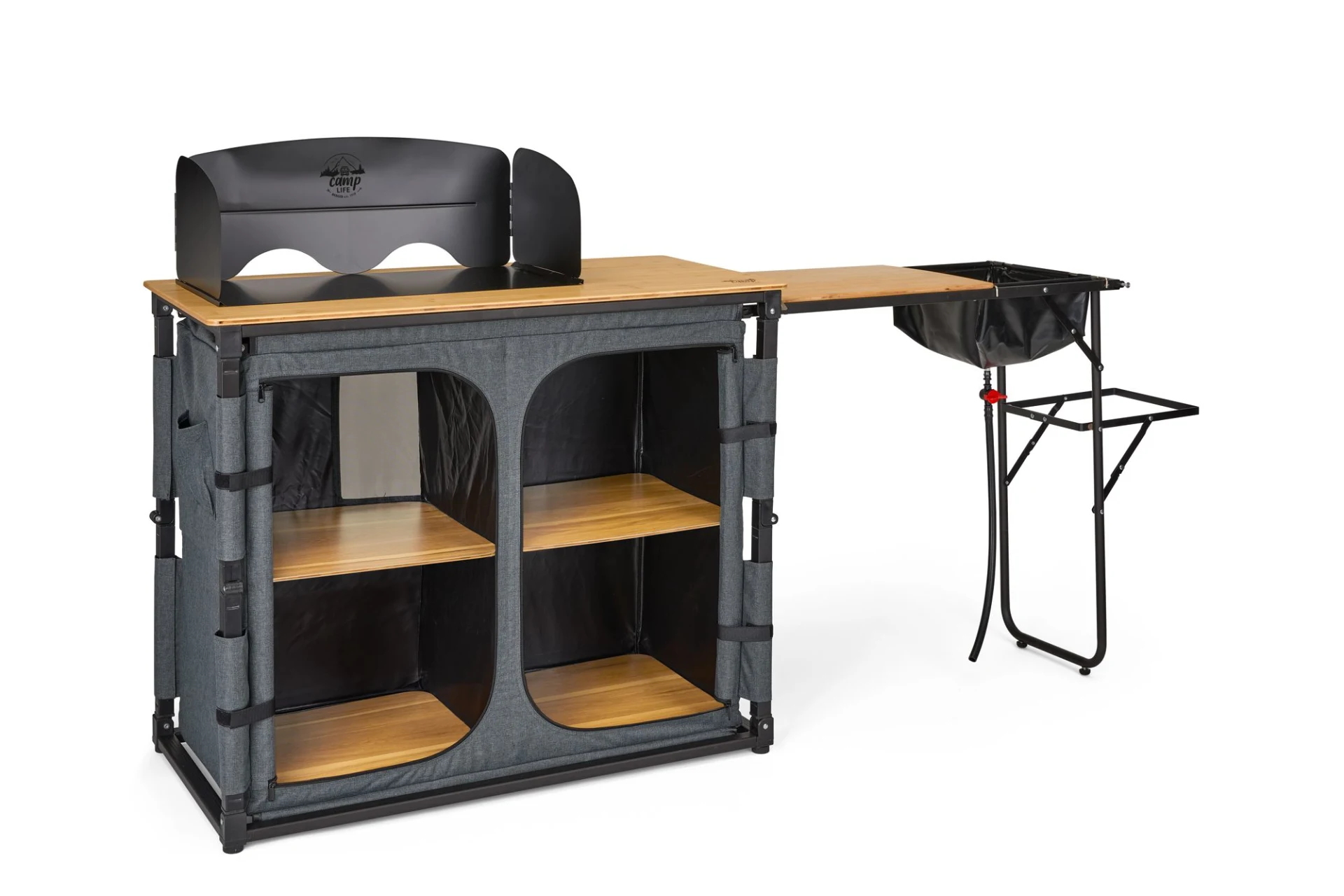 Ein besonderes Highlight ist die einschiebbare Extra-Arbeitsplatte die zusätzlichen Platz für die Zubereitung der Mahlzeiten bietet. An der Platte ist ein Spülbecken und ein Wasserauslass mit Absperrventil befestigt. Damit wird das Abspülen von Geschirr zum Kinderspiel! Der Mülltütenhalter sorgt dafür, dass du deinen Abfall ordentlich und umweltbewusst entsorgen kannst. Das Spülbecken kann entnommen werden und der Spülbeckenhalter sowie auch der Mülltütenhalter sind einklappbar, was dir zusätzliche Flexibilität und Platzersparnis bietet. Mit dem Windschutz hat die Küchenbox eine Höhe von 107 cm.