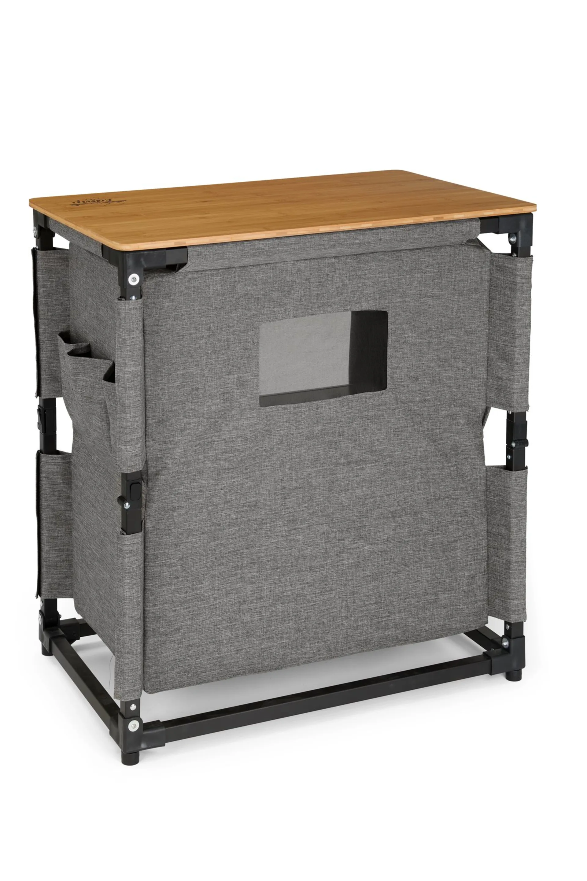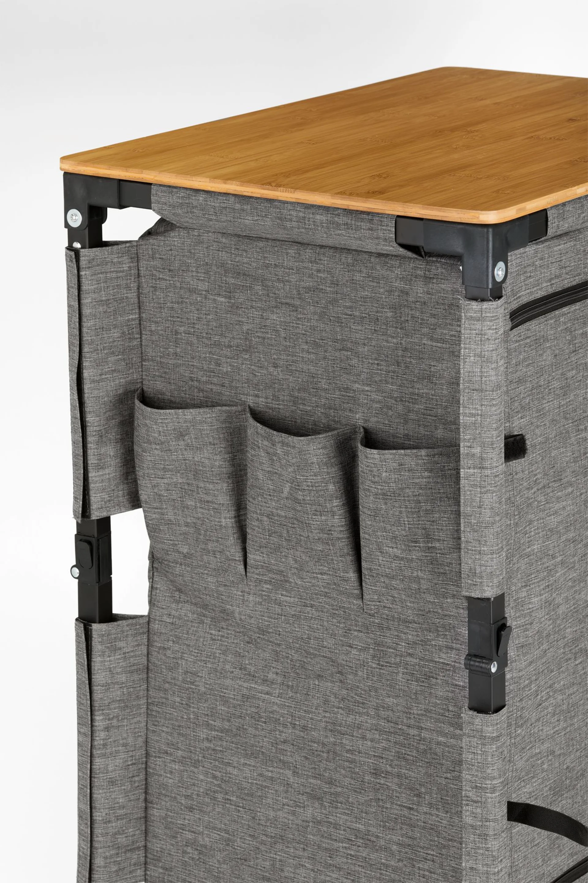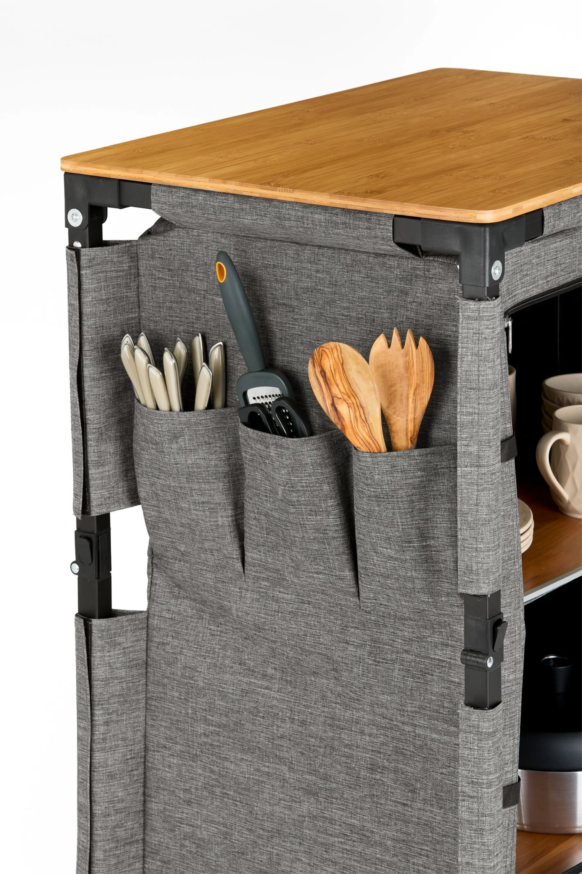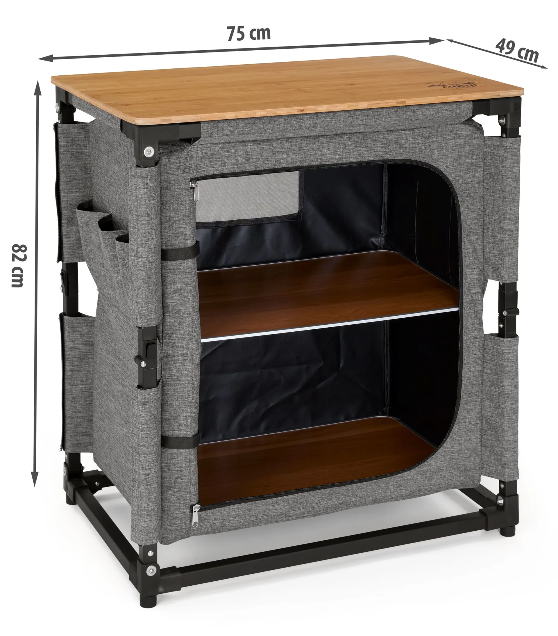 Diese vielseitige Küchenbox lässt sich im Handumdrehen aufbauen und bietet dir ausreichend Stauraum für all deine Kochutensilien. Mit seinem leichten Design ist sie einfach zu transportieren und kann platzsparend verstaut werden, wenn du sie nicht benötigst. Ideal für alle, die beim Campen Wert auf Ordnung und Funktionalität legen! Die praktischen Seitentaschen sind perfekt für die Verstauung von Besteck geeignet. Das Mesh-Fenster sorgt für eine gute Belüftung. Die Küchenbox besteht zudem aus 100% recyeltem Polyester.