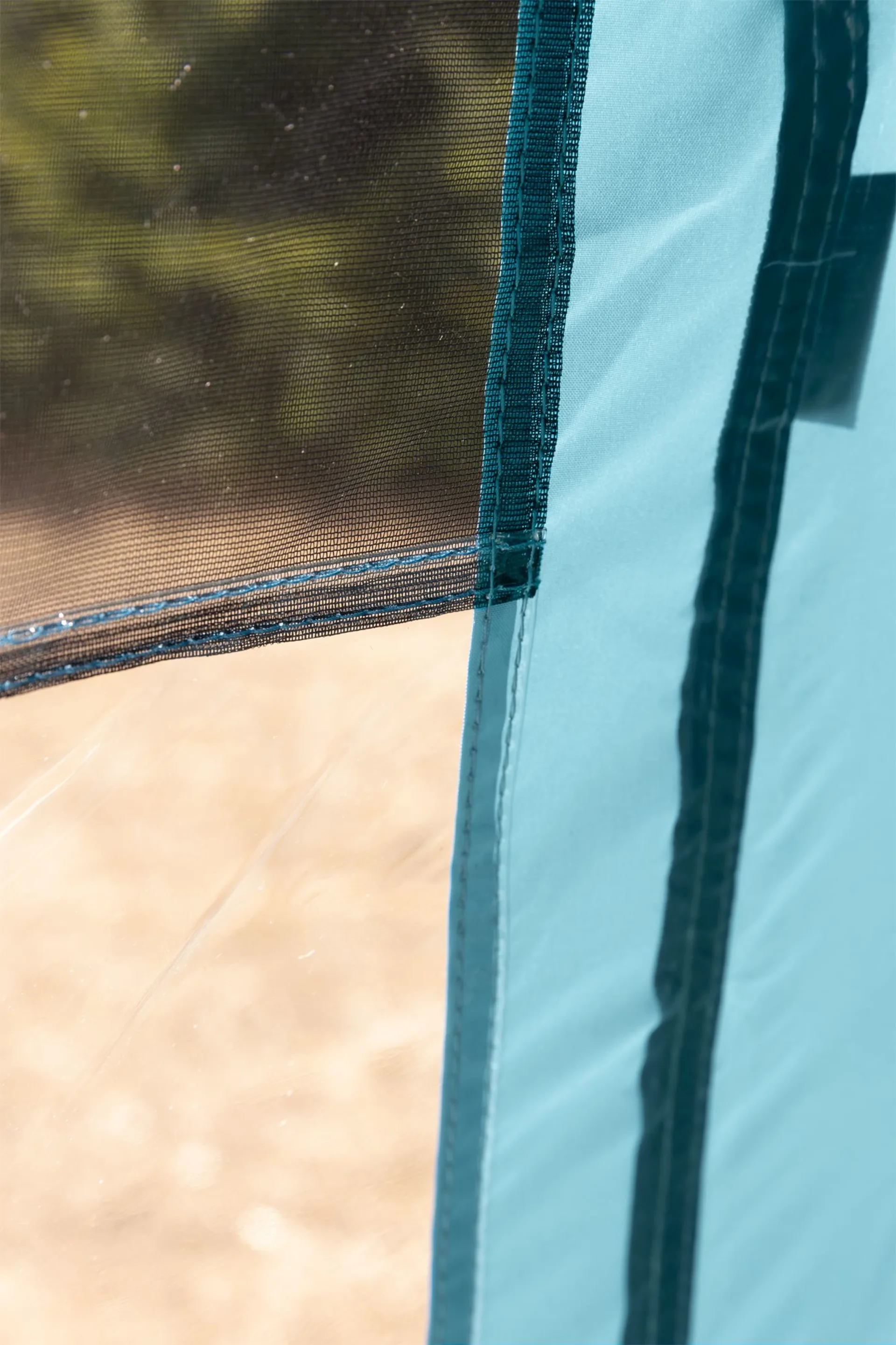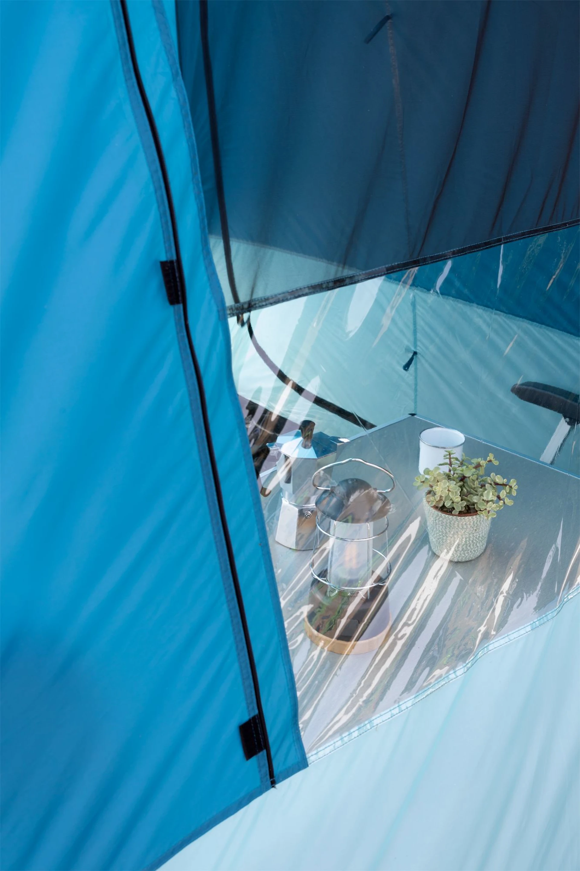 Freistehendes Busvorzelt für Fahrzeuge mit einer Regenrinnenhöhe von 180-210 cm. Fenster inkl. Moskitogaze (hochrollbar / blickdicht verschließbar).