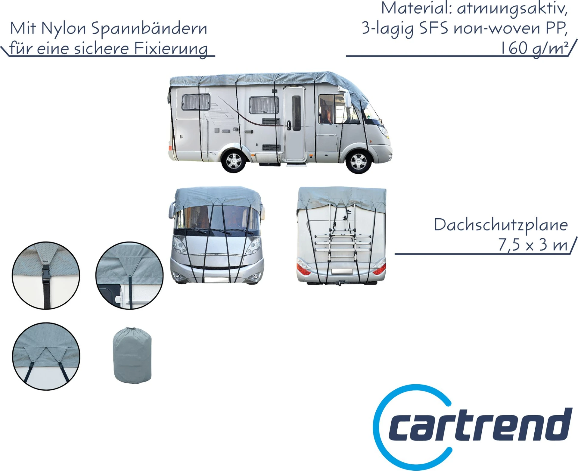 Gerade im Winter sind Wohnwagen und Wohnmobile Frost, Eis und Wind ausgesetzt. Umso wichtiger ist es, das Reisemobil davor zu schützen. Die cartrend Caravan Dachschutzplanen beugen solchen Einwirkungen vor und schützen Ihr Wohnmobil vor Schmutz und Nässe. Geeignet für den Gebrauch im Freien, aber auch in geschlossenen Gebäuden während der Winterperiode.