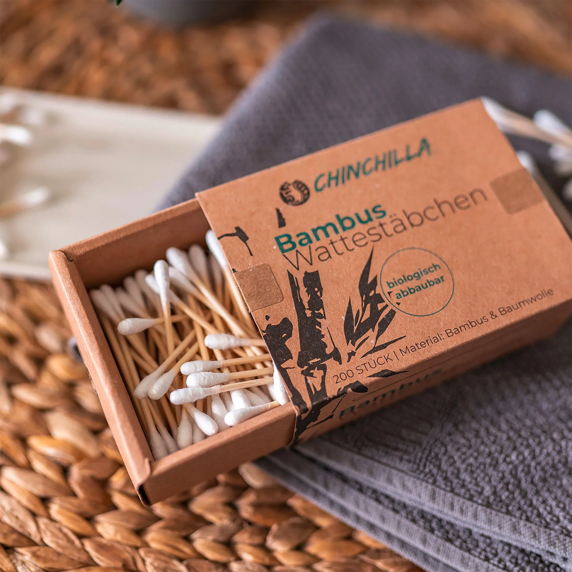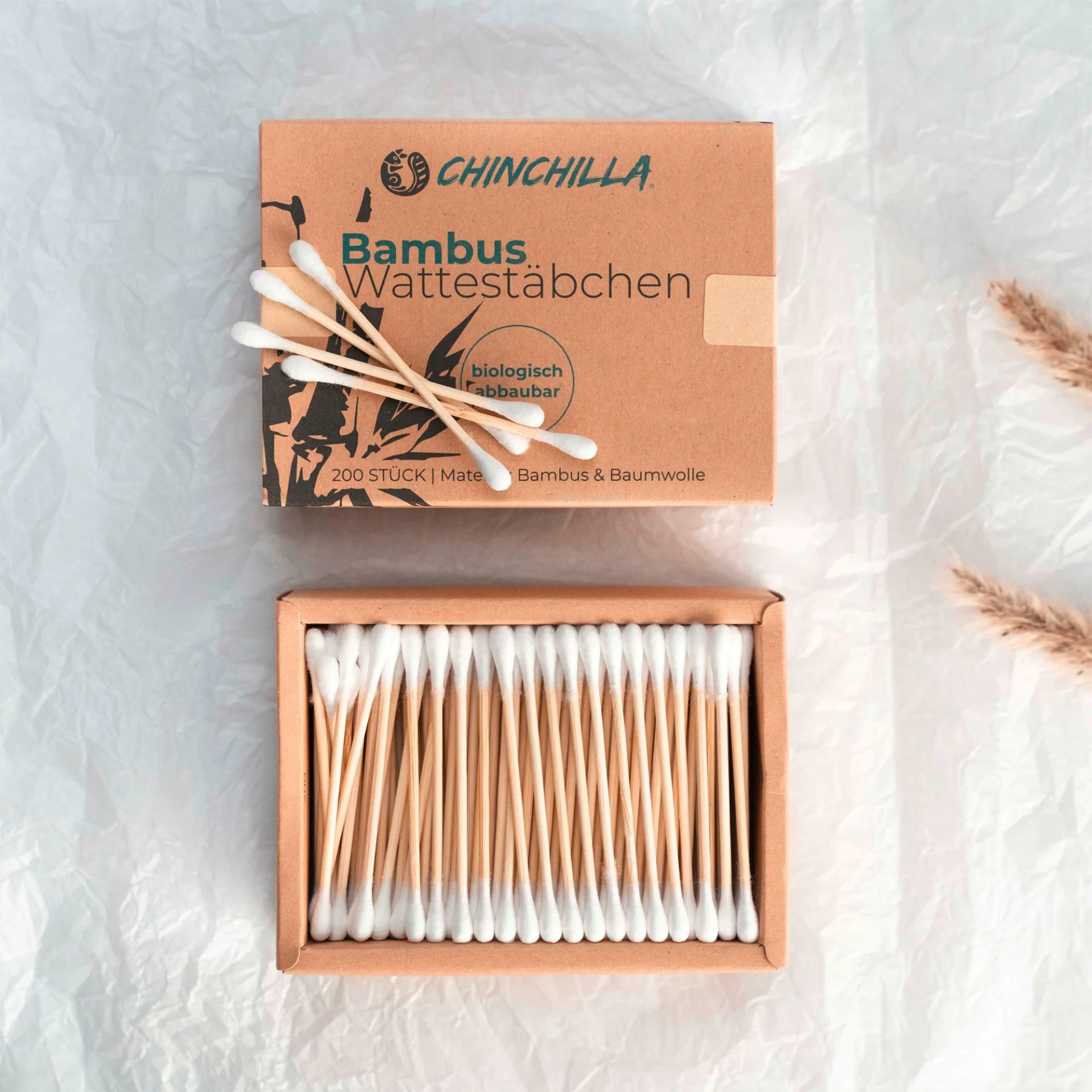 Die Wattestäbchen aus Bambus und 100 % biologischer Baumwolle sind die plastikfreie & nachhaltige Alternative zu herkömmlichen Wattestäbchen aus Plastik. Sie kommen im 200er-Pack und sind in einer praktischen Aufbewahrungsbox aus Naturkarton verstaut – perfekt für zu Hause oder unterwegs.