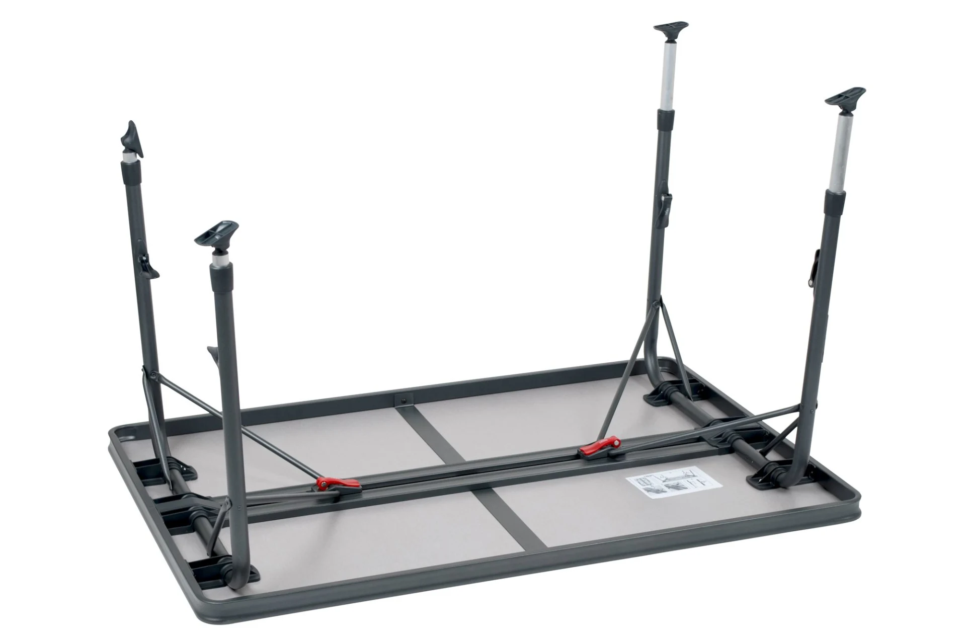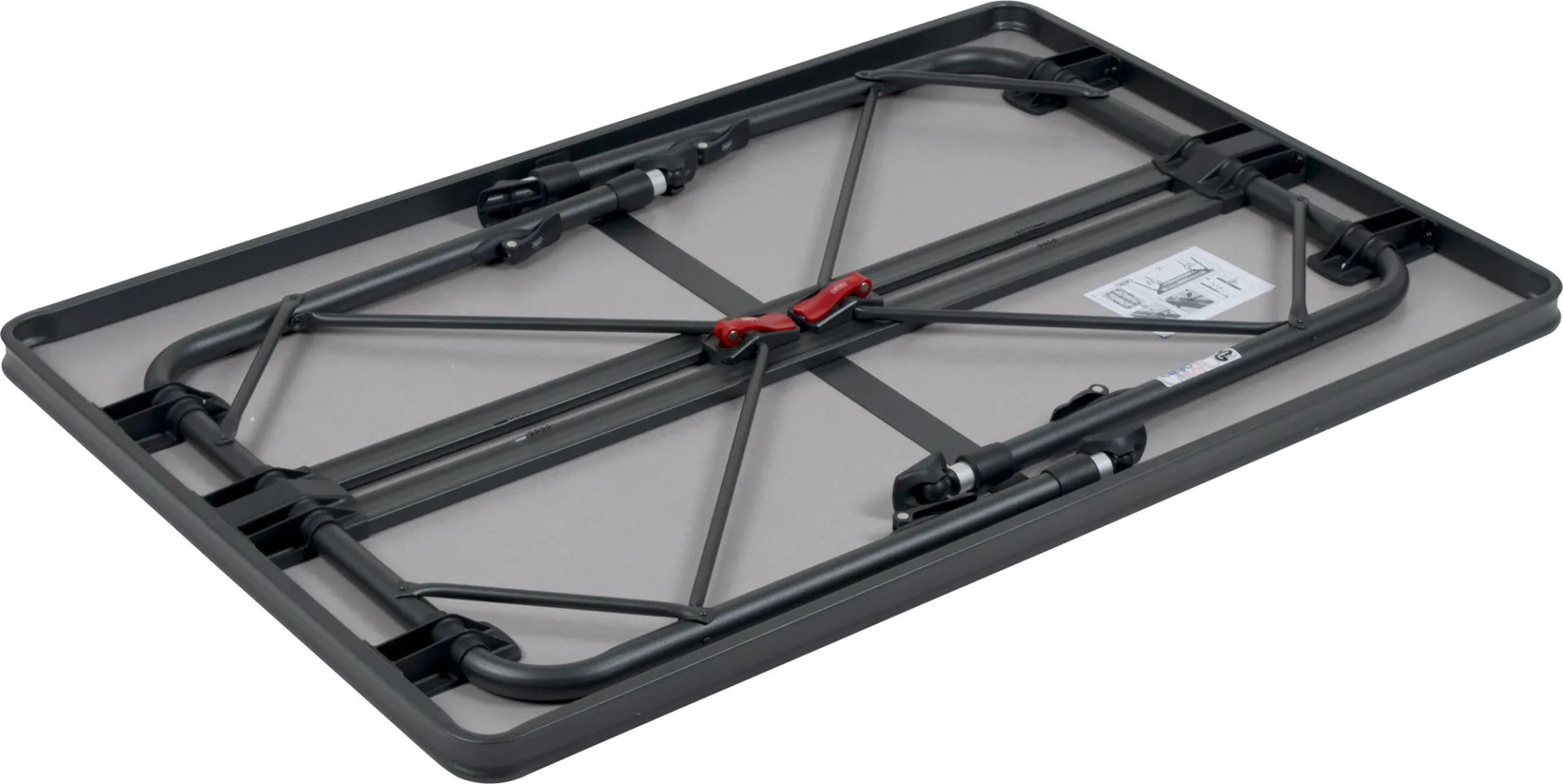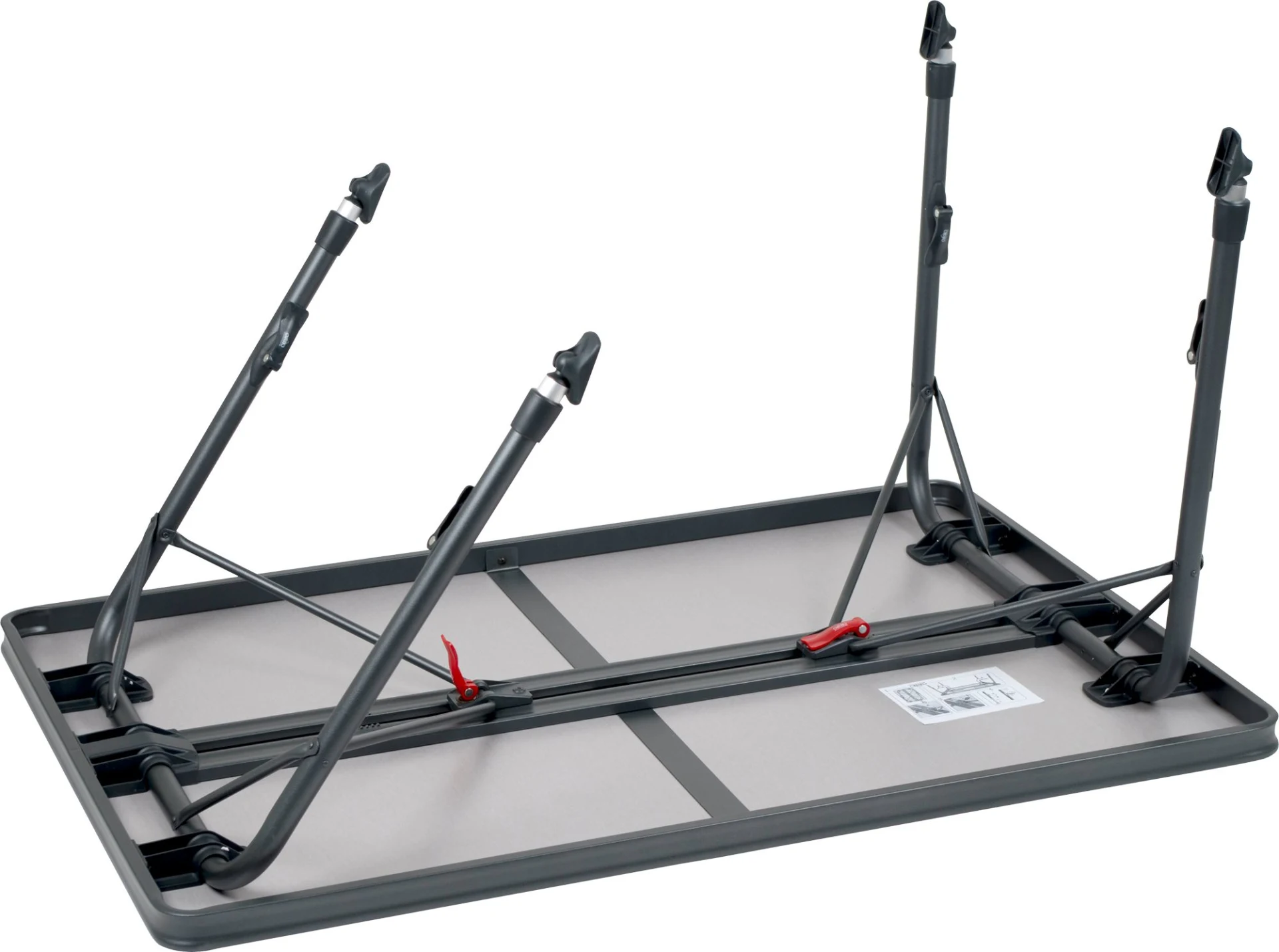 Durch seine einzigartige Konstruktion ist dieser Tisch einfach auf- und zuzuklappen. Die Beine sind nach dem Einklappen sicher in den Aluminiumschienen an der Unterseite der Tischplatte zu befestigen, die wiederum für eine zusätzliche Verstärkung sorgen.Dank hochwertiger Materialien und der hitzebeständigen und wasserfesten Tischplatte, wird eine lange Lebensdauer gewährleistet. Die Beine sorgen für hohe Stabilität durch die dicken und extra verstärkten Rohre. Die Stabilisierungsfüße sorgen für zusätzlichen Halt auf jeder Oberfläche. Dieser Tisch ist durch den Alu-Rahmen leichtgewichtig und leicht zu transportieren.