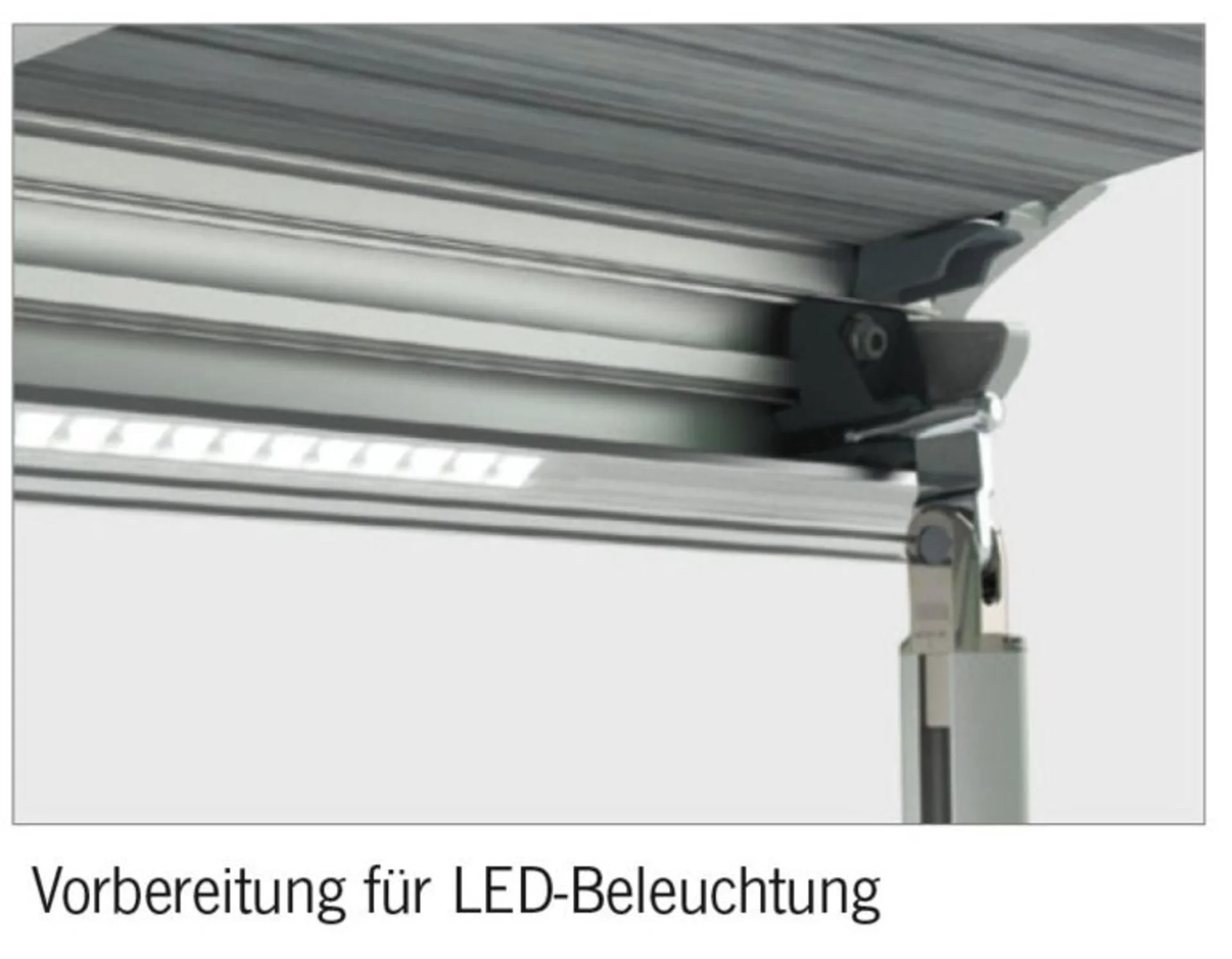 Die neue Markise F80L mit Dachmontage und Winde, die sich besonders für grosse Fahrzeuge eignet. Sie sorgt dank des grossen Auszugs von 275 cm für viel Raum vor dem Wohnmobil. Erhältlich in 4 Längen: von 450 bis 600 cm.