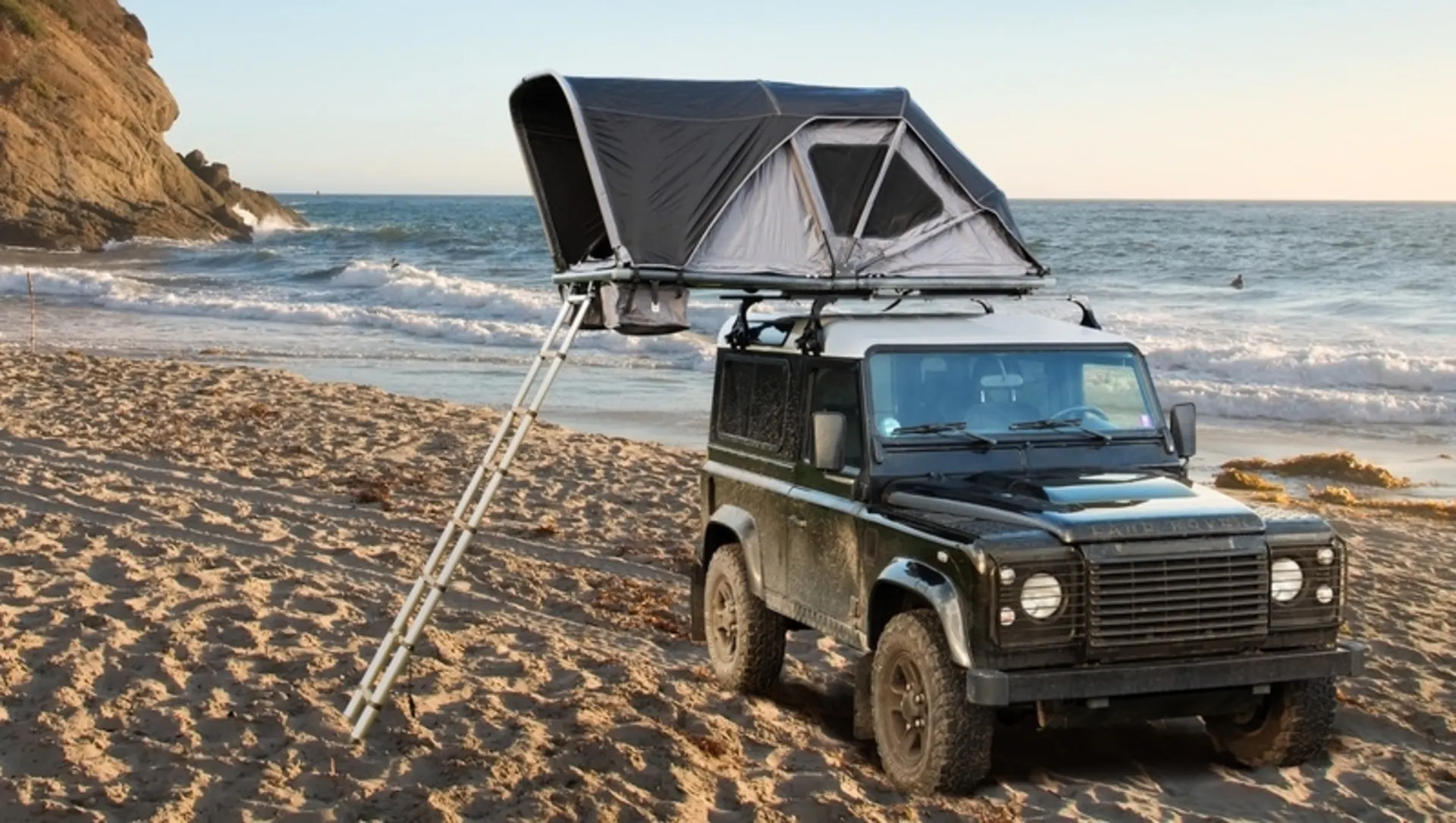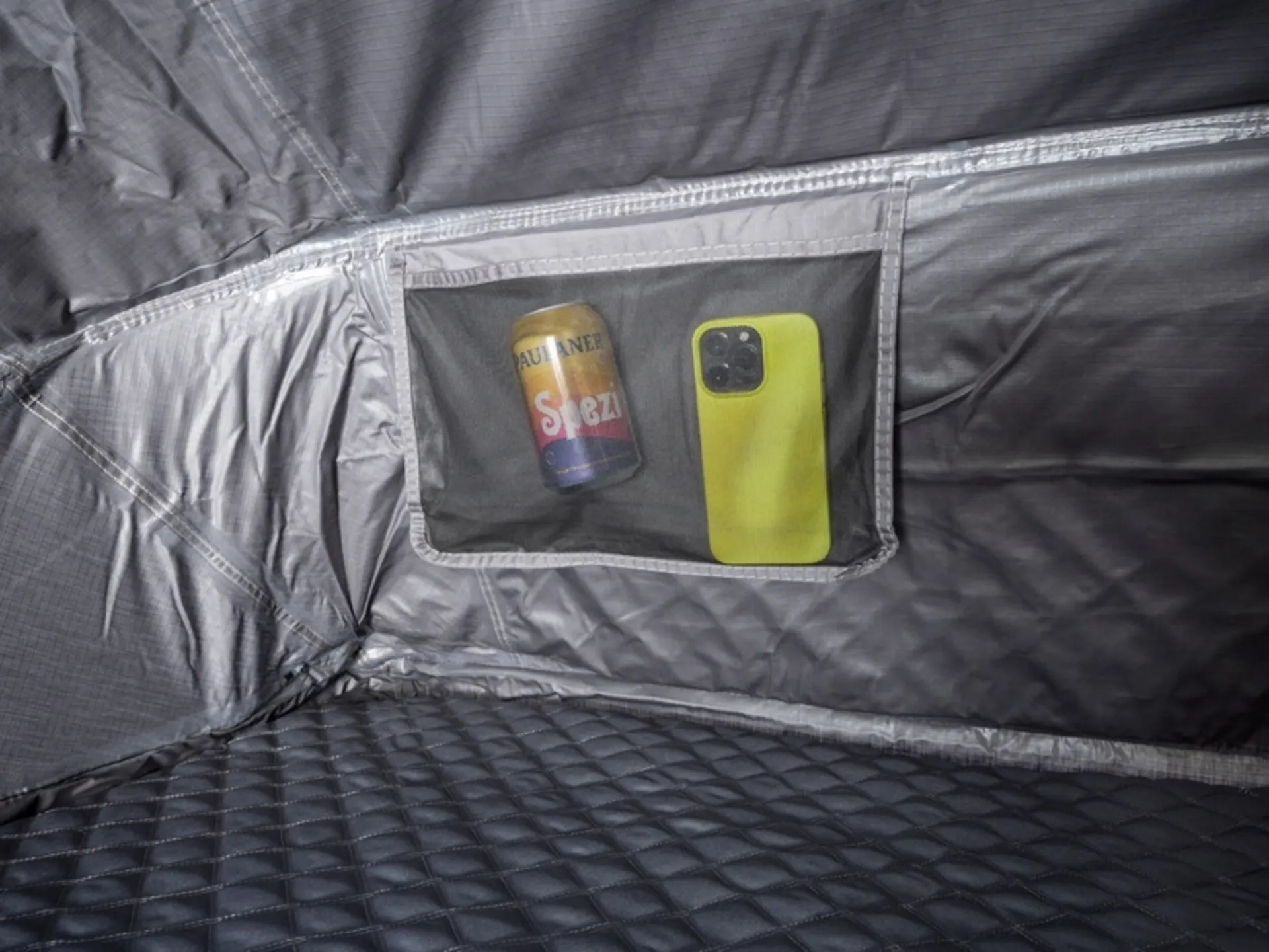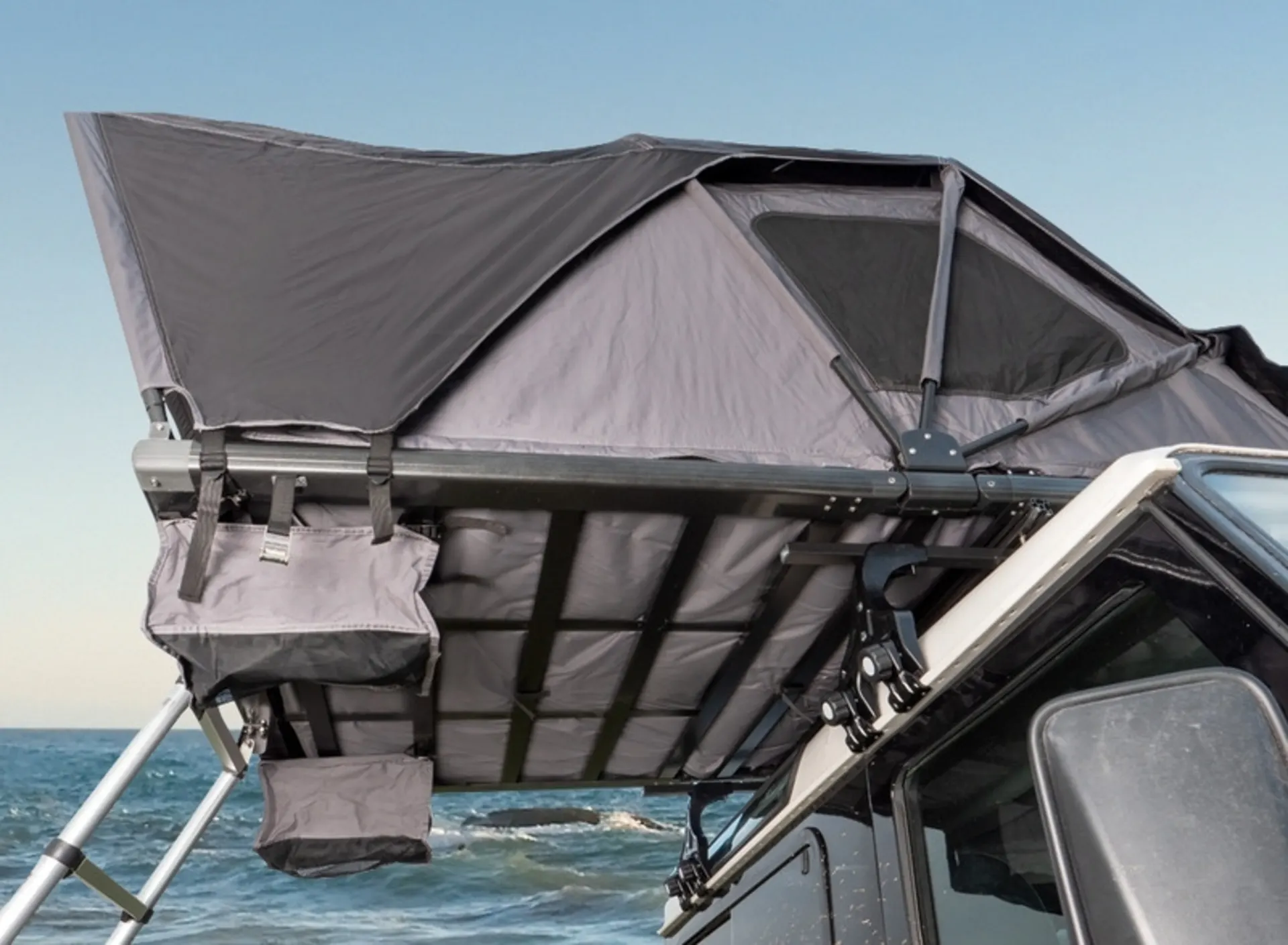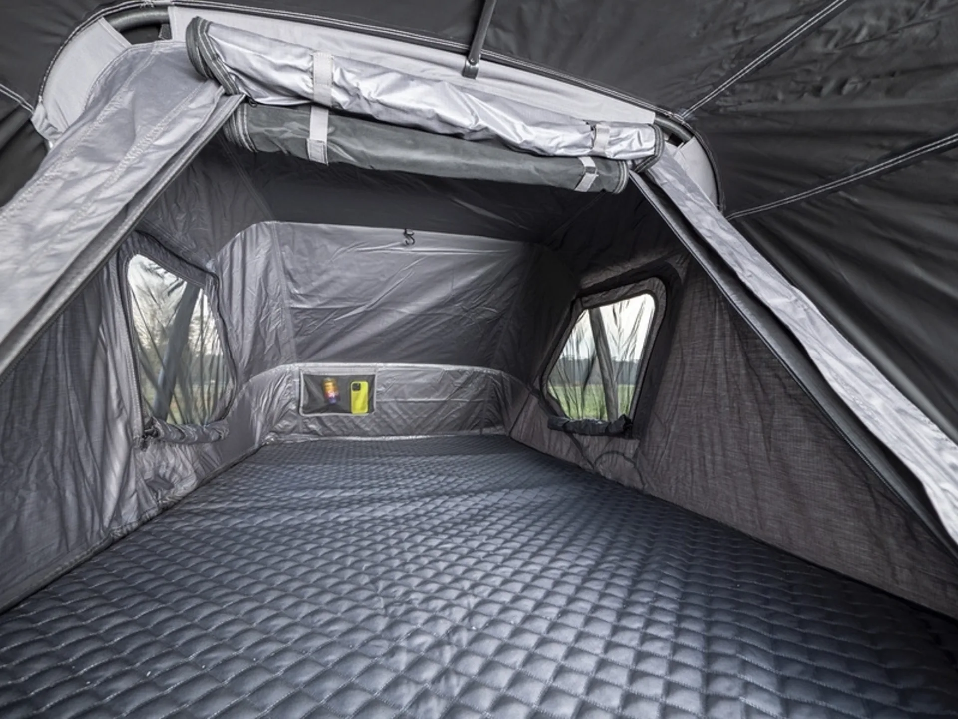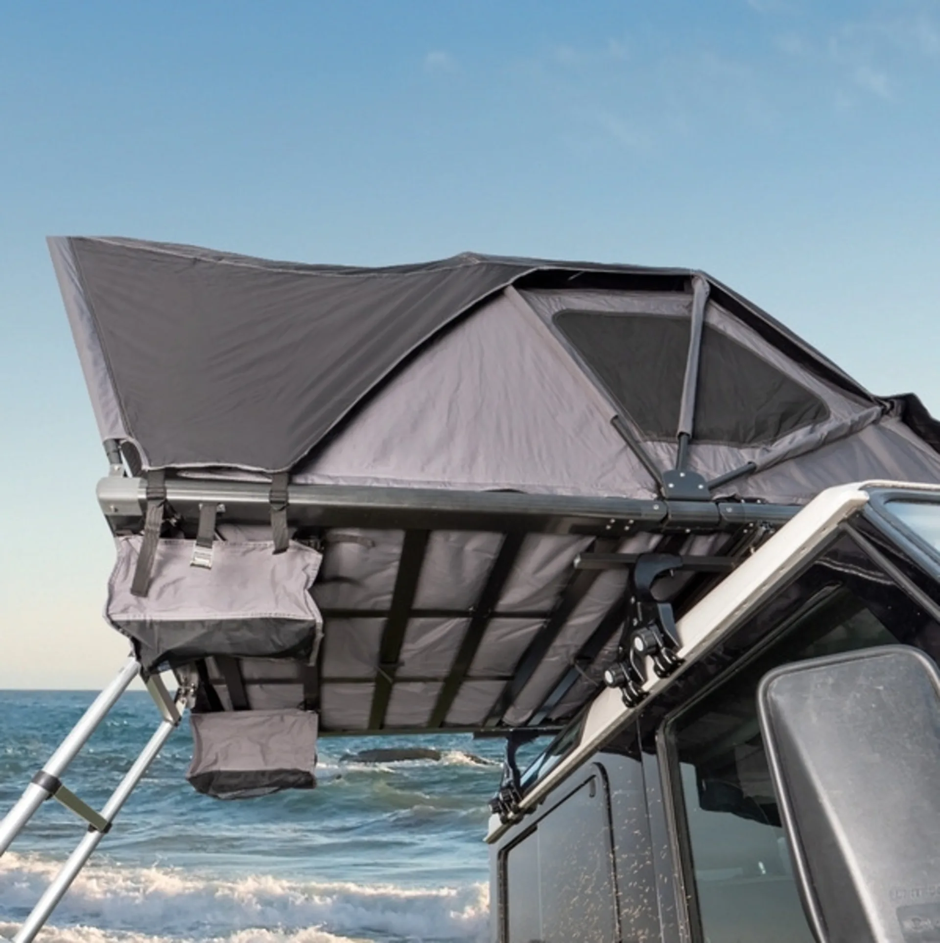 Dachzelt in neuem Design zum manuellen Aufklappen - geeignet für PKW, Van und SUV. Das Dachzelt ist schnell aufgeklappt. Es ist ausgestattet mit Moskitonetzen in allen Öffnungen (3 Seiten), 2 praktischen Schuhtaschen am Eingang außen, einer 7 cm dicken bequemen Matratze und einer Aluminium-Teleskopleiter. Der Unterboden besteht aus einem stabilen Aluminiumrahmen.