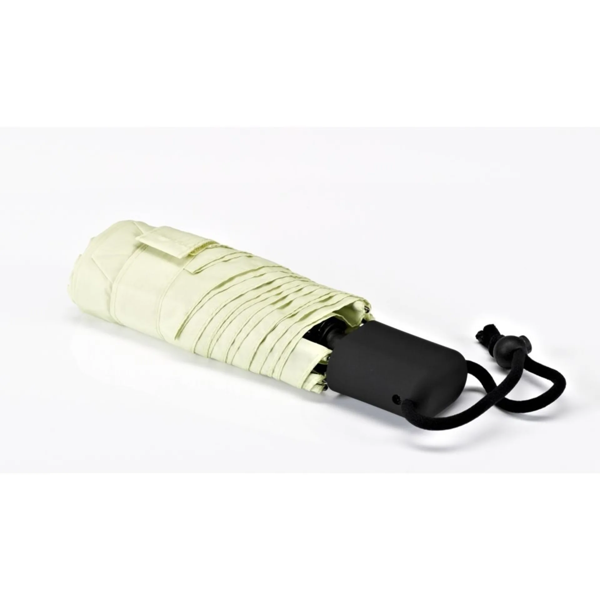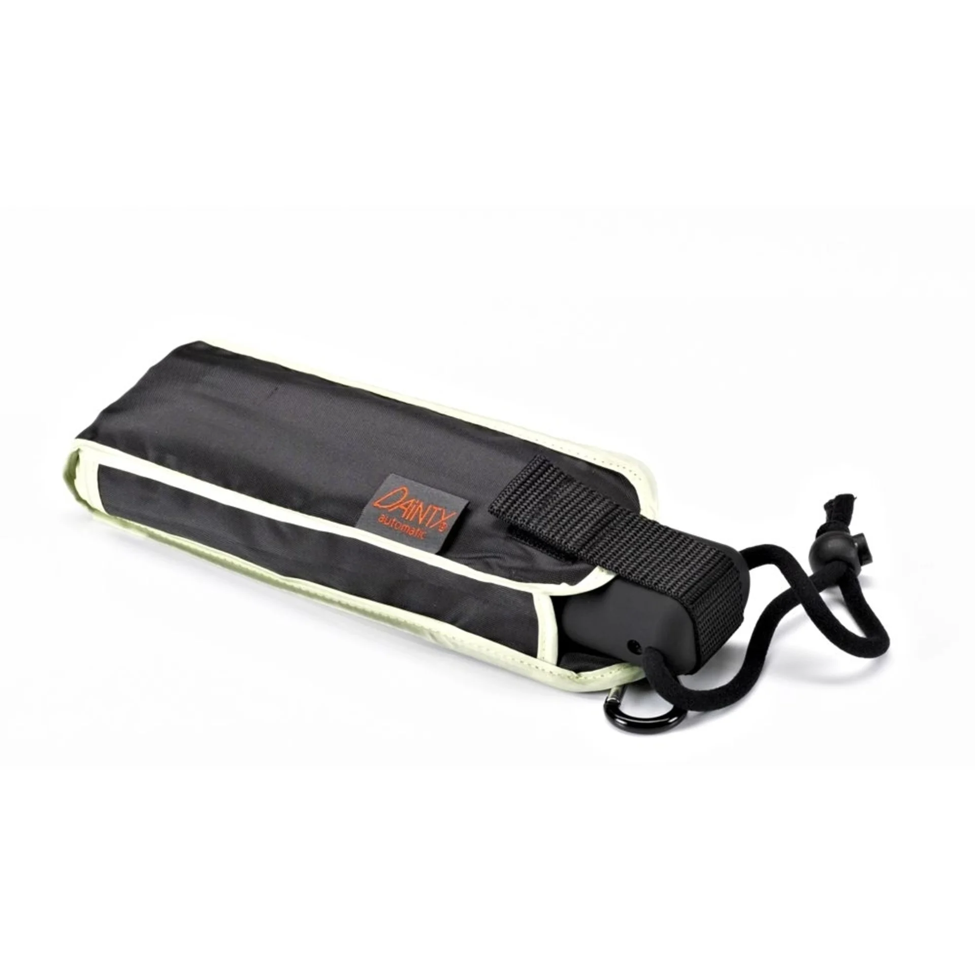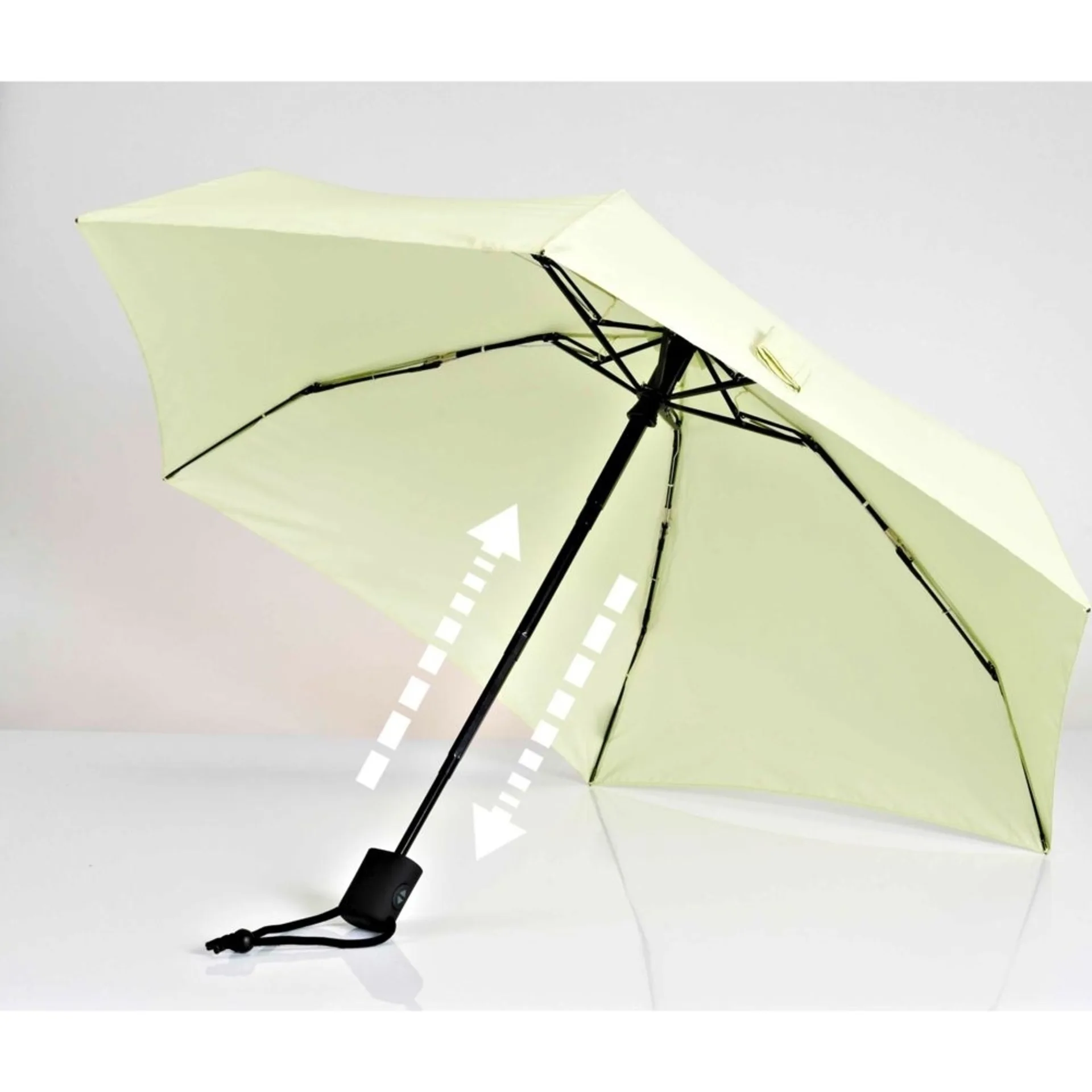 Der Automatik-Schirm überzeugt durch sein extrem kleines und flaches Packmass – geschlossen ist er ca. 22 cm kurz und 3,5 cm flach. Geöffnet überrascht das Wetterdach mit einem Durchmessser von ca. 93 cm.