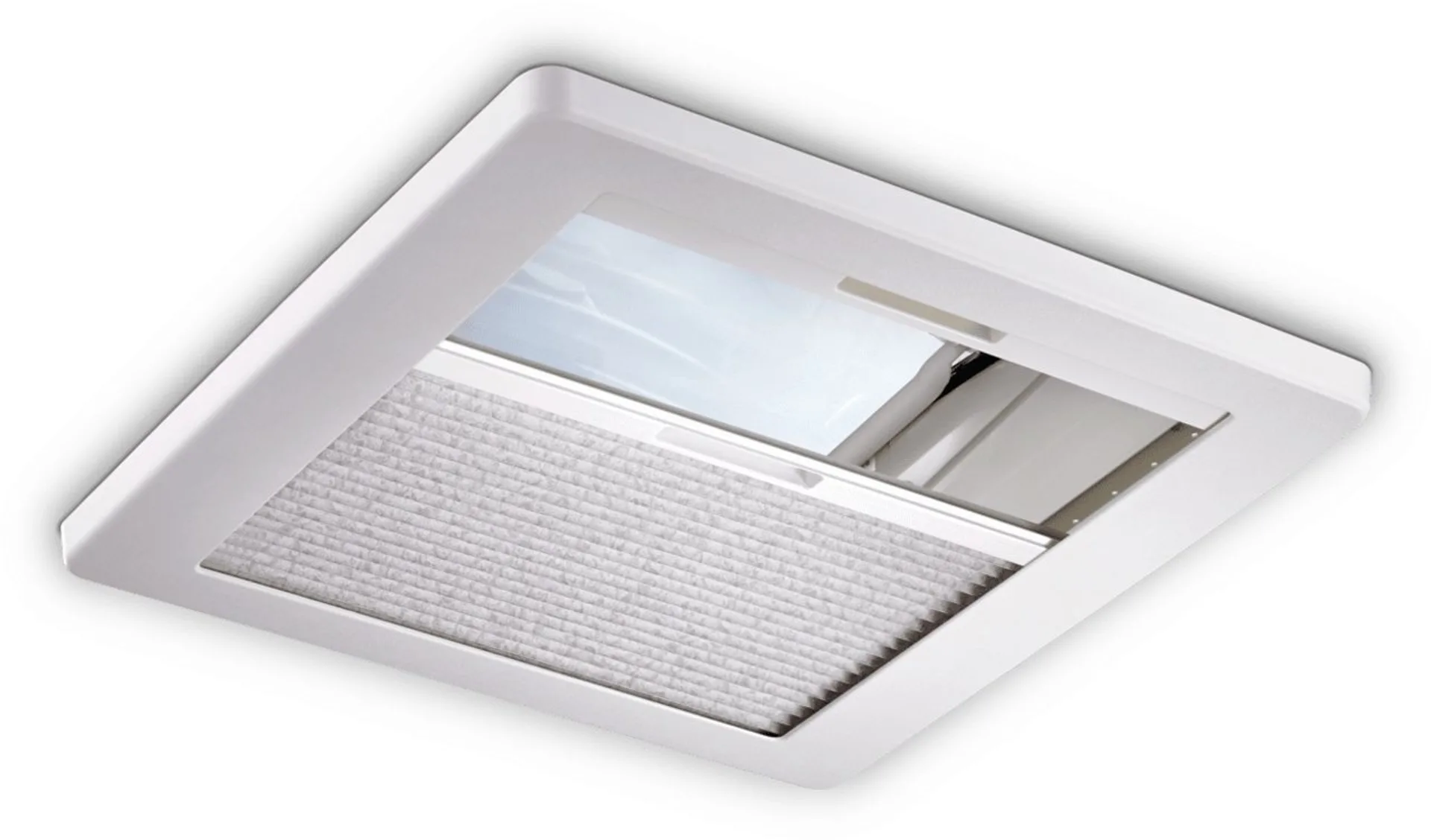 Die Mini Hekis sind mit einer einfach plissierten Verdunkelungsblende und einem Fliegengitter ausgestattet.