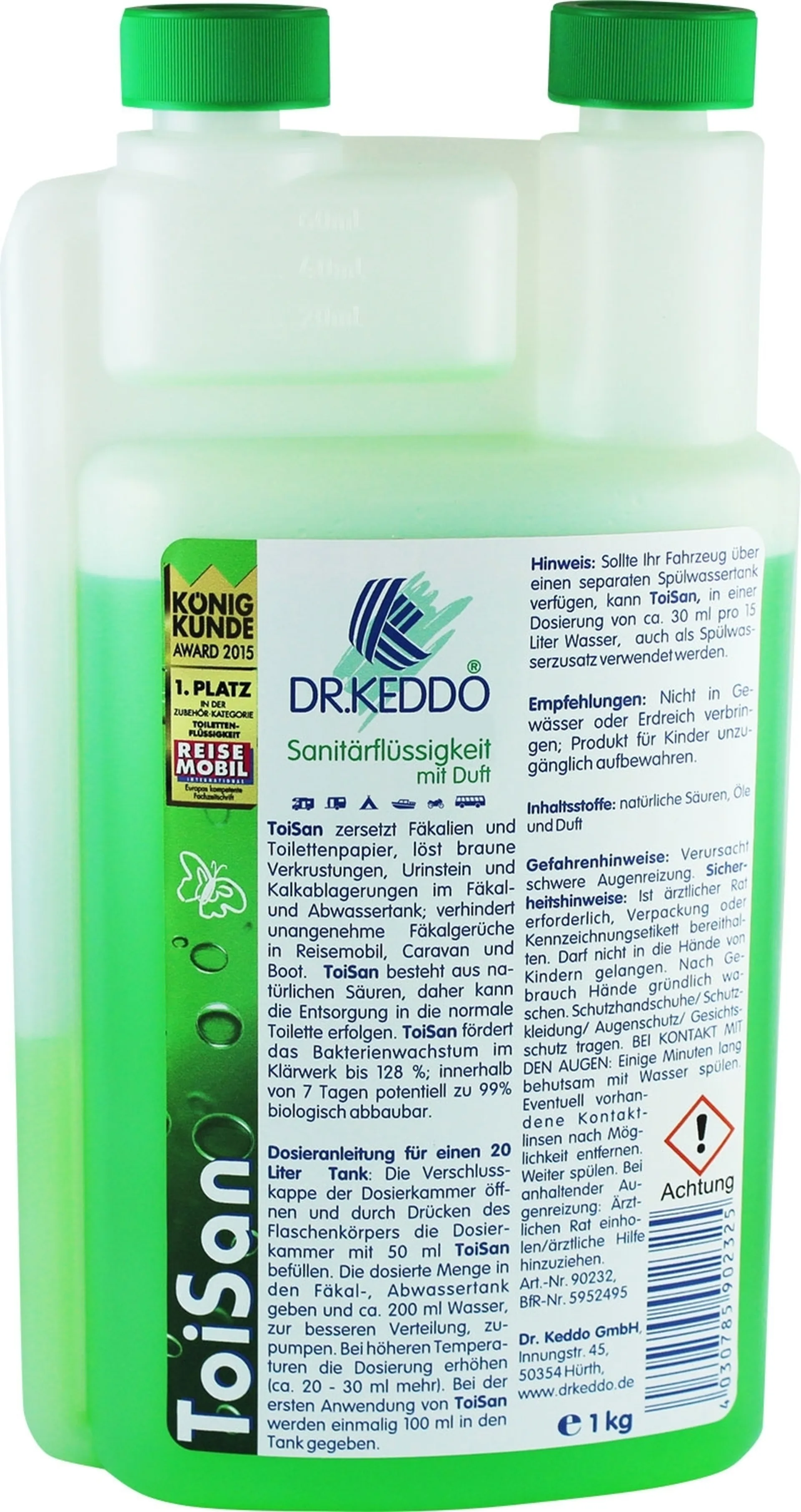 ToiSan ist eine grüne Sanitärflüssigkeit, biologisch abbaubar, verflüssigt Fäkalien und verleiht frischen Duft. Sie löst Kalkablagerungen sowie Urinstein von den Tankwänden und hält diese sauber. Einsetzbar auch zur Geruchsverhinderung im Abwassertank.