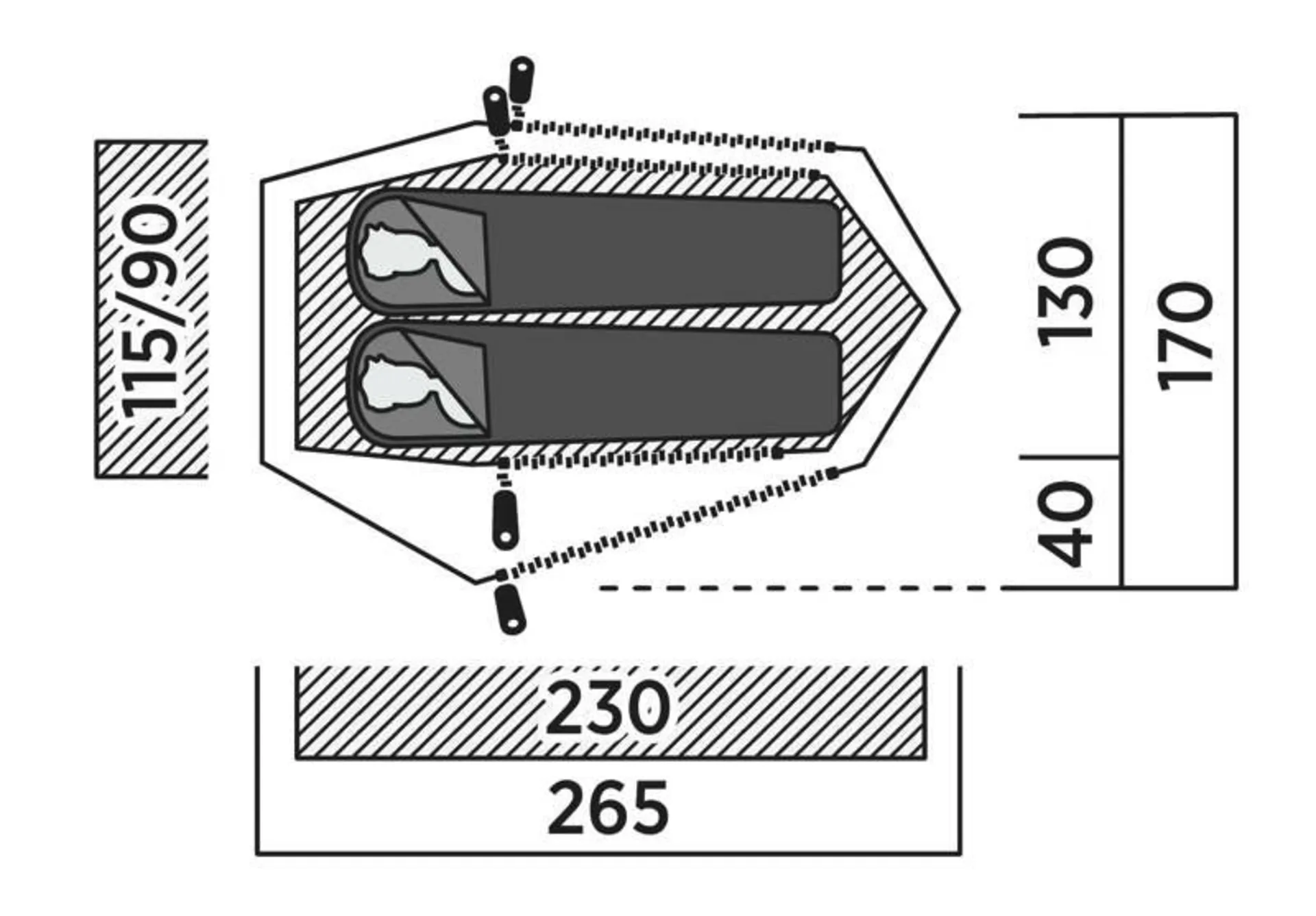 Das Außenzelt besteht aus WeatherGuard 3000 Polyester mit PU-Beschichtung, ist feuerhemmend und frei von per- und polyfluorierten Chemikalien. Mit einer Wassersäule von 3000 mm schützt es zuverlässig vor Regen. Der Boden aus 75D Polyester Taffeta mit einer Wassersäule von 5000 mm hält Feuchtigkeit fern. Das EnduraLight Aluminiumgestänge mit 8,5 mm Durchmesser bietet hohe Stabilität bei geringem Gewicht.
