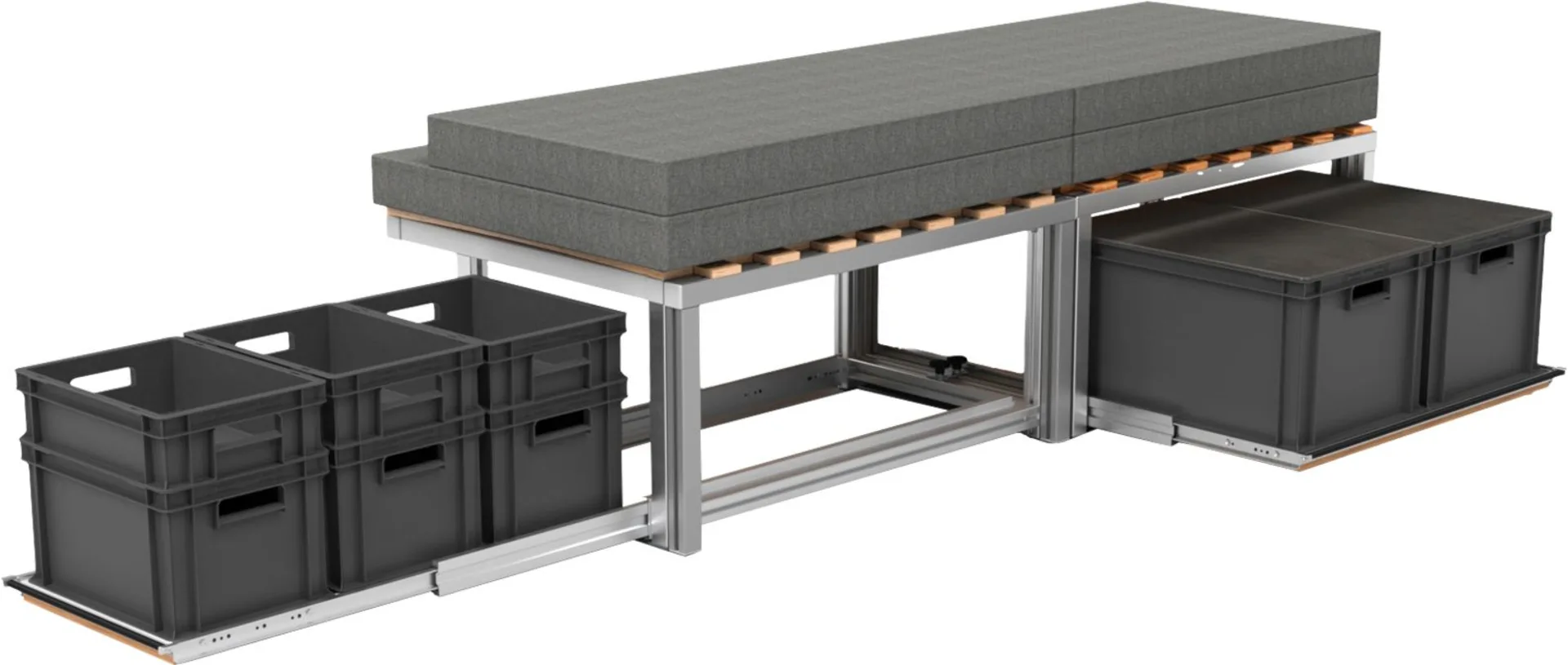 Das vanlife.module BIKE ist eine vielseitige Campingbox für Vans, die einen einfachen Umbau in einen Camper ermöglicht. Neben dem robusten Bettgestell und dem flexiblen Lattenrost kannst du zwischen Ausstattungen von herausziehbaren Auszügen wählen.