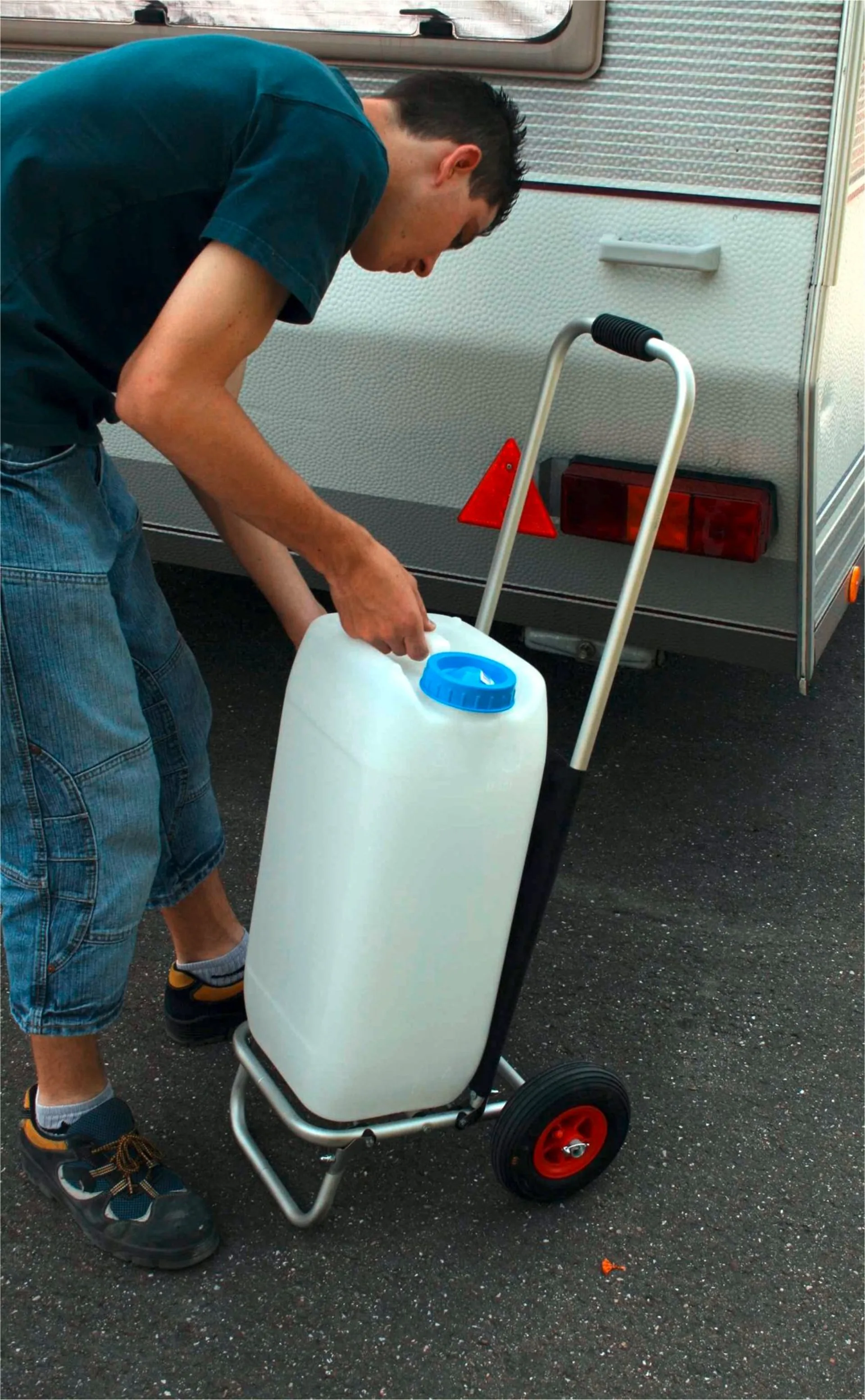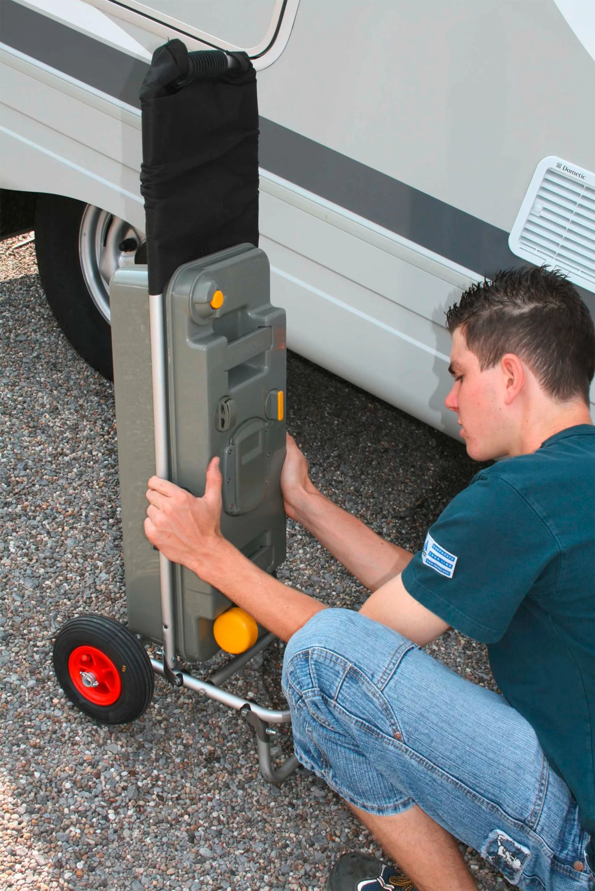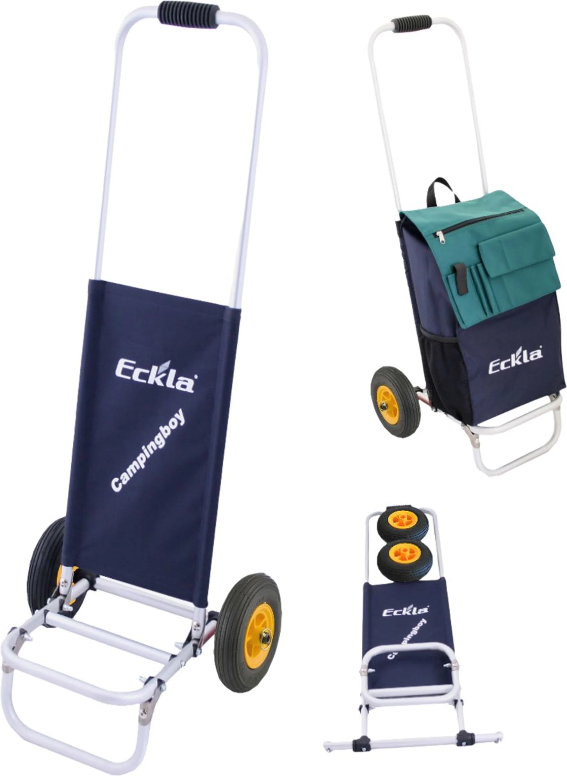 Der ECKLA-CAMPINGBOY wurde speziell für den schweren Campingeinsatz entwickelt. Die Abmessung ist an die dort verwendeten Gasflaschen, Wasserbehältnisse und an die WC Kassetten angepasst. Die Kassetten werden ohne festspannen einfach nur eingelegt genau so die Gasflaschen (11kg Ø 300mm). Es wird für passenden Sitz von Cassette und Gasflasche nur die hintere Bespannung hochgeschoben. Für alle weiteren Transportgüter wie Wasser- und Abwassertanks oder bei der Benutzung als Einkaufswagen bleibt die Bespannung unten.