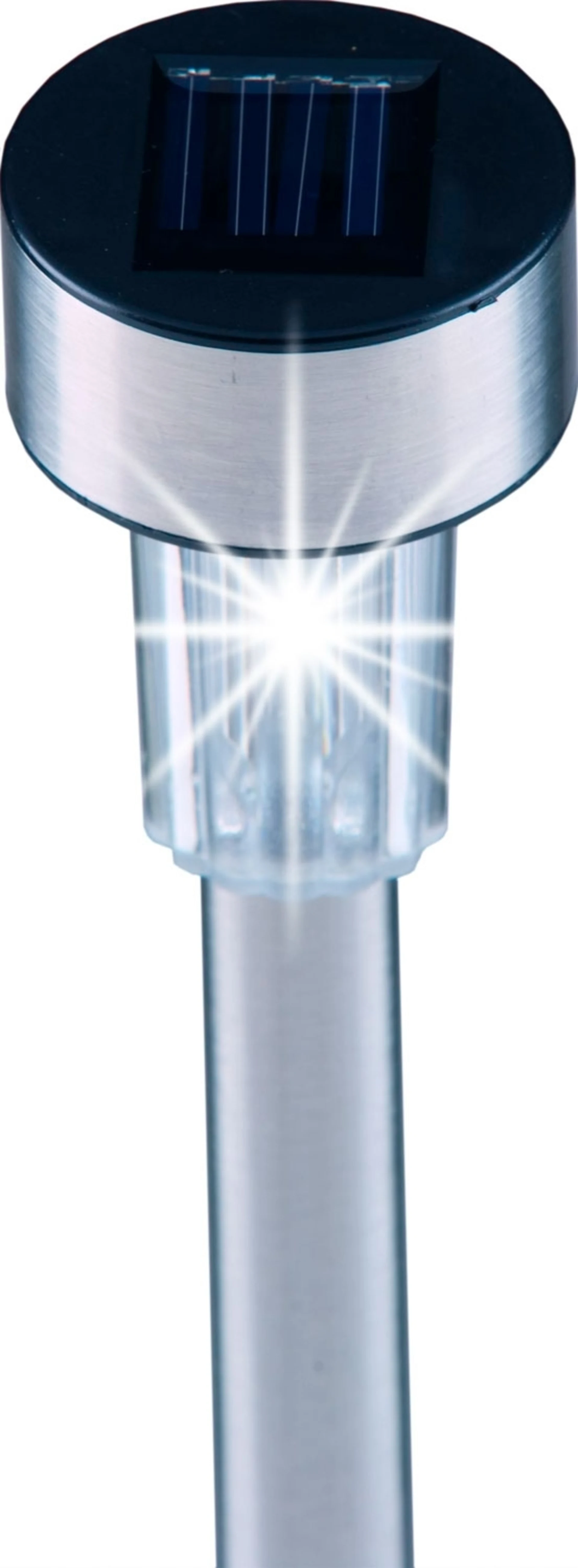 Robuste, wetterfeste Solarleuchte mit Edelstahl Optik. Einschaltautomatik bei Dämmerung.