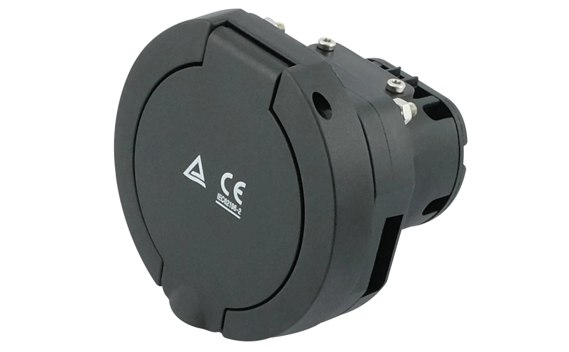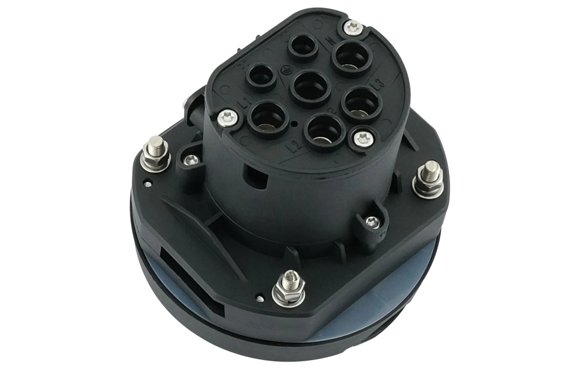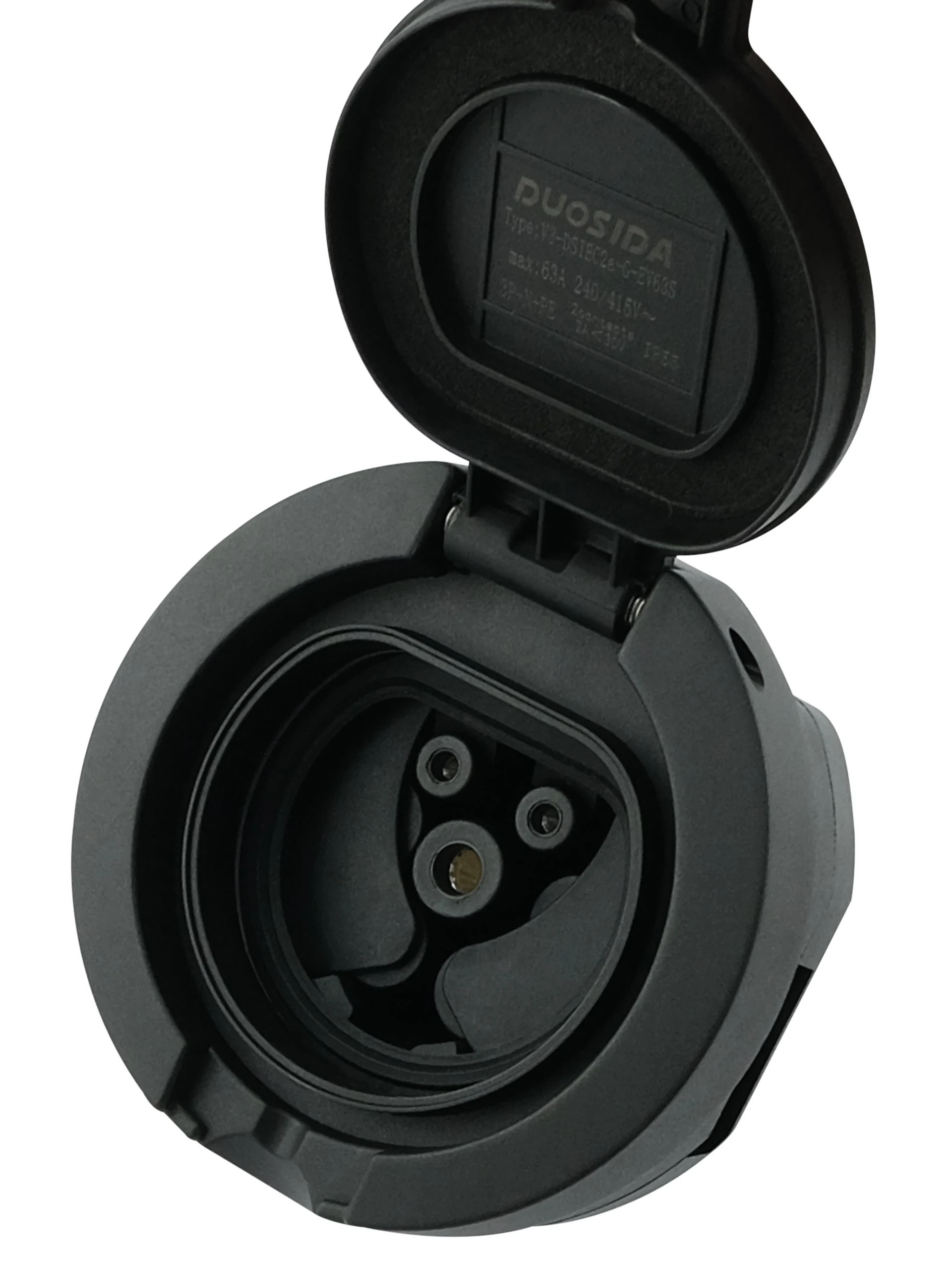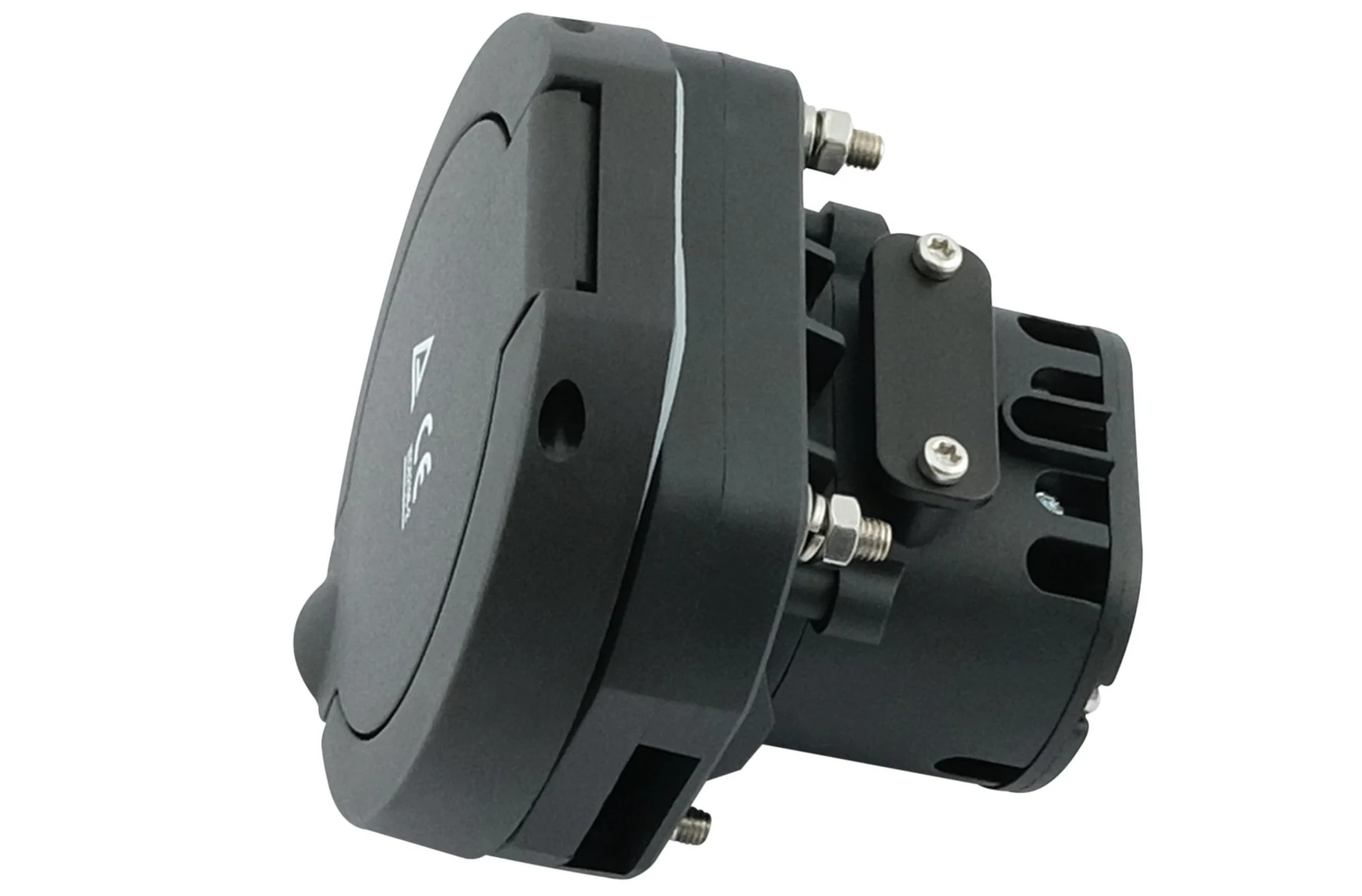 Einbau-Ladesteckdose Typ 2 / 63 A 240/415 VAC Stationsseite, mit Feder-Klappe und Dichtung, ohne mechanische Entriegelung , Montage mittels Schrauben, siehe Datenblatt.