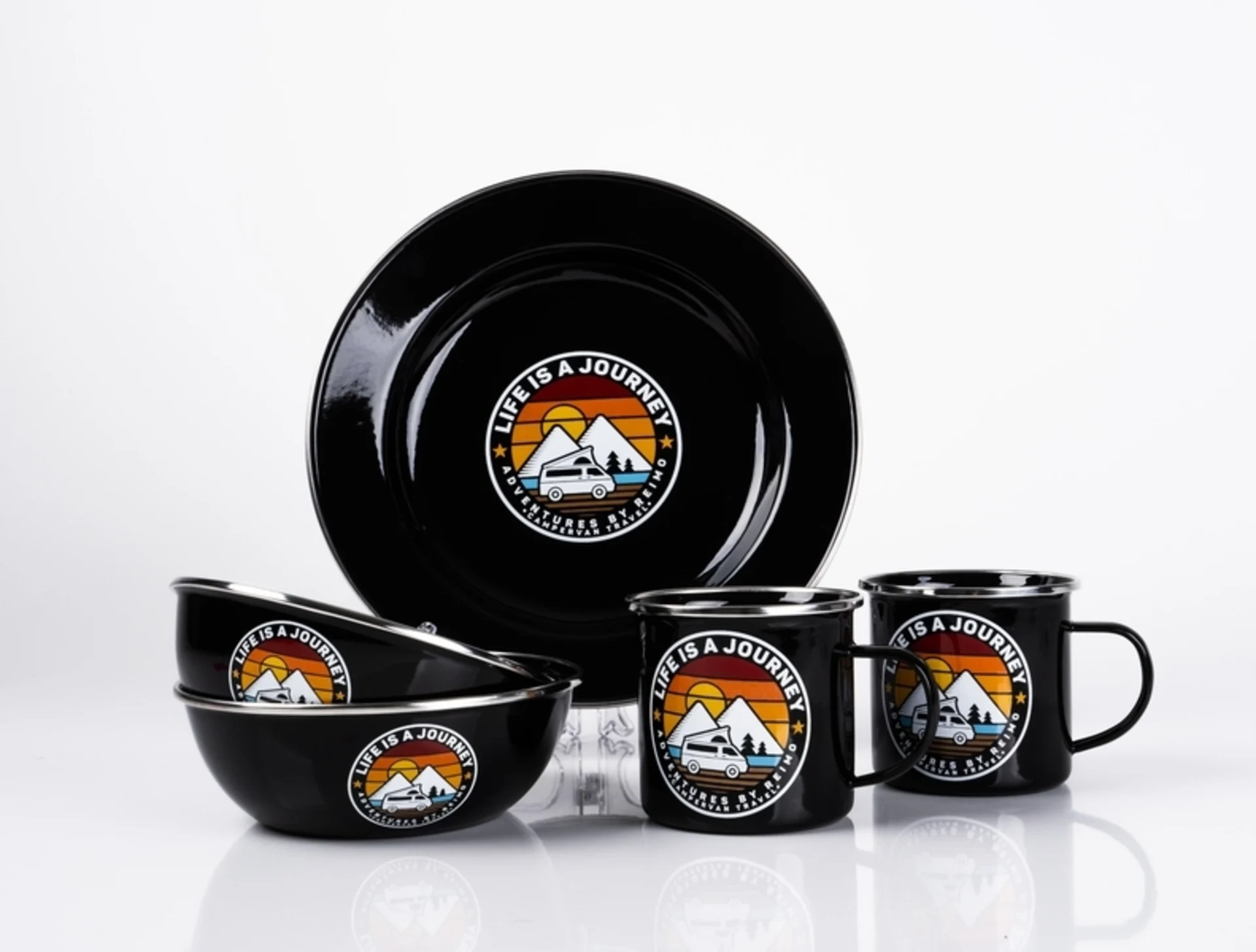 6-teiliges Geschirrset aus hochwertigem Emaille für 2 Personen. Mit farbigem Emblem-Aufdruck. Leicht und bruchresistent.