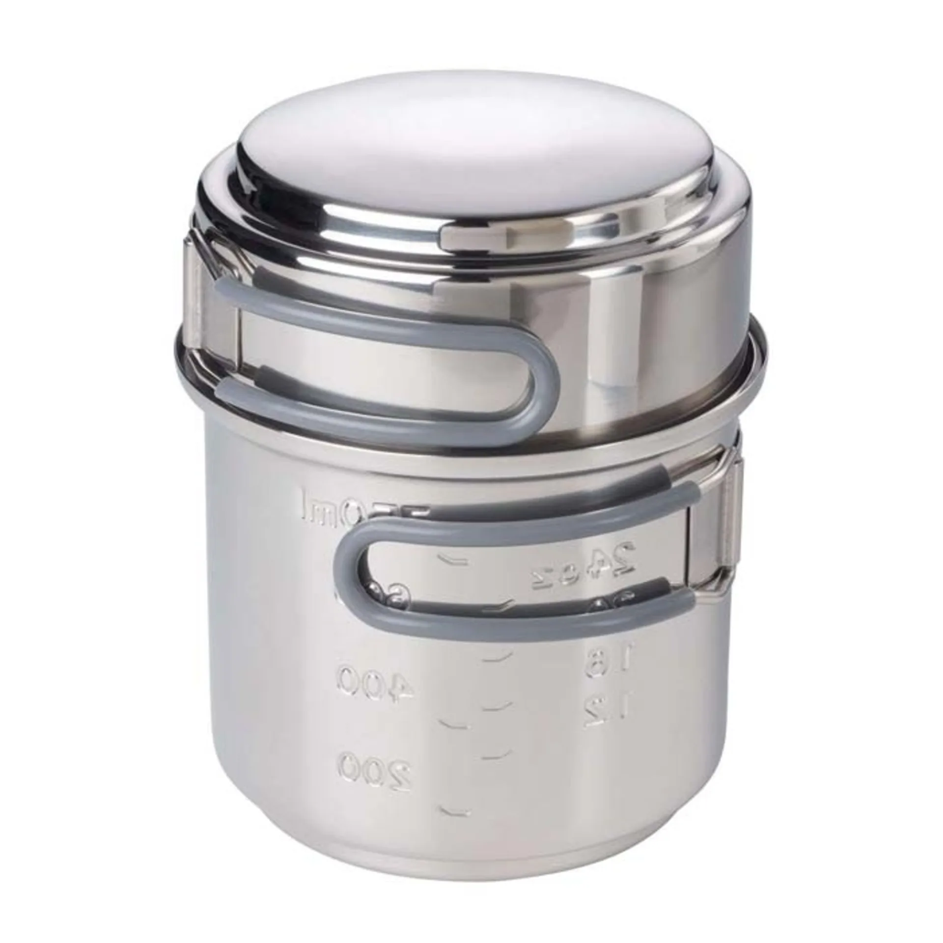 Mit diesem Kochset aus Edelstahl ist die Zubereitung von Mahlzeiten kein Problem. Die Einzelteile sind platzsparend ineinander stapelbar. Während der große Topf zur besseren Handhabung mit einer Volumenanzeige in Unze und Liter ausgestattet ist, bringt der kleinere Topf gleich mehrere Funktionen mit. So können Sie ihn zum einen als separates Kochutensil nutzen, zum anderen aber auch als Deckel für den größeren Topf. Der Regulierer des Brenners ist mit einem Klappgriff zum komfortablen Löschen der Flamme nach dem Kochen ausgestattet.