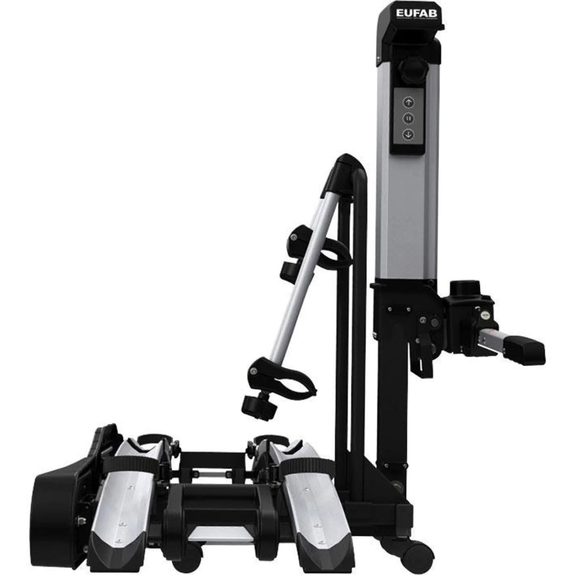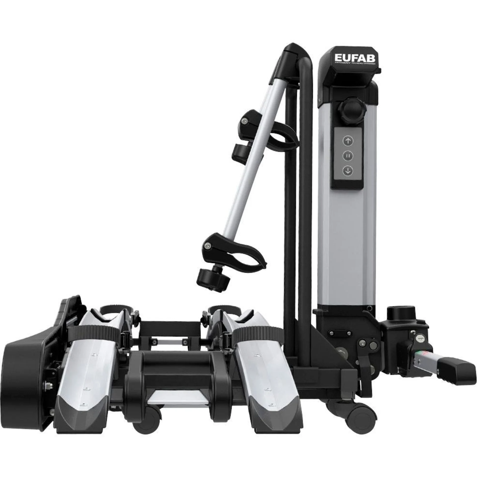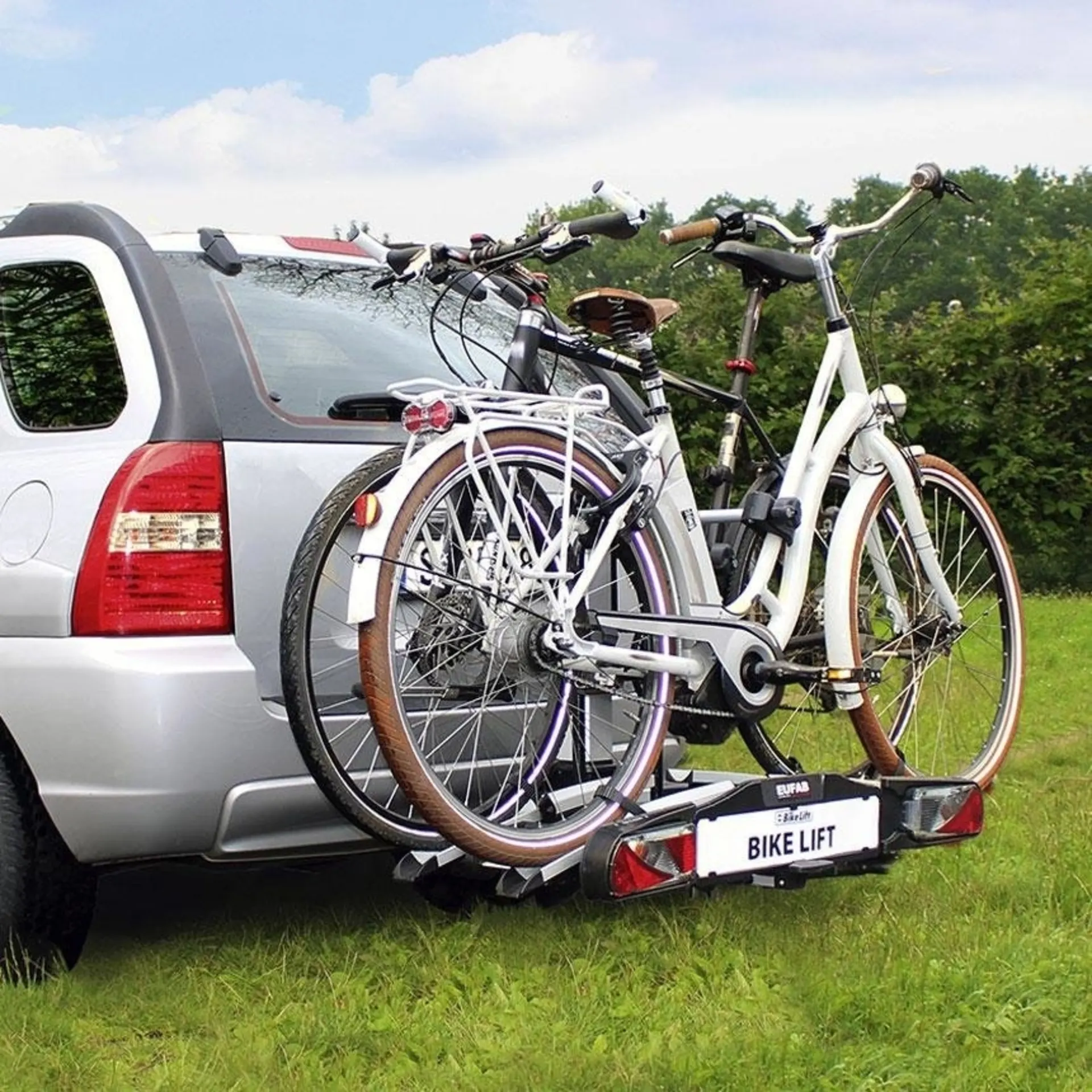 Der Eufab Bike Lift ist ein Anhängerkupplungsträger für bis zu 2 Fahrräder. Der Fahrradträger ist ausgestattet mit einem Schnellverschluss und einem Abklappmechanismus, welcher mit einem Fußpedal bedient wird. Der Abklappmechanismus mit Zusatzsicherung ermöglicht in der Regel das Öffnen des Kofferraums auch mit montierten Fahrrädern. Die Fahrräder werden sicher befestigt mit Hilfe von abnehm- und abschließbaren Rahmenhaltern und Spanngurten mit Ratschen.